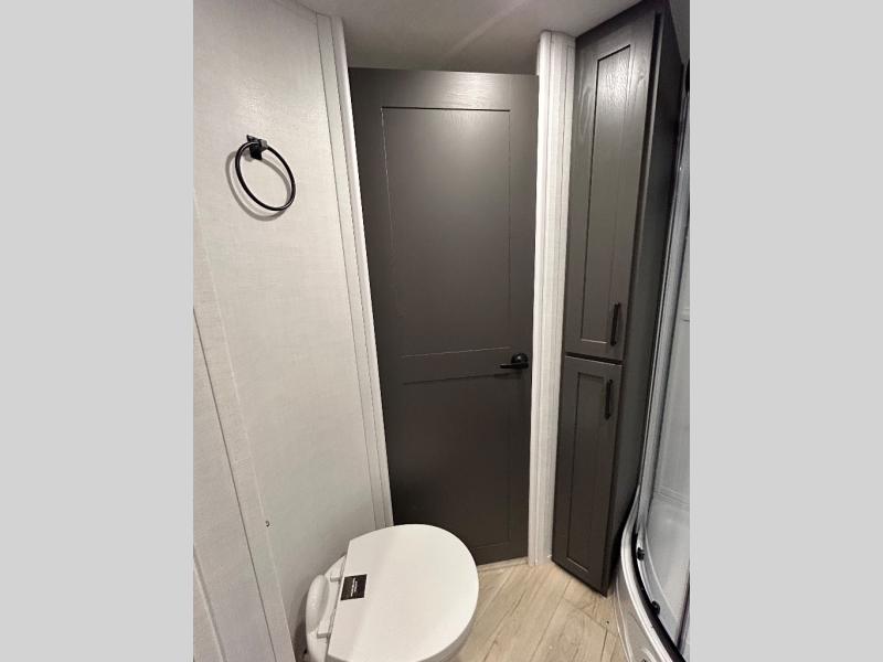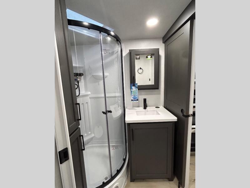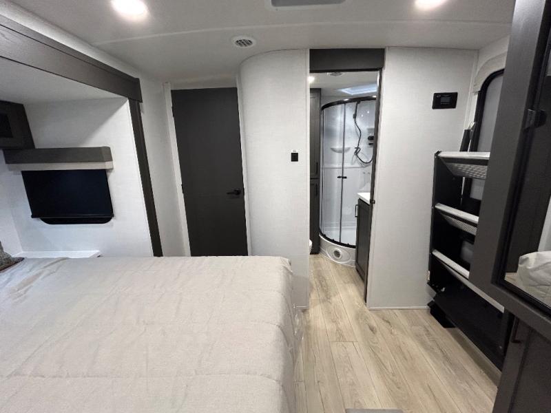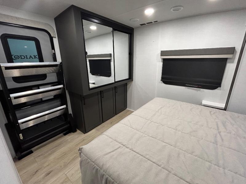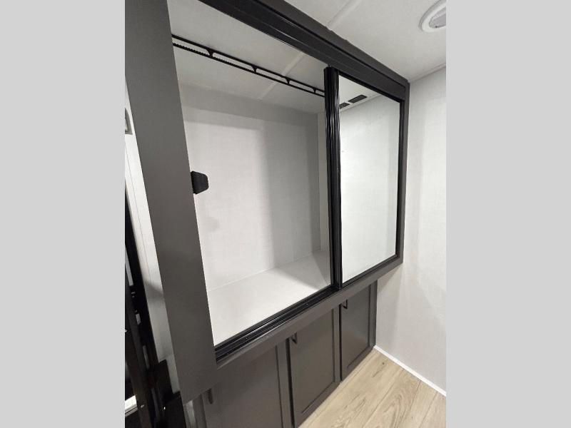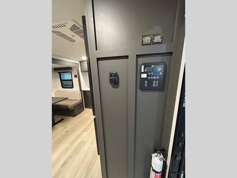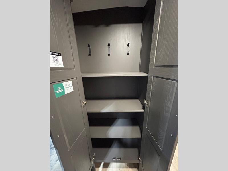 When you are outside this trailer you can enjoy the protection from the 21' power awning, you will also find exterior storage for your extra gear, and a ladder at the rear. You get to choose which entrance to step up into, be it the spacious rear bedroom with a queen bed slide and a wardrobe, or the main entry into the kitchen and living area. The furniture slide includes a booth dinette to eat your meals at, and theater seating to watch the Smart TV with a fireplace below. And the cook will love the front kitchen with extra counter space, a three-burner range, plus a 12V refrigerator and pantry for food storage!
