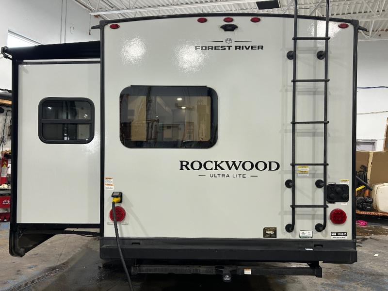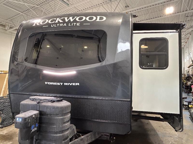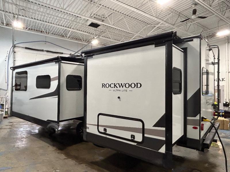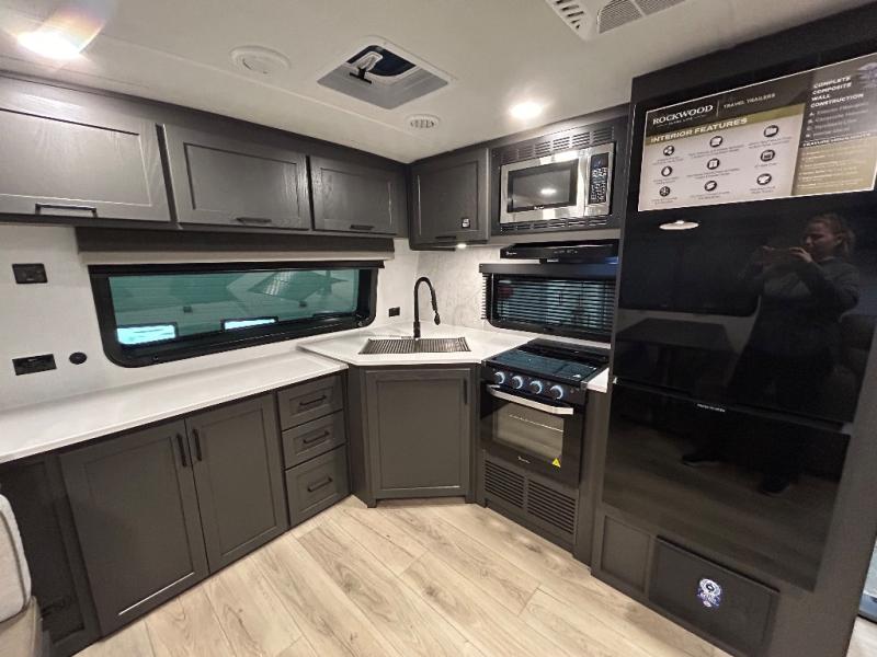 Each Rockwood Ultra Lite travel trailer by Forest River includes superior construction with a high gloss fiberglass cap, aluminum cage construction, and a power awning with LED lighting for a cozy and functional outdoor space. The torsion axle, power tongue jack will make towing smooth and hassle-free, along with the nitrogen filled, Goodyear Endurance tires and the tire pressure monitor system. Interior comforts include kitchen sink with high rise faucet, hidden hinge cabinet doors, and roller shades to name a few. Choose a Rockwood Ultra Lite travel trailer today!
