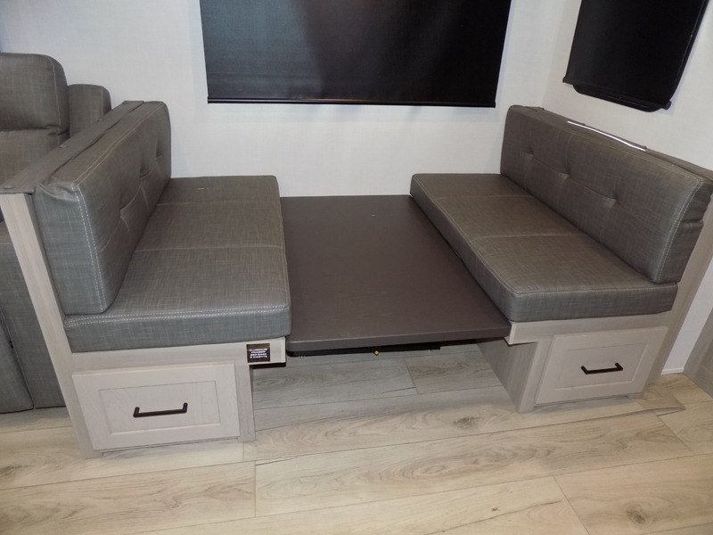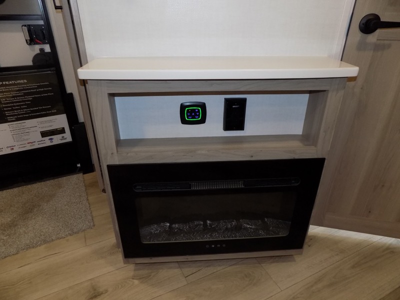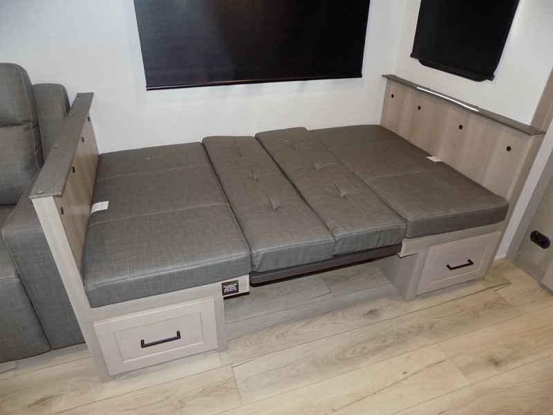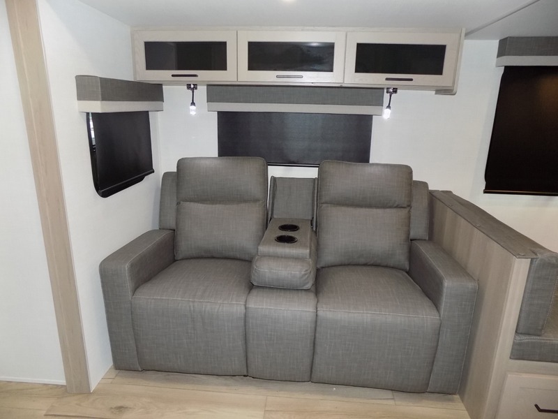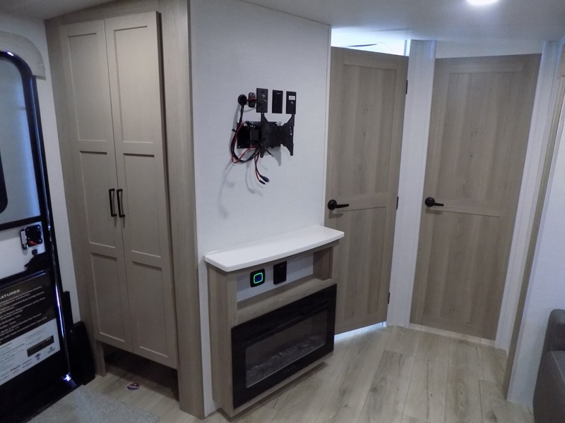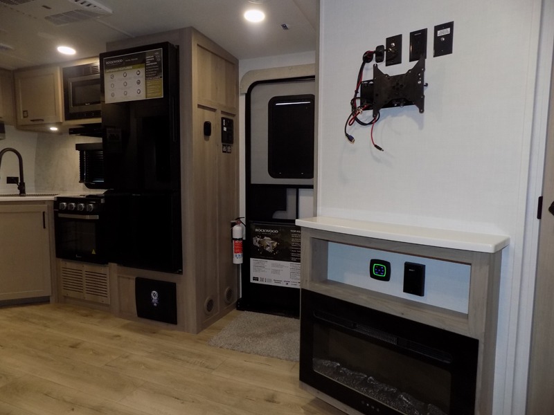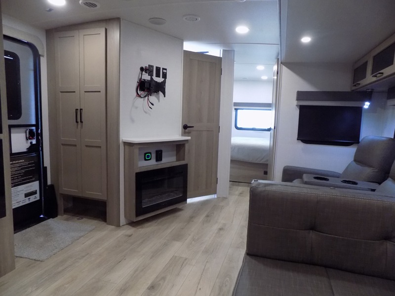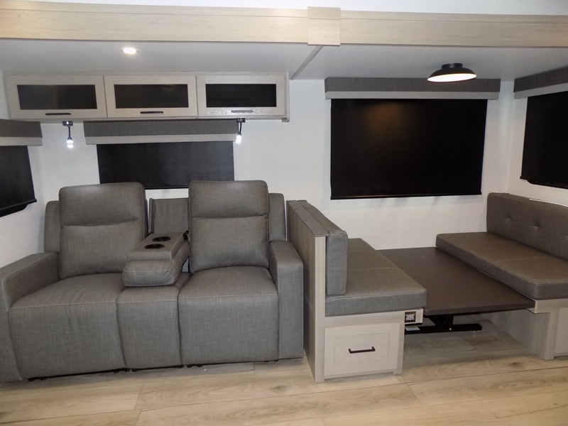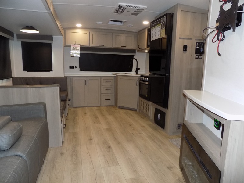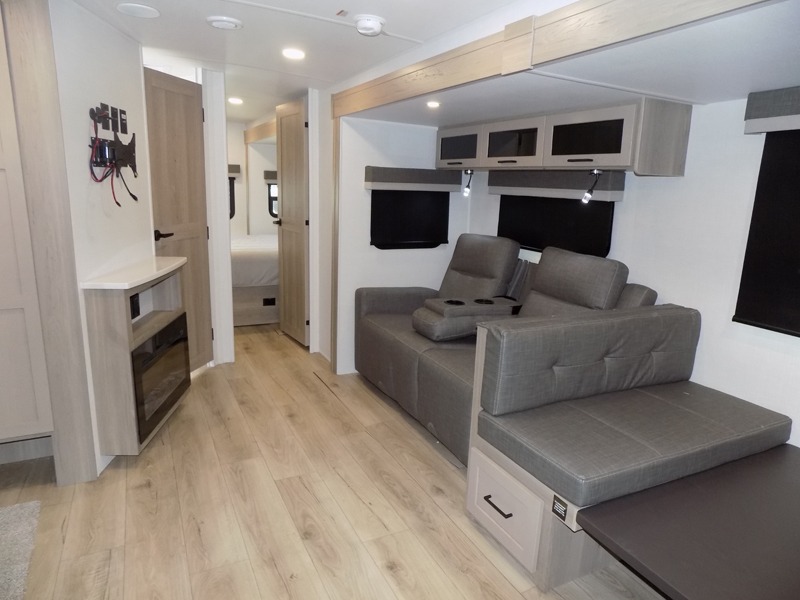 When you are outside this trailer you can enjoy the protection from the 21' power awning, you will also find exterior storage for your extra gear, and a ladder at the rear. You get to choose which entrance to step up into, be it the spacious rear bedroom with a queen bed slide and a wardrobe, or the main entry into the kitchen and living area. The furniture slide includes a booth dinette to eat your meals at, and theater seating to watch the Smart TV with a fireplace below. And the cook will love the front kitchen with extra counter space, a three-burner range, plus a 12V refrigerator and pantry for food storage!
