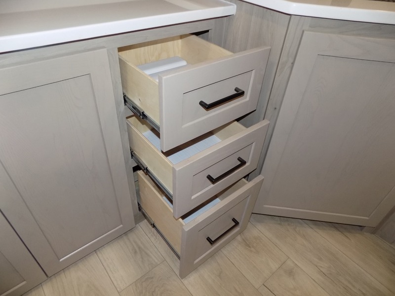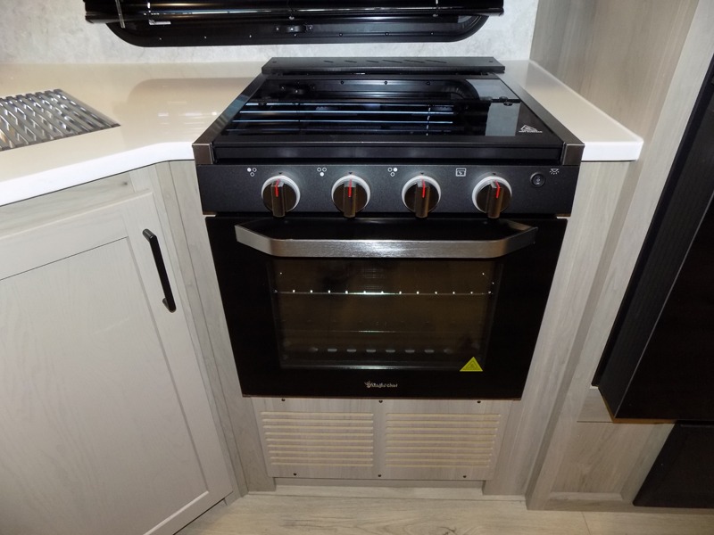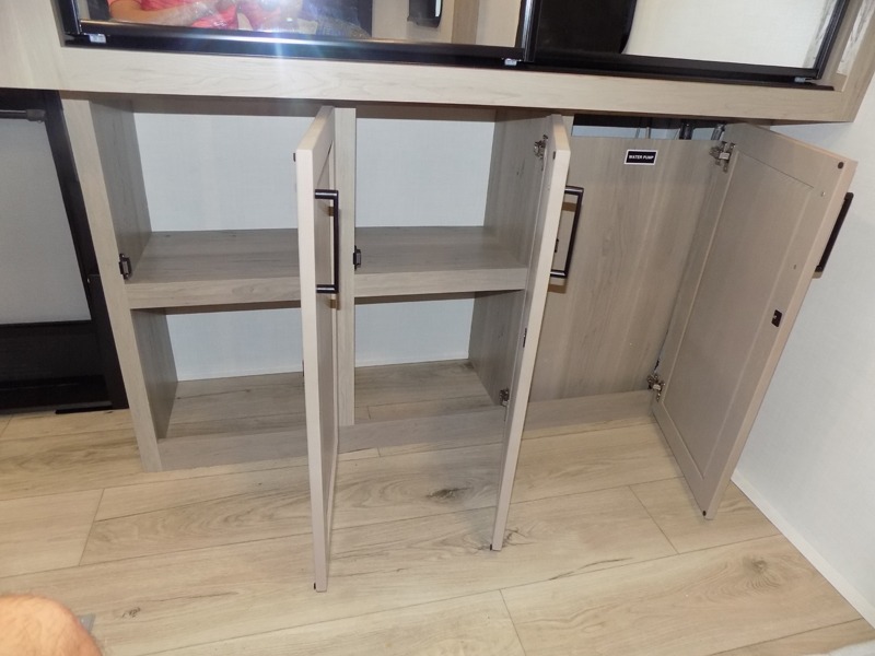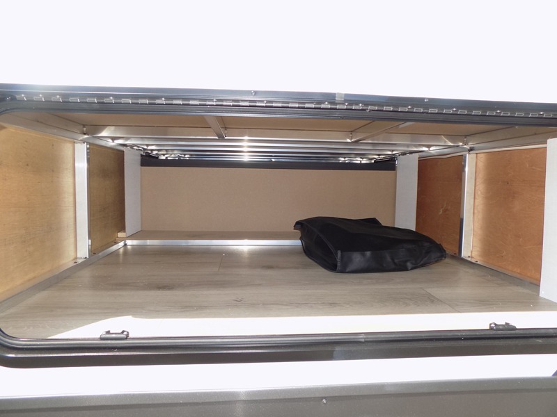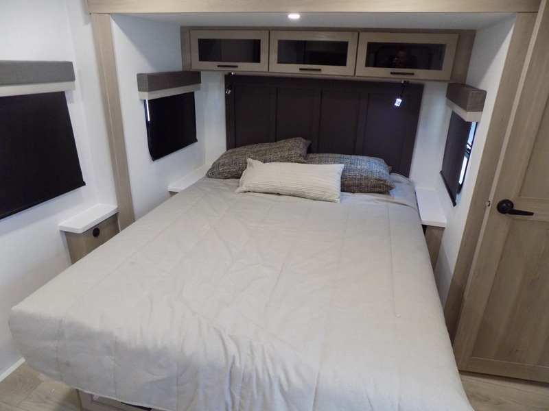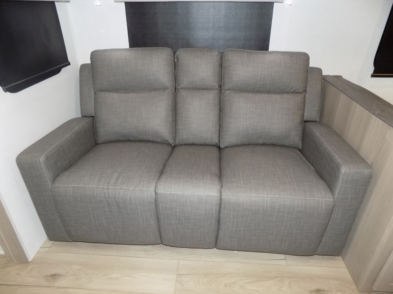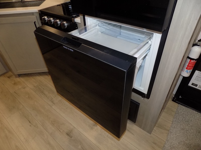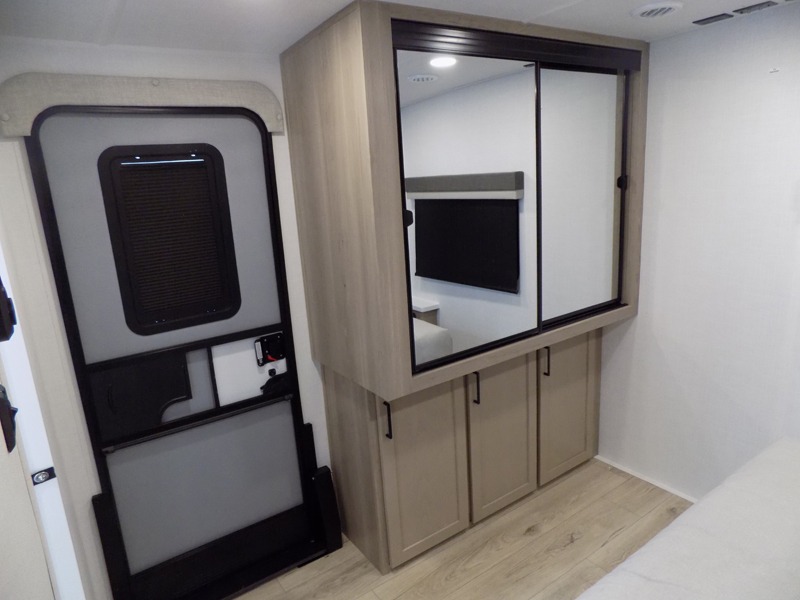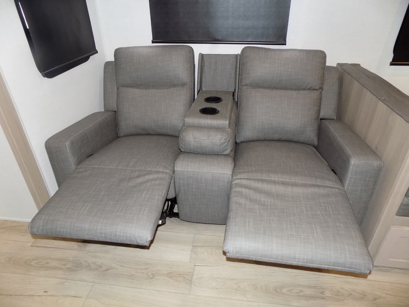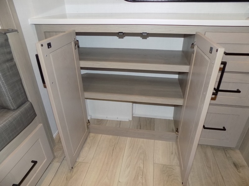 When you are outside this trailer you can enjoy the protection from the 21' power awning, you will also find exterior storage for your extra gear, and a ladder at the rear. You get to choose which entrance to step up into, be it the spacious rear bedroom with a queen bed slide and a wardrobe, or the main entry into the kitchen and living area. The furniture slide includes a booth dinette to eat your meals at, and theater seating to watch the Smart TV with a fireplace below. And the cook will love the front kitchen with extra counter space, a three-burner range, plus a 12V refrigerator and pantry for food storage!