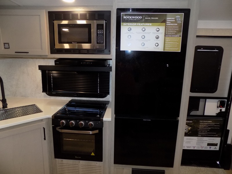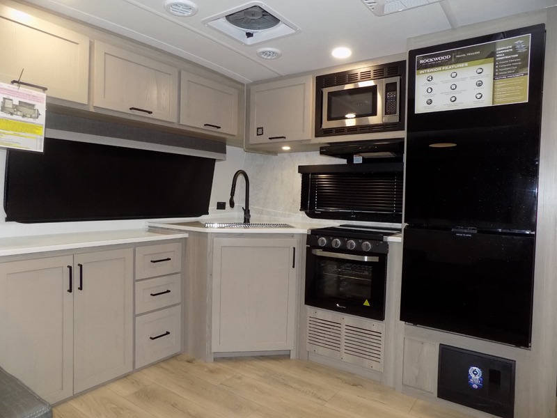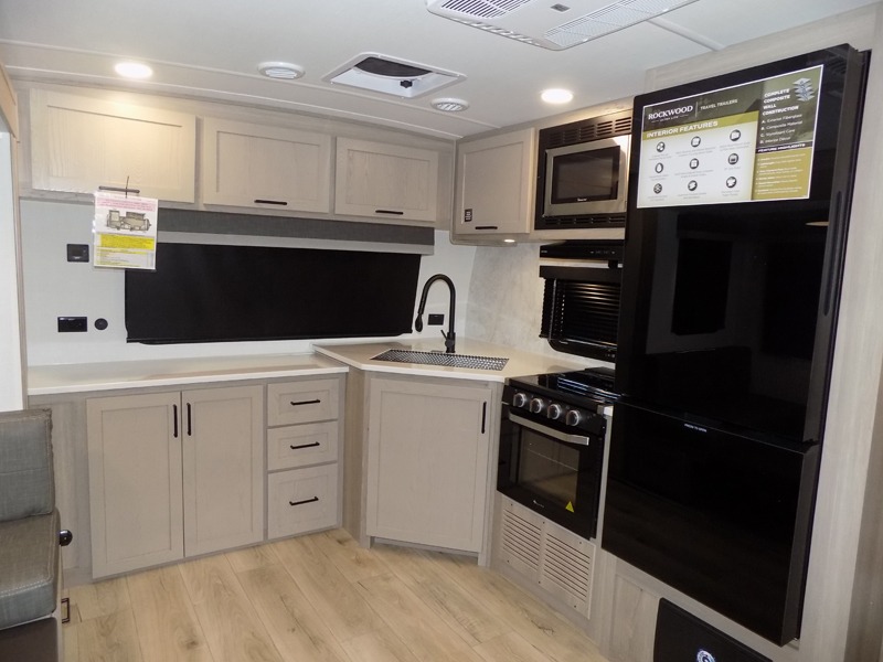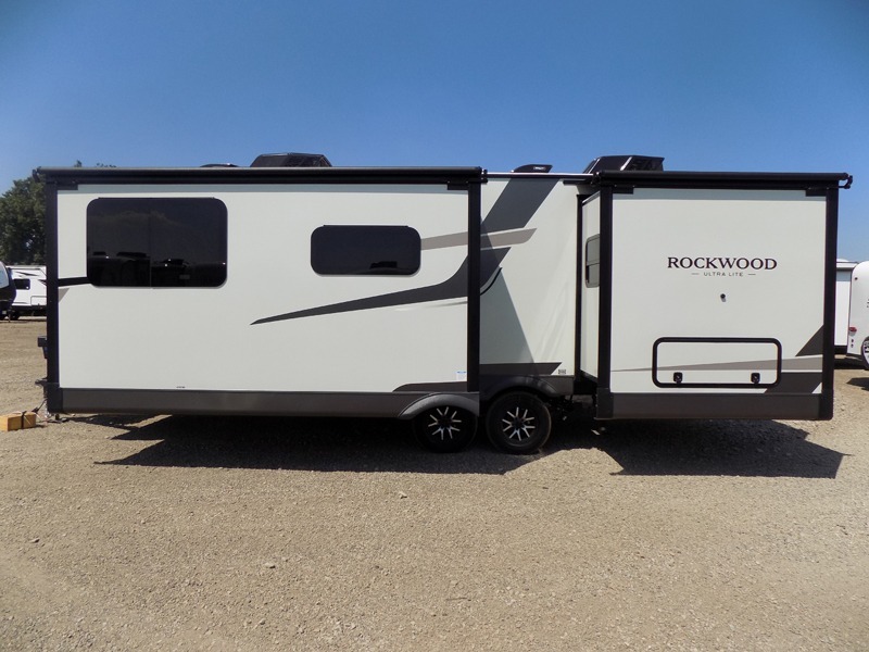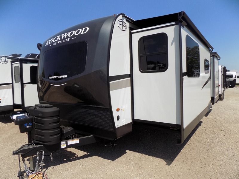 Each Rockwood Ultra Lite travel trailer by Forest River includes superior construction with a high gloss fiberglass cap, aluminum cage construction, and a power awning with LED lighting for a cozy and functional outdoor space. The torsion axle, power tongue jack will make towing smooth and hassle-free, along with the nitrogen filled, Goodyear Endurance tires and the tire pressure monitor system. Interior comforts include kitchen sink with high rise faucet, hidden hinge cabinet doors, and roller shades to name a few. Choose a Rockwood Ultra Lite travel trailer today!