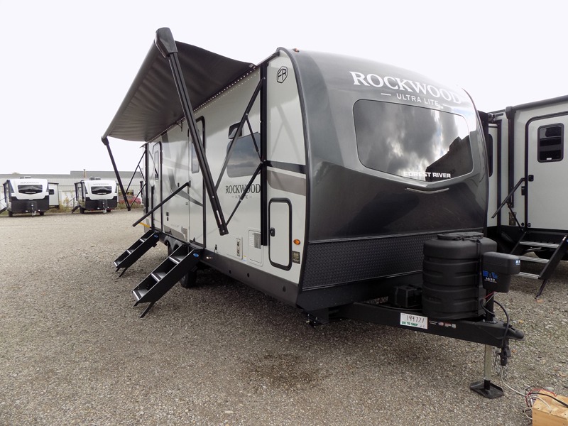 Each Rockwood Ultra Lite travel trailer by Forest River includes superior construction with a high gloss fiberglass cap, aluminum cage construction, and a power awning with LED lighting for a cozy and functional outdoor space. The torsion axle, power tongue jack will make towing smooth and hassle-free, along with the nitrogen filled, Goodyear Endurance tires and the tire pressure monitor system. Interior comforts include kitchen sink with high rise faucet, hidden hinge cabinet doors, and roller shades to name a few. Choose a Rockwood Ultra Lite travel trailer today!