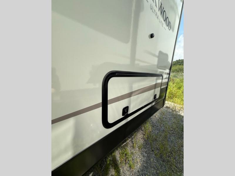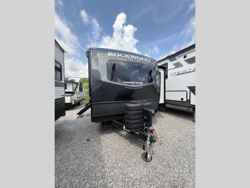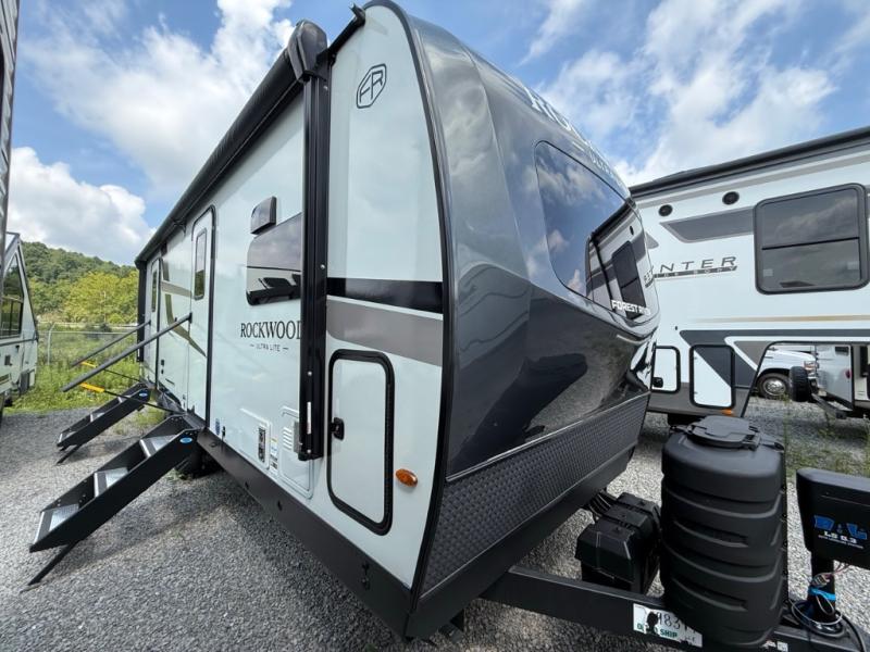 Each Rockwood Ultra Lite travel trailer by Forest River includes superior construction with a high gloss fiberglass cap, aluminum cage construction, and a power awning with LED lighting for a cozy and functional outdoor space. The torsion axle, power tongue jack will make towing smooth and hassle-free, along with the nitrogen filled, Goodyear Endurance tires and the tire pressure monitor system. Interior comforts include kitchen sink with high rise faucet, hidden hinge cabinet doors, and roller shades to name a few. Choose a Rockwood Ultra Lite travel trailer today!