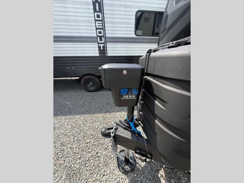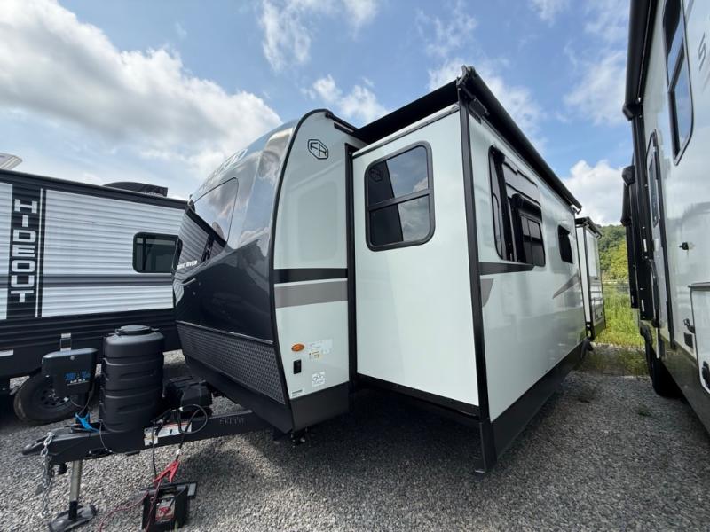 When you are outside this trailer you can enjoy the protection from the 21' power awning, you will also find exterior storage for your extra gear, and a ladder at the rear. You get to choose which entrance to step up into, be it the spacious rear bedroom with a queen bed slide and a wardrobe, or the main entry into the kitchen and living area. The furniture slide includes a booth dinette to eat your meals at, and theater seating to watch the Smart TV with a fireplace below. And the cook will love the front kitchen with extra counter space, a three-burner range, plus a 12V refrigerator and pantry for food storage!