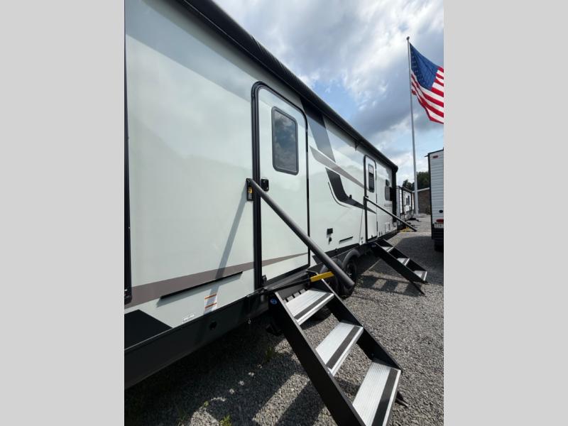 When you are outside this trailer you can enjoy the protection from the 21' power awning, you will also find exterior storage for your extra gear, and a ladder at the rear. You get to choose which entrance to step up into, be it the spacious rear bedroom with a queen bed slide and a wardrobe, or the main entry into the kitchen and living area. The furniture slide includes a booth dinette to eat your meals at, and theater seating to watch the Smart TV with a fireplace below. And the cook will love the front kitchen with extra counter space, a three-burner range, plus a 12V refrigerator and pantry for food storage!