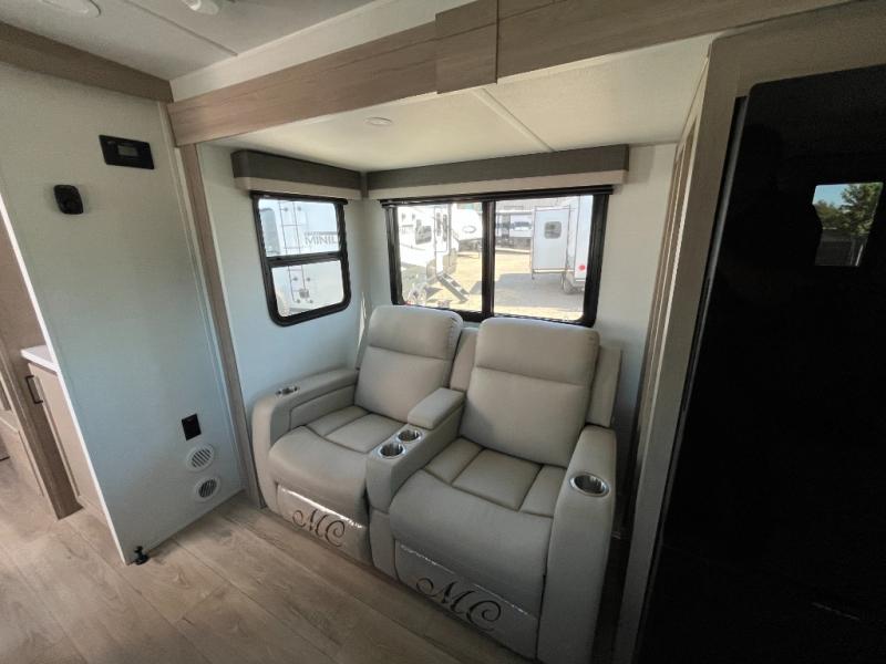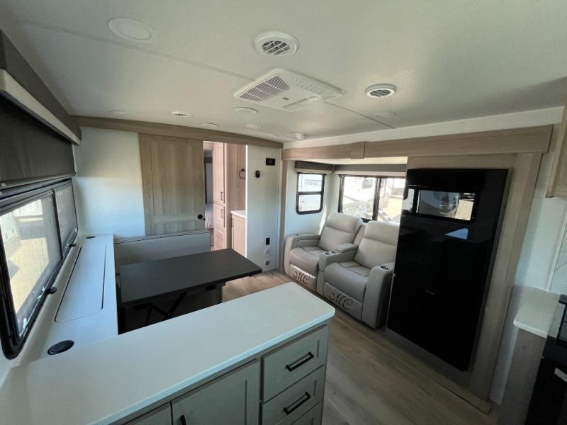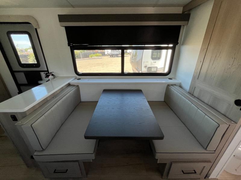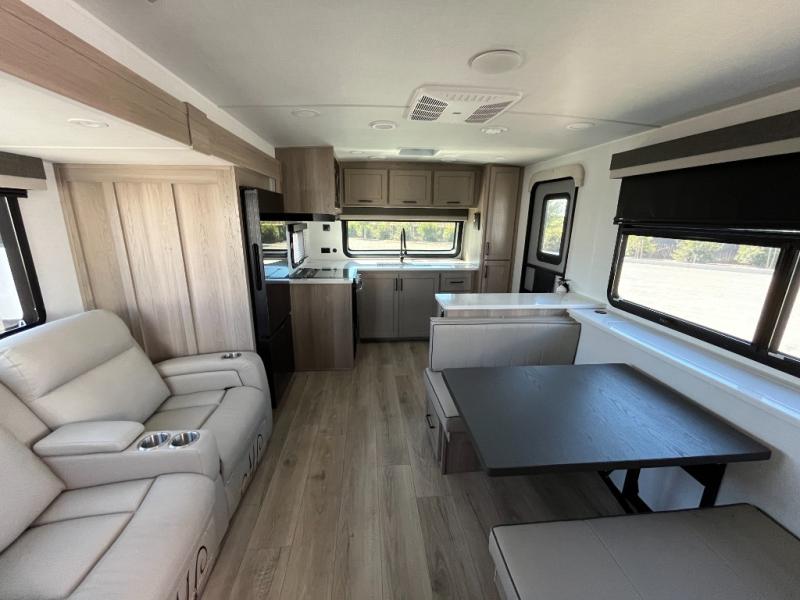Wherever you decide to camp, you can be sure to enjoy your time in this double slide out trailer! The chef of your group will love having a front kitchen with generous counter space plus an exterior griddle when the weather is nice. There is also a 21' awning outdoors, along with Solid Entry Steps, and dual entry doors! A 39" booth dinette provides a place to dine or play a card game after dinner, and the theater seat across from the 40" TV is perfect for movie night. The walk-thru bath leads to the rear master bedroom where you'll find a queen bed, a large wardrobe, and a TV option if you enjoy shows in bed!