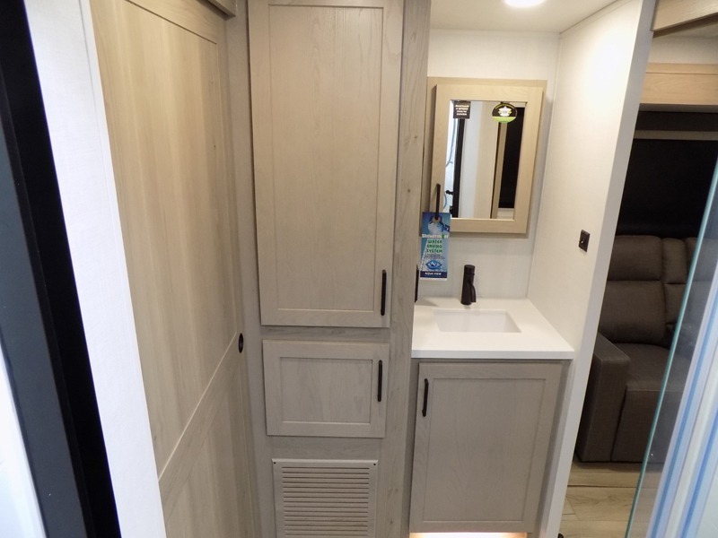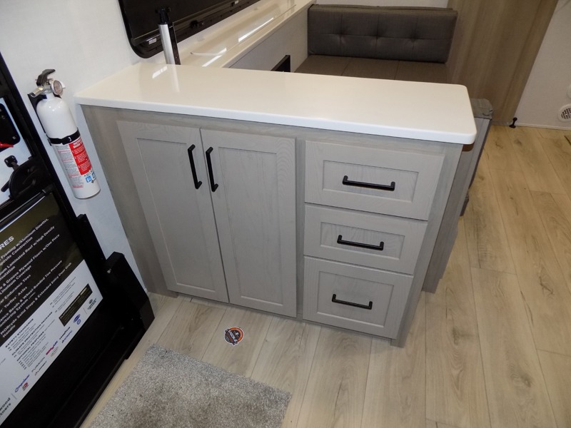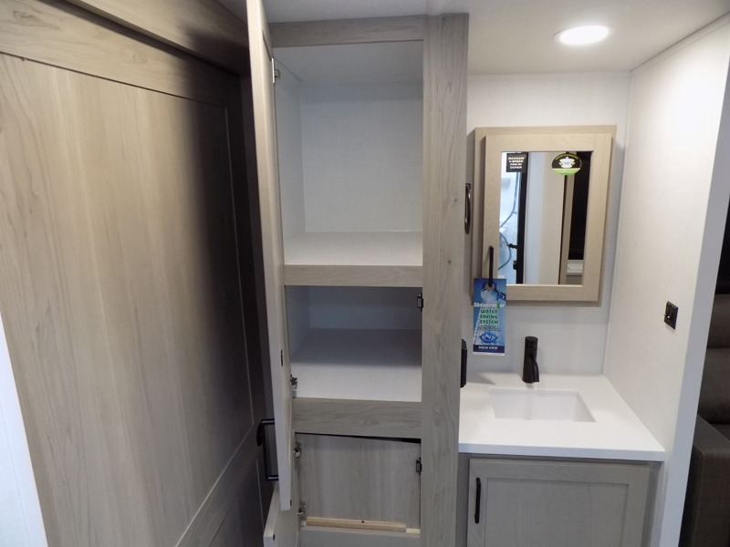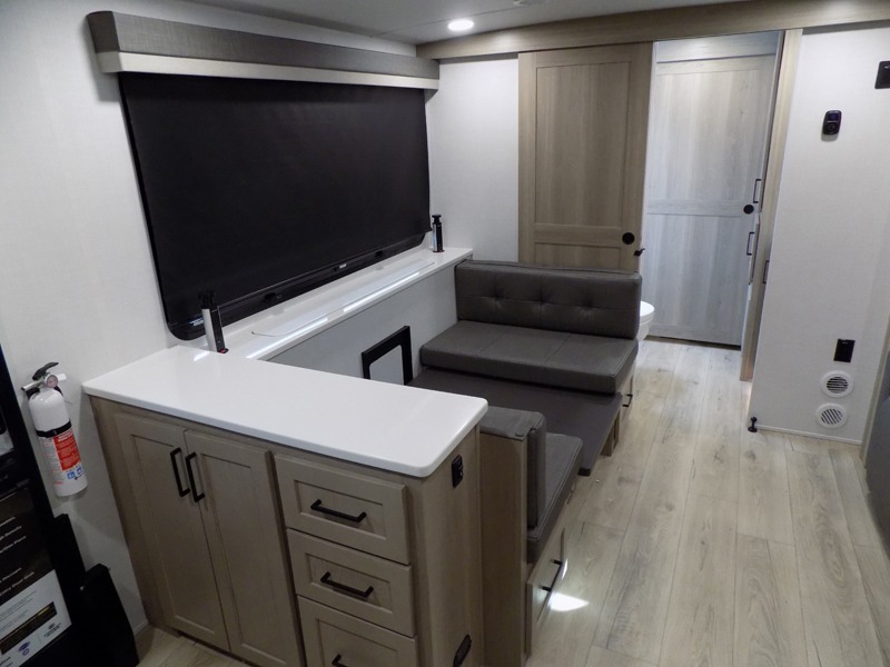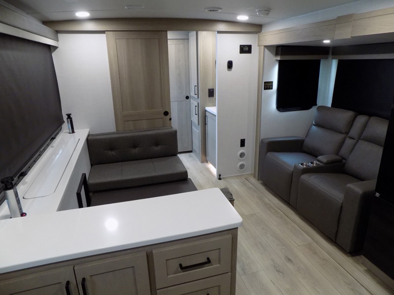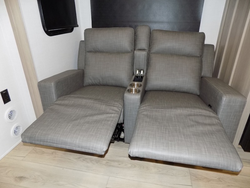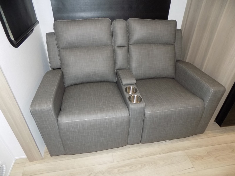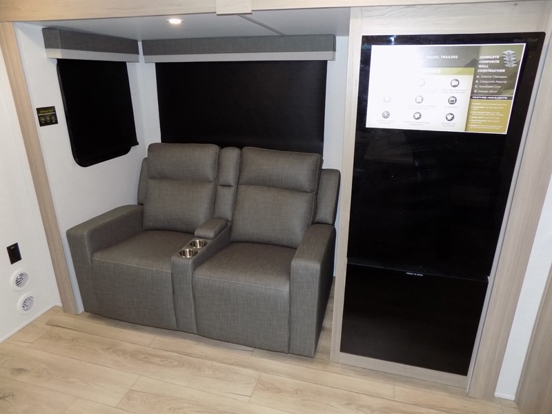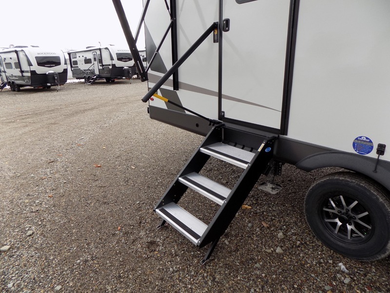 Wherever you decide to camp, you can be sure to enjoy your time in this double slide out trailer! The chef of your group will love having a front kitchen with generous counter space plus ample over-head cabinet space. There is also a 21' awning outdoors, along with Solid Entry Steps, and dual entry doors! A 39" booth dinette provides a place to dine or play a card game after dinner, and the theater seat across from the TV is perfect for movie night. The walk-thru bath leads to the rear master bedroom where you'll find a queen bed, a large wardrobe, and the second entrance to the trailer for easy access to both the wardrobe and the bathroom nearby!