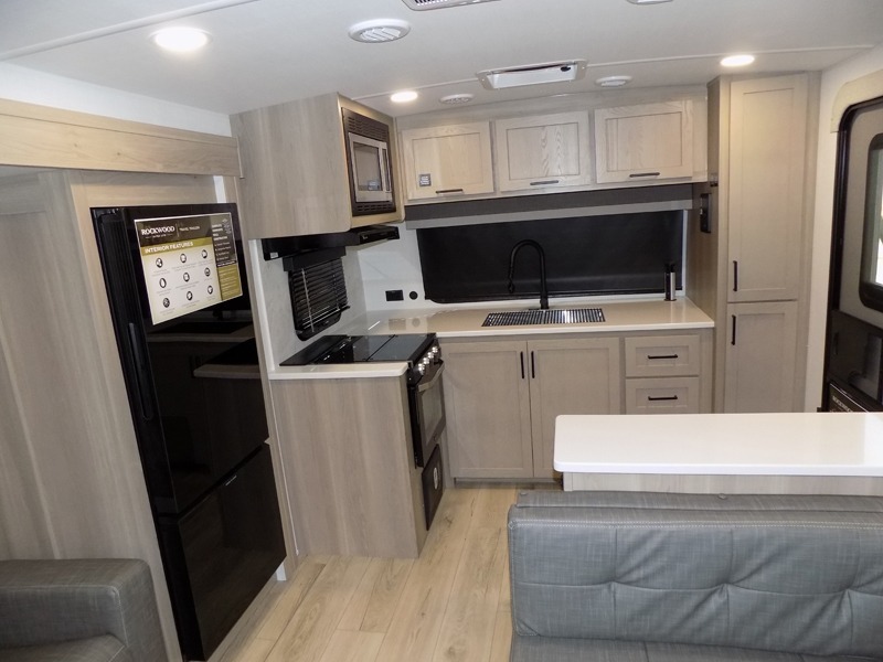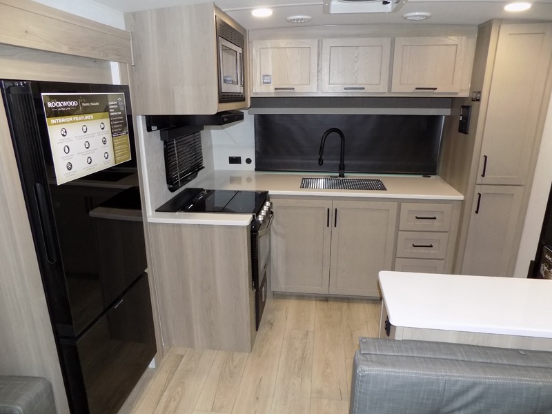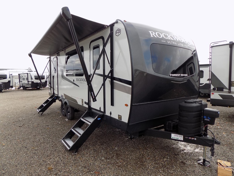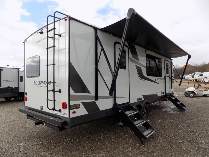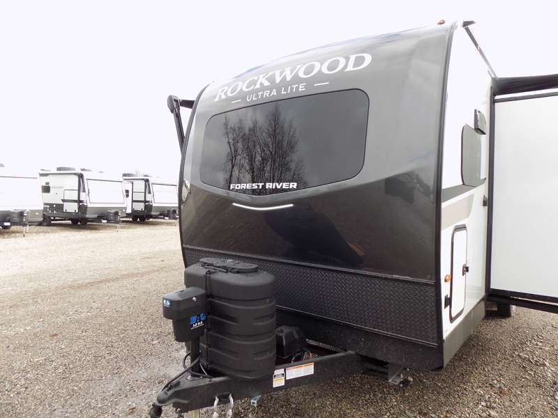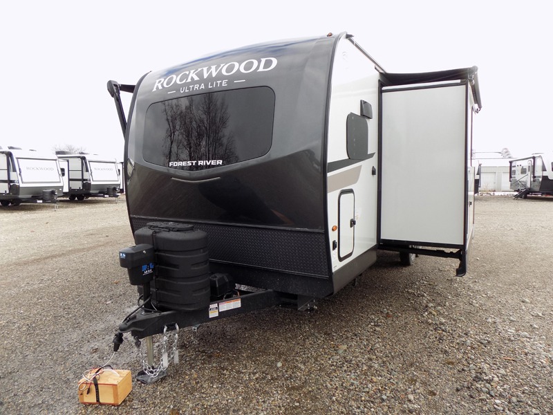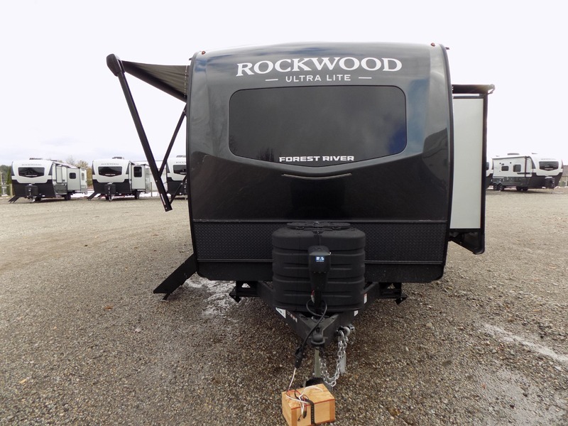 Each Rockwood Ultra Lite travel trailer by Forest River includes superior construction with a high gloss fiberglass cap, aluminum cage construction, and a power awning with LED lighting for a cozy and functional outdoor space. The torsion axle, power tongue jack will make towing smooth and hassle-free, along with the nitrogen filled, Goodyear Endurance tires and the tire pressure monitor system. Interior comforts include kitchen sink with high rise faucet, hidden hinge cabinet doors, and roller shades to name a few. Choose a Rockwood Ultra Lite travel trailer today!