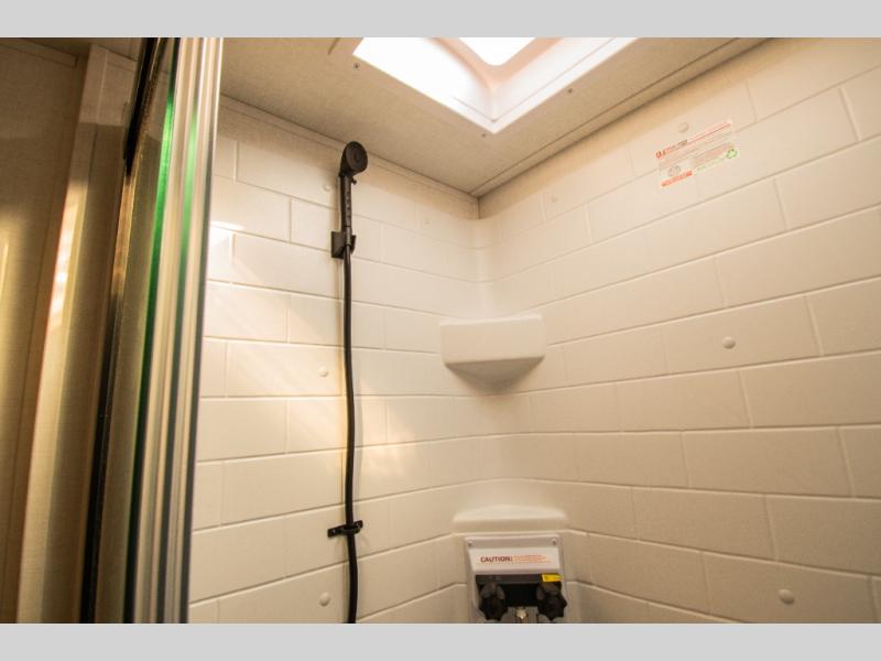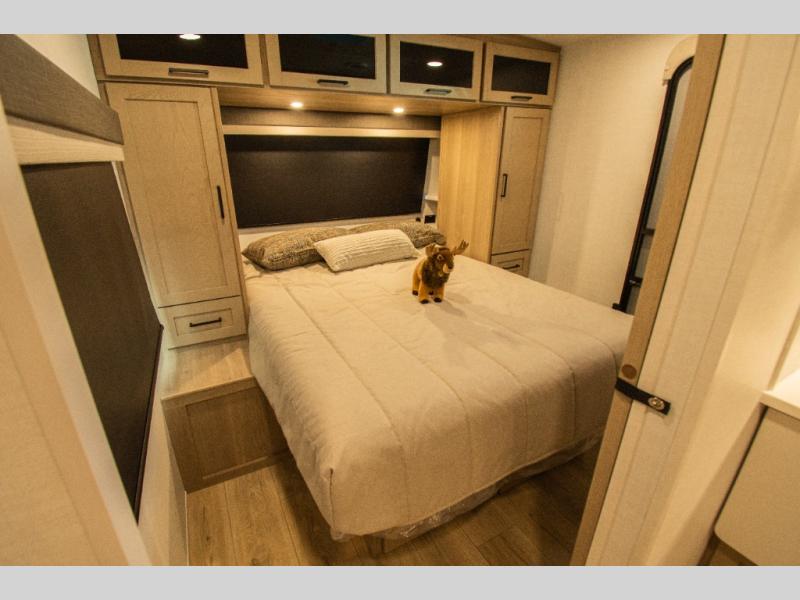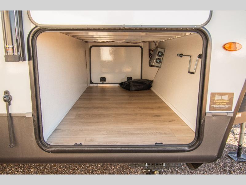 A full bathroom helps keep everyone comfortable on longer stays, and storage is thoughtfully placed throughout the interior. Outside, multiple exterior compartments, including pass-through storage with an optional steel sliding tray, make it easy to organize and access camping gear. A front door option is also available for those who prefer dual entry doors.