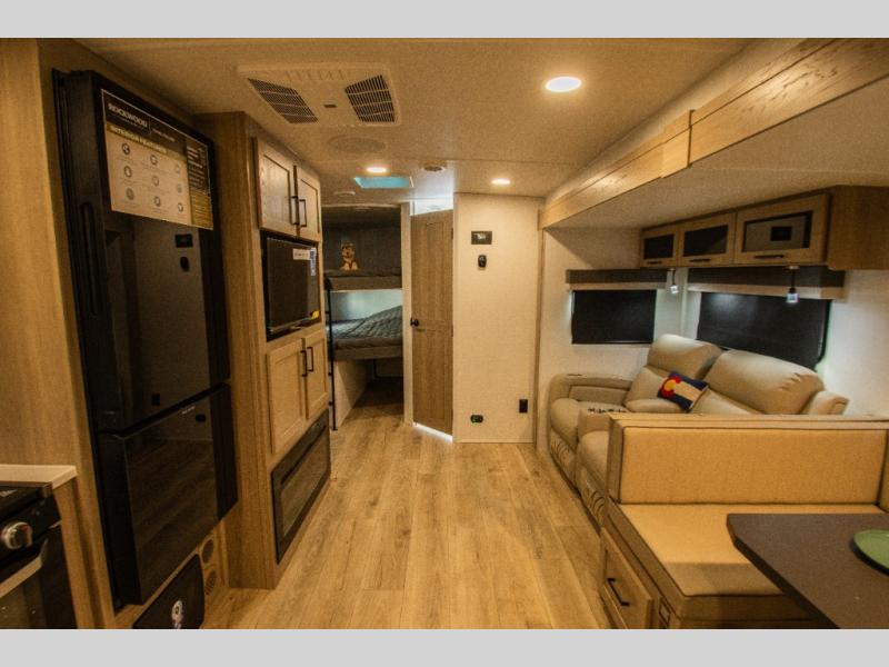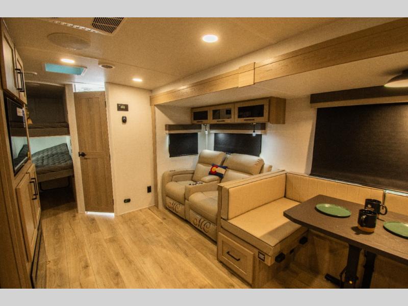 The layout centers around a spacious interior that makes it easy for multiple people to move and gather comfortably. Double-size bunks provide generous sleeping space, while the U-shaped dinette and theater seating offer plenty of room for meals, games, or relaxing inside.