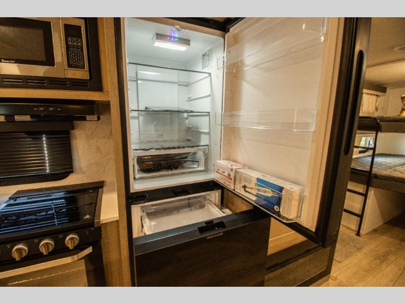 The interior kitchen features an L-shaped layout that gives the cook their own workspace, with full amenities and a walk-in pantry for storing food and supplies for longer trips. When the weather’s right, the outside kitchen and exterior griddle make it easy to prepare meals outdoors without crowding the interior.