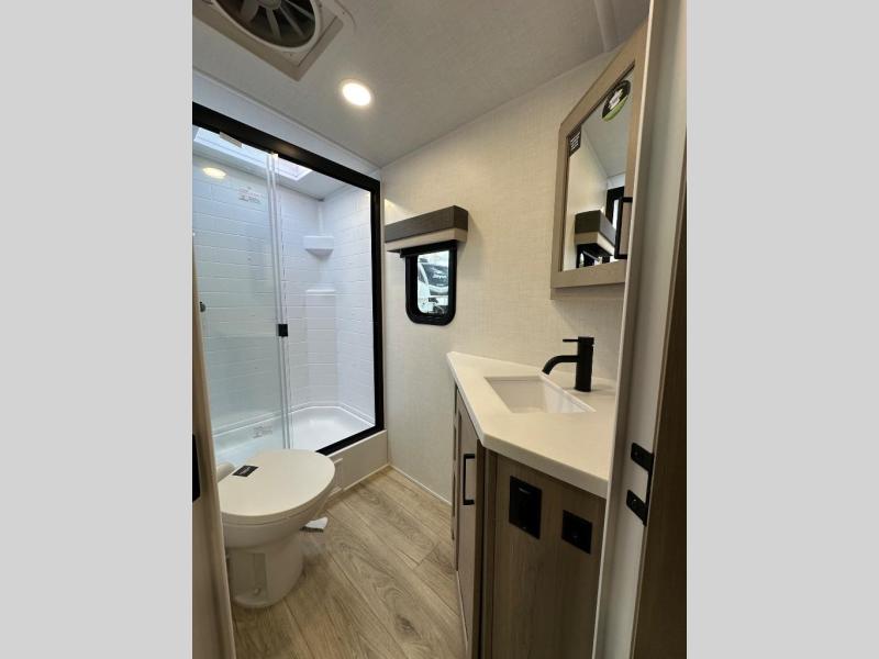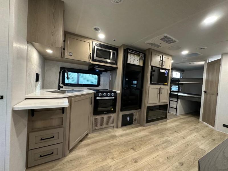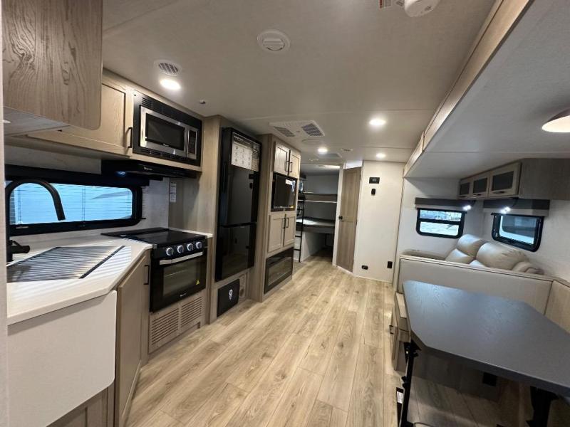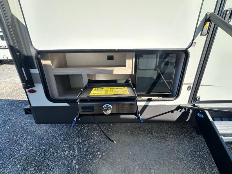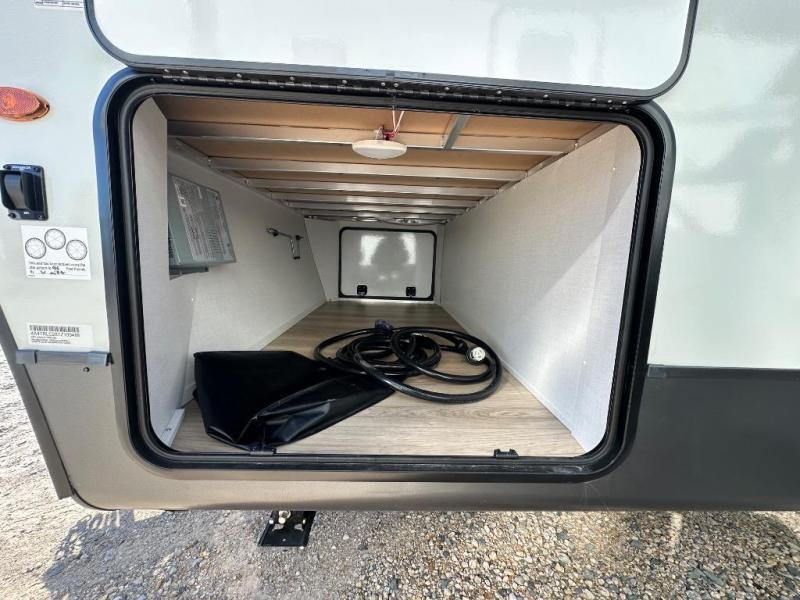 Looking for a trailer that sleeps eight, allows you to cook indoors or outdoors, and provides added interior space? This trailer provides for those wants and needs, and even more! The outside kitchen gives you more choices when feeding the masses along with the outside griddle, and the interior kitchen includes an L-shaped area for the cook to have their own space with full amenities including a walk-in pantry to bring along everything they need. The full bathroom will keep everyone refreshed, and the theater seating and U-shaped dinette offer seating inside to enjoy the Smart TV and fireplace. There is plenty of storage found throughout the interior, and along the exterior you will find several places to stow your outdoor items including in the pass thru storage with an optional steel sliding tray. There is even a front door option if you prefer to have dual entry doors!