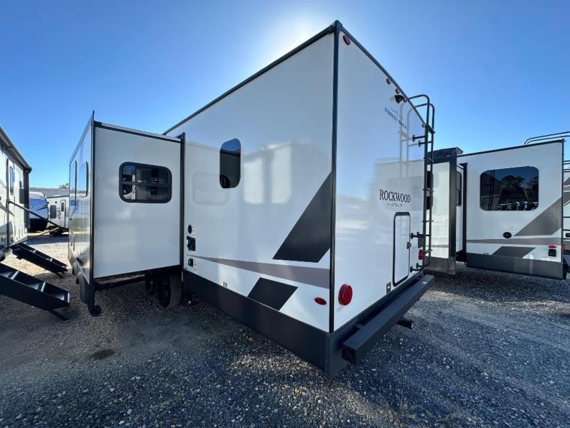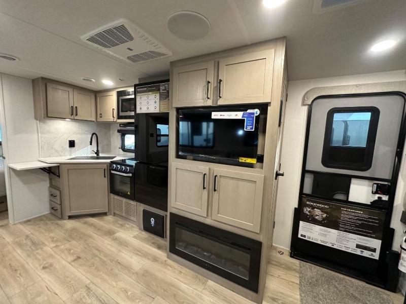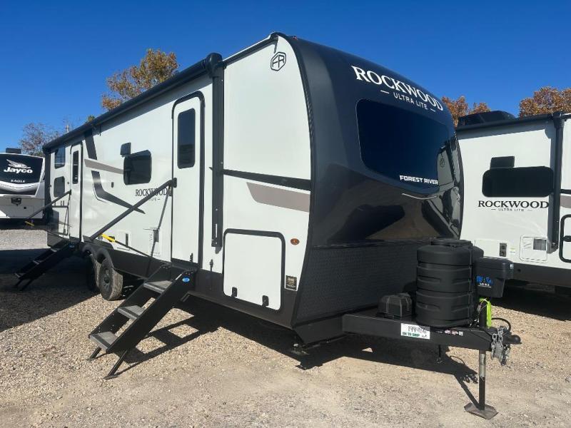 Each Rockwood Ultra Lite travel trailer by Forest River includes superior construction with a high gloss fiberglass cap, aluminum cage construction, and a power awning with LED lighting for a cozy and functional outdoor space. The torsion axle, power tongue jack will make towing smooth and hassle-free, along with the nitrogen filled, Goodyear Endurance tires and the tire pressure monitor system. Interior comforts include kitchen sink with high rise faucet, hidden hinge cabinet doors, and roller shades to name a few. Choose a Rockwood Ultra Lite travel trailer today!