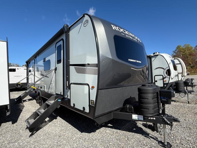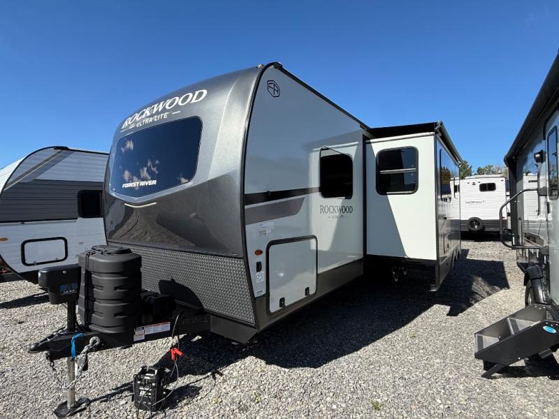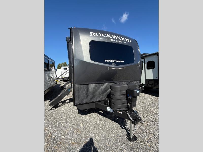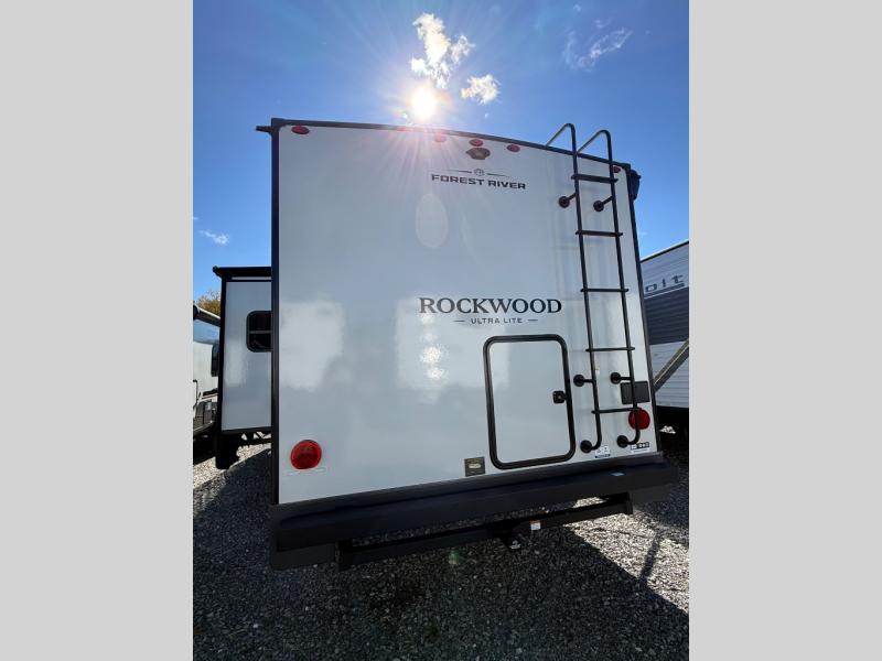 Each Rockwood Ultra Lite travel trailer by Forest River includes superior construction with a high gloss fiberglass cap, aluminum cage construction, and a power awning with LED lighting for a cozy and functional outdoor space. The torsion axle, power tongue jack will make towing smooth and hassle-free, along with the nitrogen filled, Goodyear Endurance tires and the tire pressure monitor system. Interior comforts include kitchen sink with high rise faucet, hidden hinge cabinet doors, and roller shades to name a few. Choose a Rockwood Ultra Lite travel trailer today!