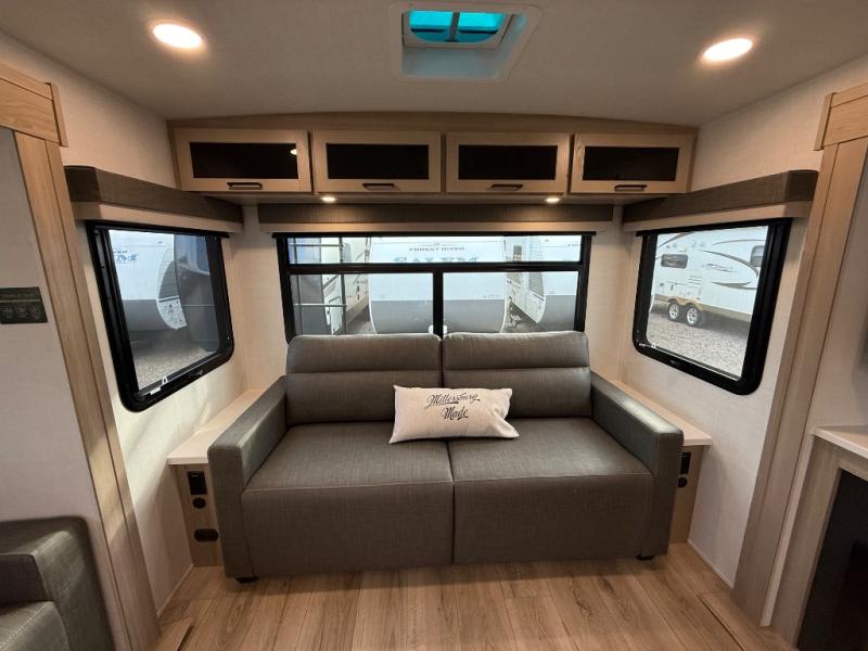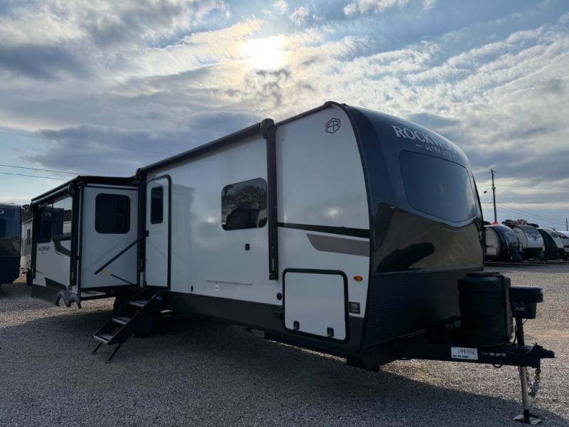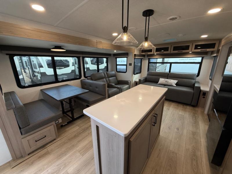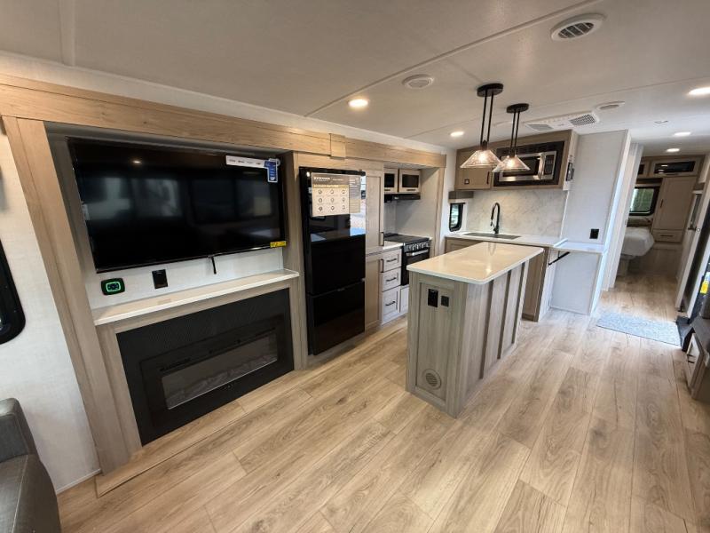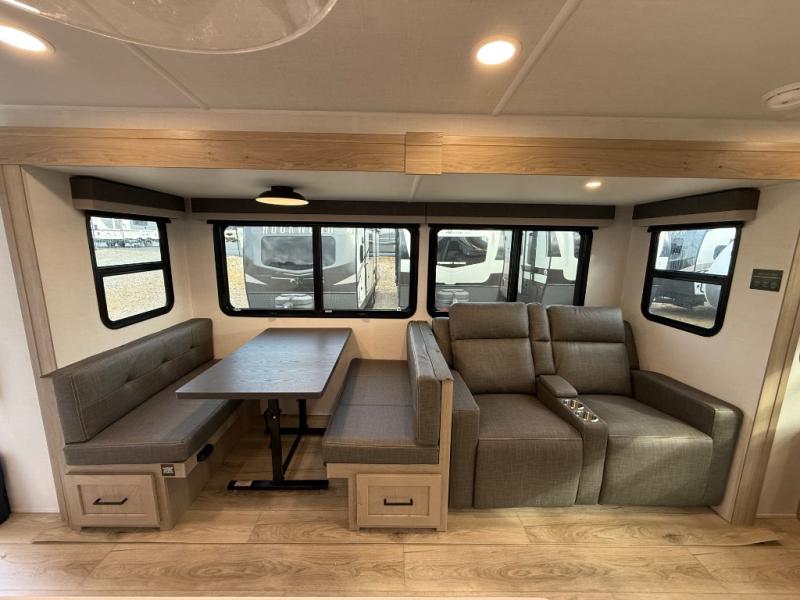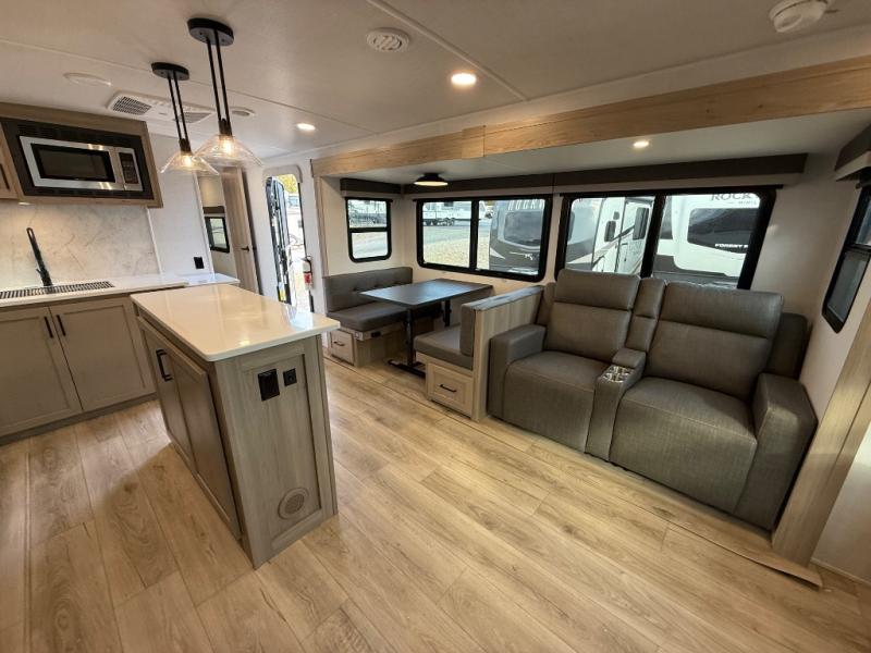 This Forest River Rockwood Ultra Lite 2906RL travel trailer is designed for comfort and space, featuring dual opposing slides in the main living area that open up the rear living room for everyone to gather. Whether you're relaxing on the hide-a-bed sofa, kicking back in the theater seats, or enjoying a meal at the booth dinette, there's room for the whole gang. The kitchen island adds extra counter space, perfect for laying out plates and creating a buffet-style spread. Up front, the private bedroom offers a queen bed and two wardrobes, giving you plenty of storage for clothes and essentials. Along with two awnings outside, you can enjoy morning sunrises or evening sunsets with friends and family.