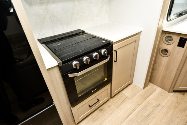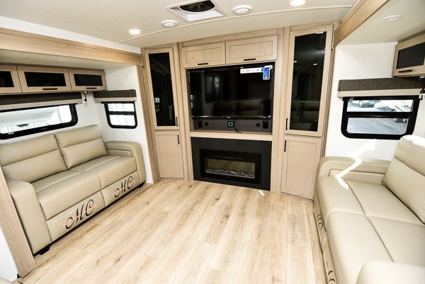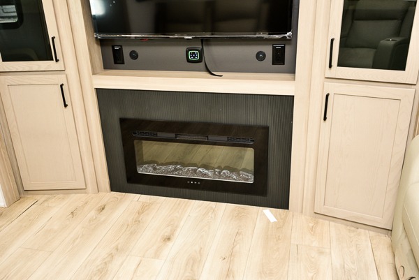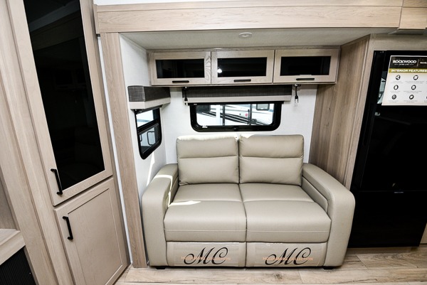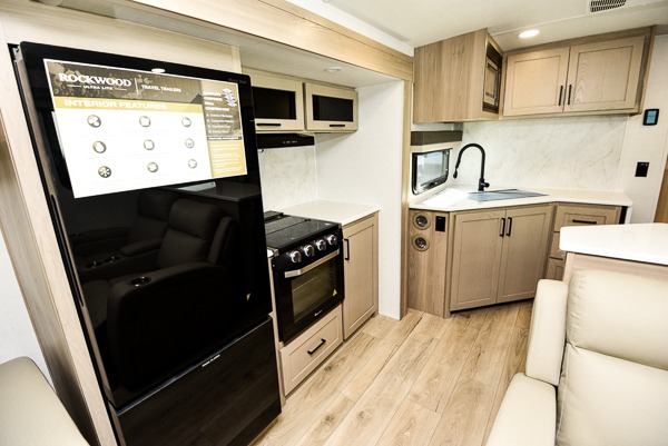 With dual slides at the rear, this Rockwood Ultra Lite travel trailer offers a spacious living area for entertaining or relaxing. Gather the whole gang for movie night with three cozy seating options facing the TV and fireplace, including two 60" hide-a-bed sofas and a 60" theater seat. A table with bar stools adds more seating and doubles as a dining spot, overlooking the TV. Overhead storage throughout the living area and kitchen provides plenty of room to stow away groceries, dishes, books, and board games, keeping everything organized. Let´s not forget the full bathroom with a large shower offers a comfortable place to refresh, while the front bedroom features a queen bed and two wardrobes for storing all your essentials.