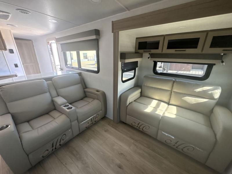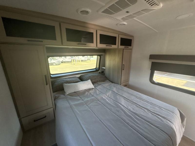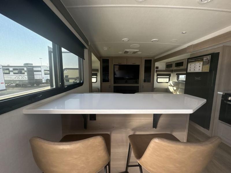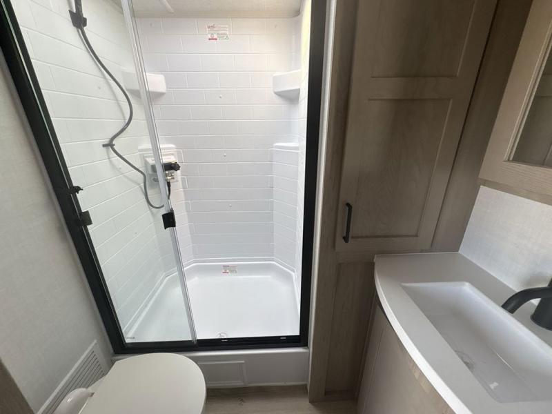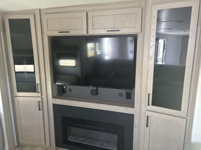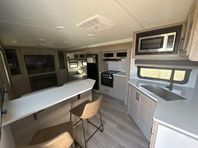 With dual slides at the rear, this Rockwood Ultra Lite travel trailer offers a spacious living area for entertaining or relaxing. Gather the whole gang for movie night with three cozy seating options facing the TV and fireplace, including two 60" hide-a-bed sofas and a 60" theater seat. A table with bar stools adds more seating and doubles as a dining spot, overlooking the TV. Overhead storage throughout the living area and kitchen provides plenty of room to stow away groceries, dishes, books, and board games, keeping everything organized. Let´s not forget the full bathroom with a large shower offers a comfortable place to refresh, while the front bedroom features a queen bed and two wardrobes for storing all your essentials.