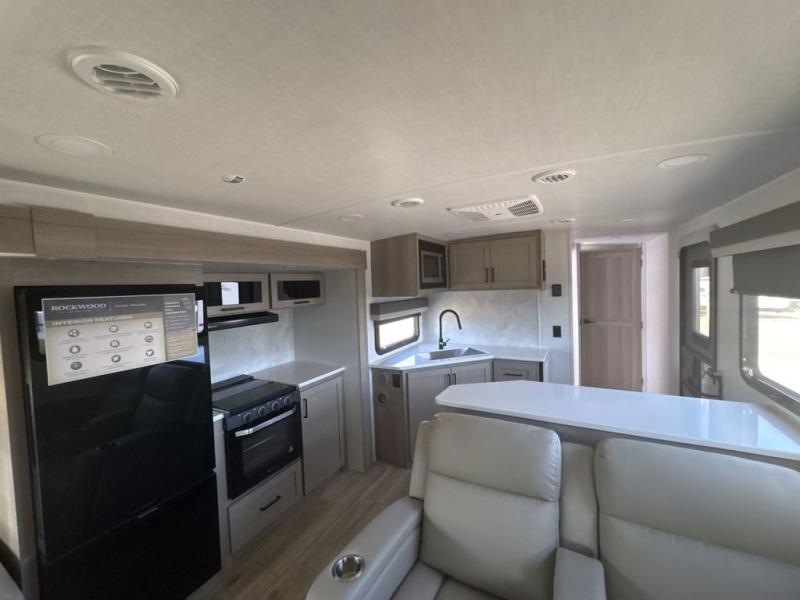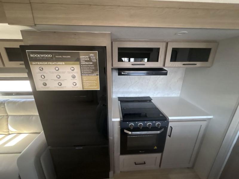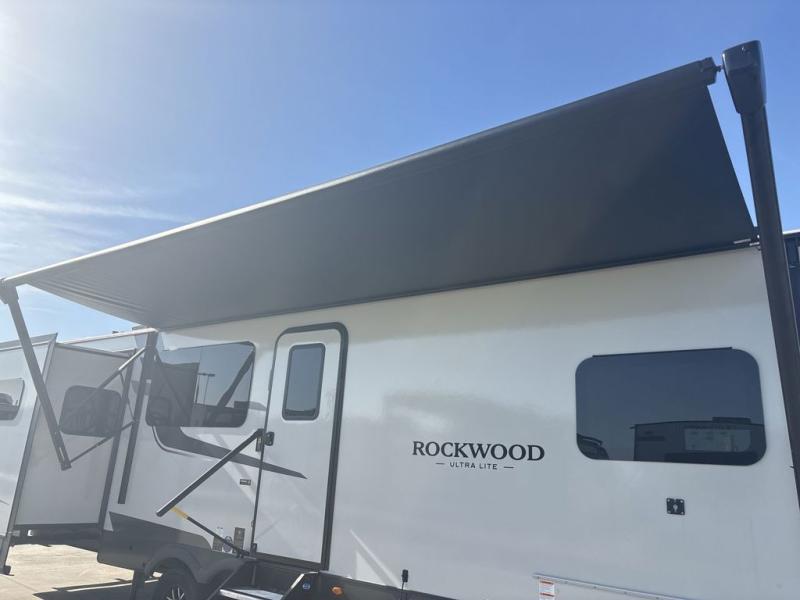Each Rockwood Ultra Lite travel trailer by Forest River includes superior construction with a high gloss fiberglass cap, aluminum cage construction, and a power awning with LED lighting for a cozy and functional outdoor space. The torsion axle, power tongue jack will make towing smooth and hassle-free, along with the nitrogen filled, Goodyear Endurance tires and the tire pressure monitor system. Interior comforts include kitchen sink with high rise faucet, hidden hinge cabinet doors, and roller shades to name a few. Choose a Rockwood Ultra Lite travel trailer today!