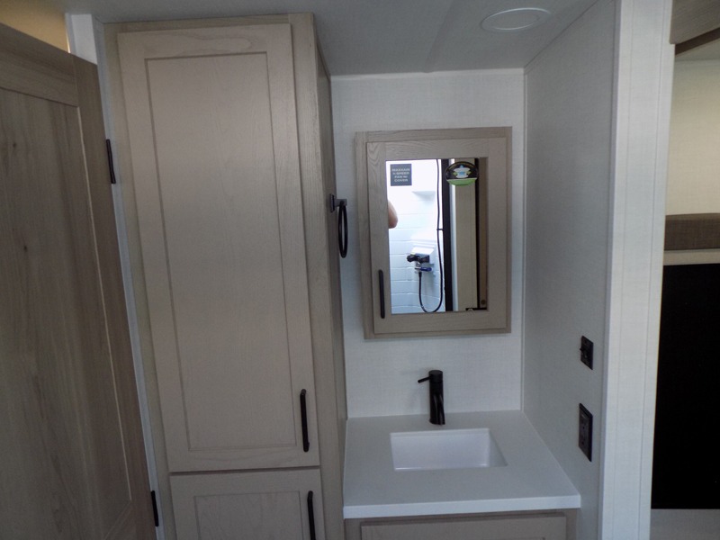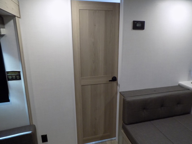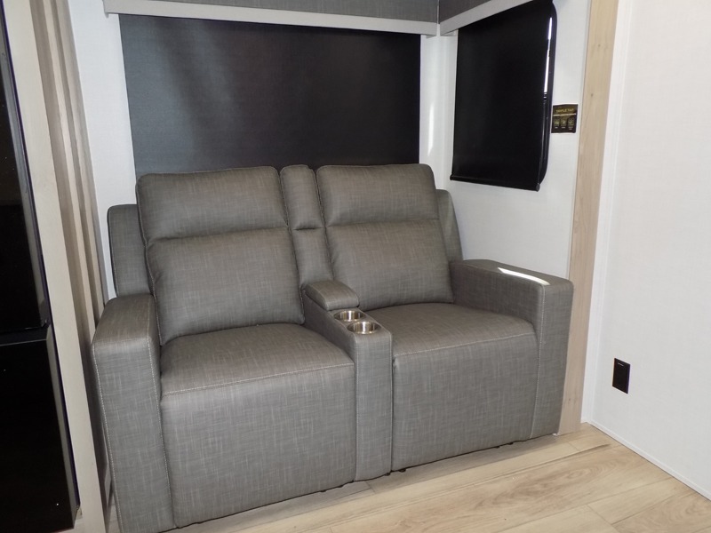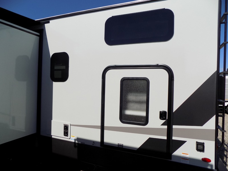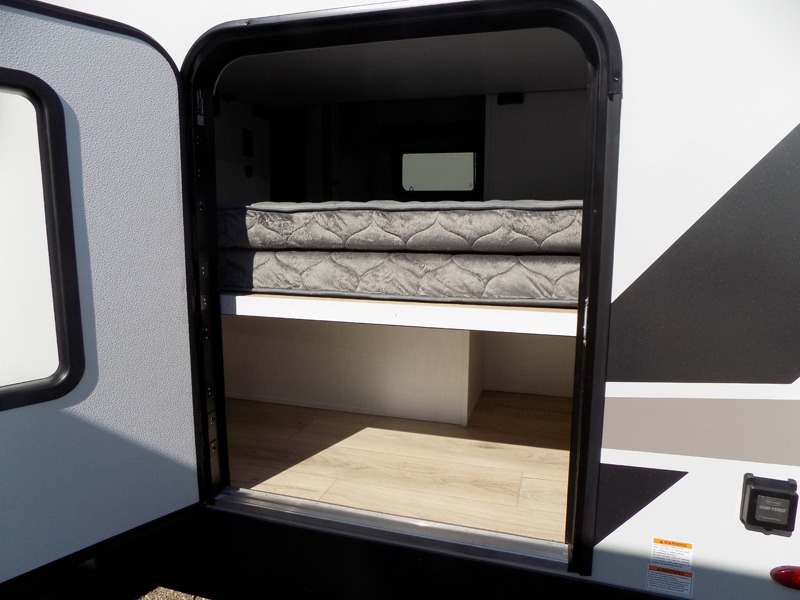 If you've been searching for a full-featured travel trailer, this is the one! Not only will you enjoy your own space up front in the master bedroom, but your guests can claim the rear bunkhouse suite all to themselves. There are two bunks with storage here, along with a desk, and a half bath for convenience. Your crew can meet in the middle living area on the theater seat or booth dinette. There is also a TV here for movie nights! Or gather around outside to enjoy the sunrise or sunset under the 24'6" power awning. A full walk-thru bath is sure to come in handy after a day at the lake, and did we mention this unit has dual entry doors?!