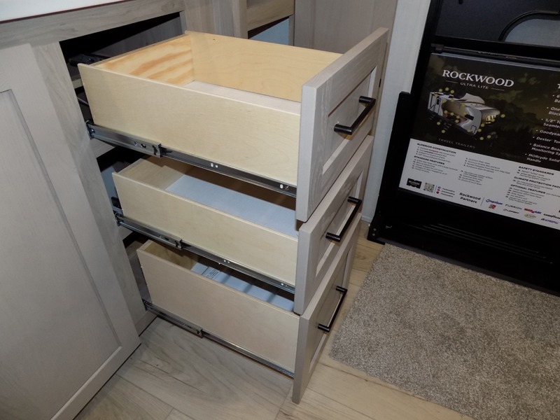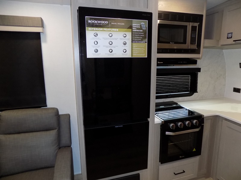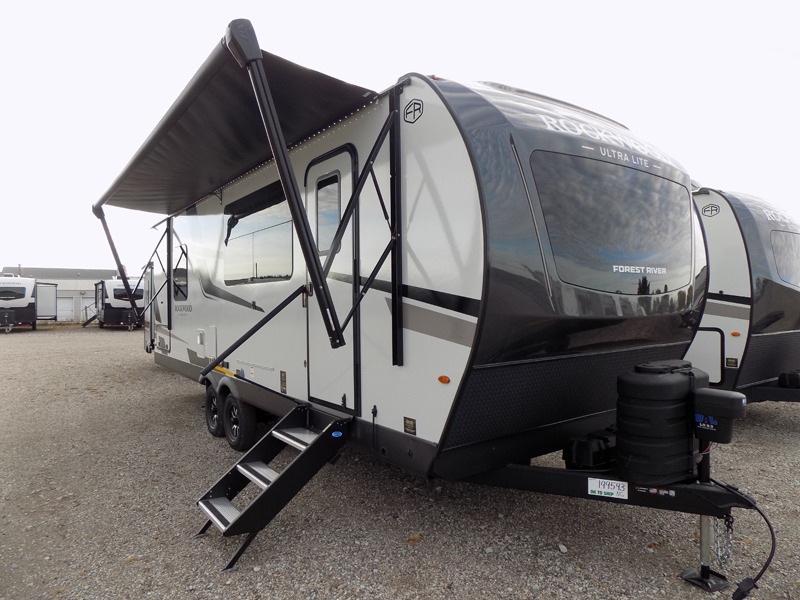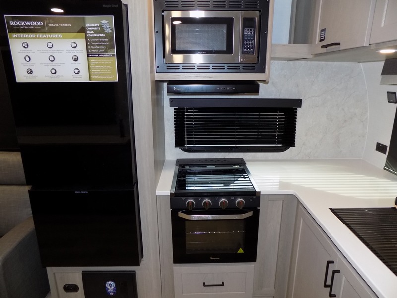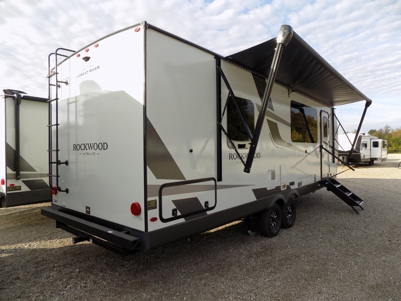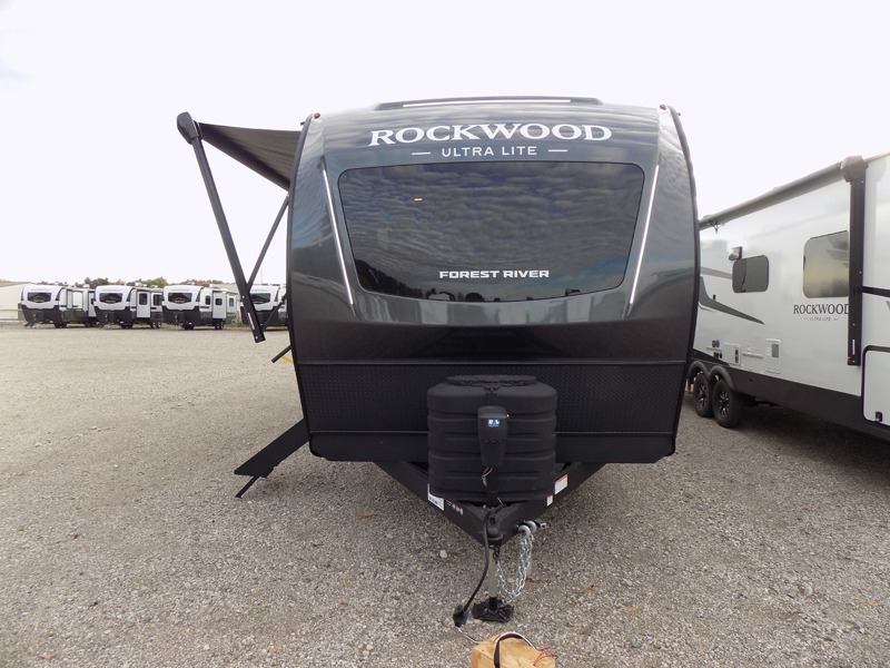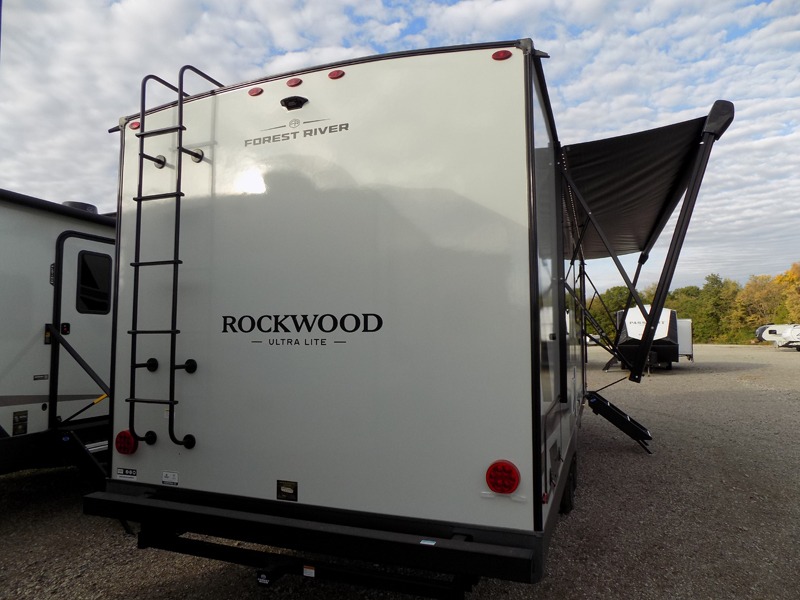 Each Rockwood Ultra Lite travel trailer by Forest River includes superior construction with a high gloss fiberglass cap, aluminum cage construction, and a power awning with LED lighting for a cozy and functional outdoor space. The torsion axle, power tongue jack will make towing smooth and hassle-free, along with the nitrogen filled, Goodyear Endurance tires and the tire pressure monitor system. Interior comforts include kitchen sink with high rise faucet, hidden hinge cabinet doors, and roller shades to name a few. Choose a Rockwood Ultra Lite travel trailer today!