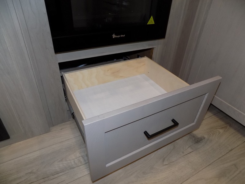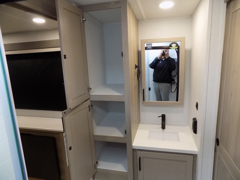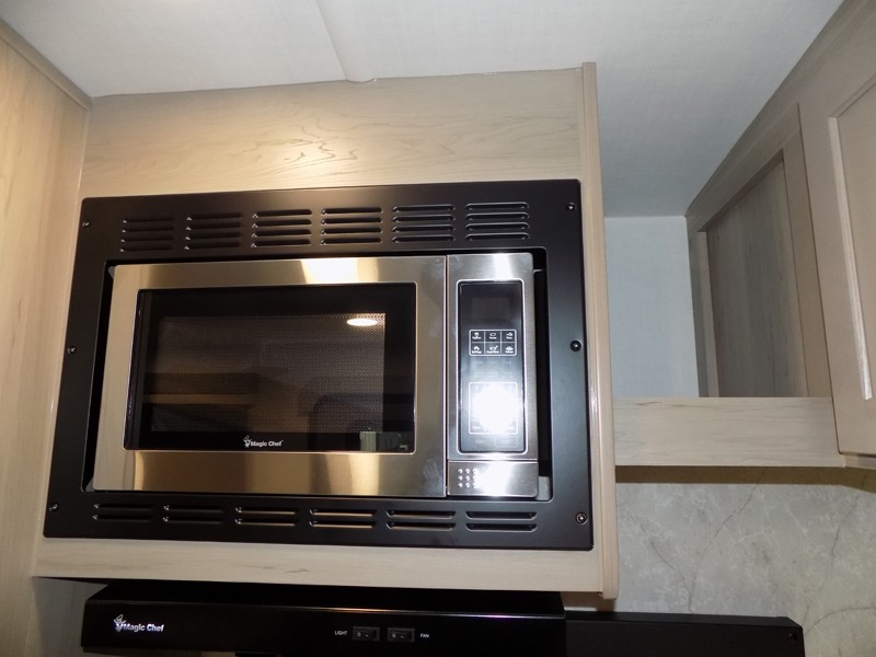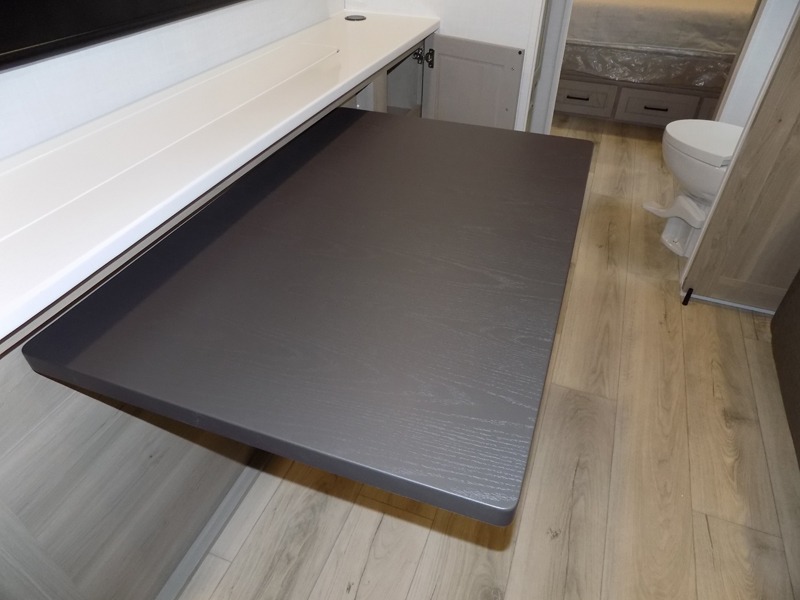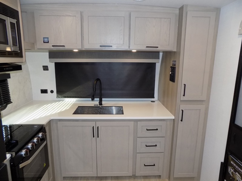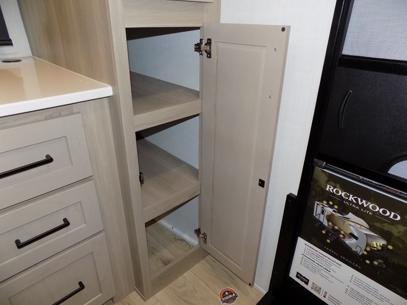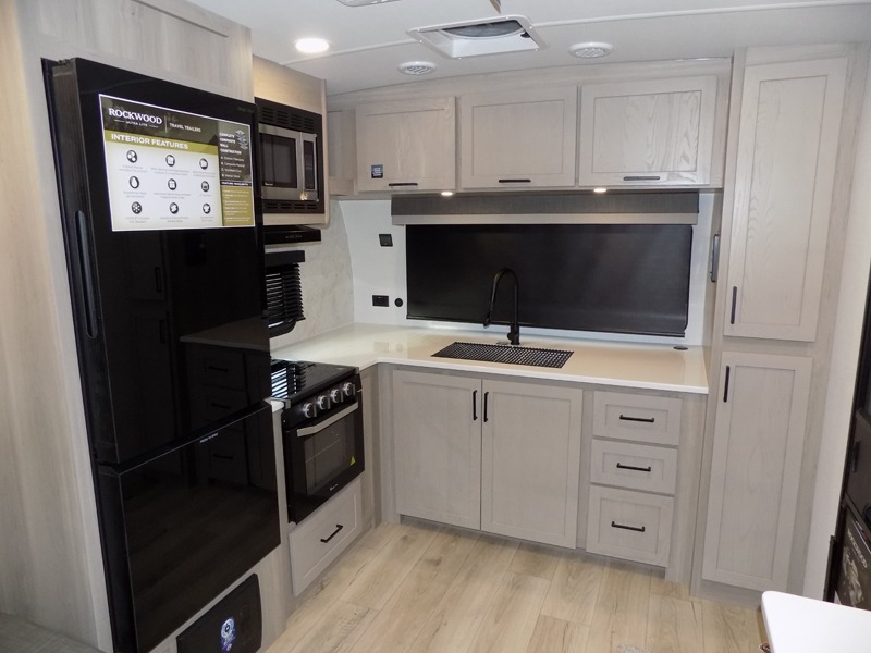 This Rockwood Ultra Lite is fit for a cook! As soon as you step inside, you're greeted by the spacious front kitchen. Designed for convenience and style, it has long solid surface countertops that provide ample space for meal prep and organizing utensils. The overhead cabinets offer plenty of room to store dishes and ingredients for all your favorite recipes. After cooking, you can unwind on the 67" theater seat facing a TV with a lift, perfect for movie nights or catching up on your favorite shows. For meals, enjoy dining at the flip-up table with folding chairs, ideal for sharing breakfast, lunch, or dinner with your partner. And when it's time to relax, a full bathroom leads to the rear bedroom, where a king-sized bed awaits to give you a restful night's sleep.