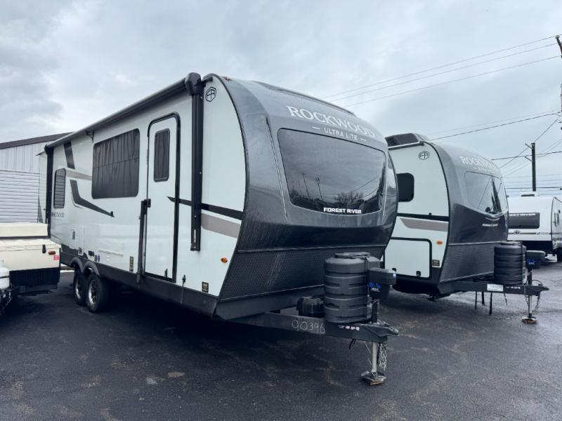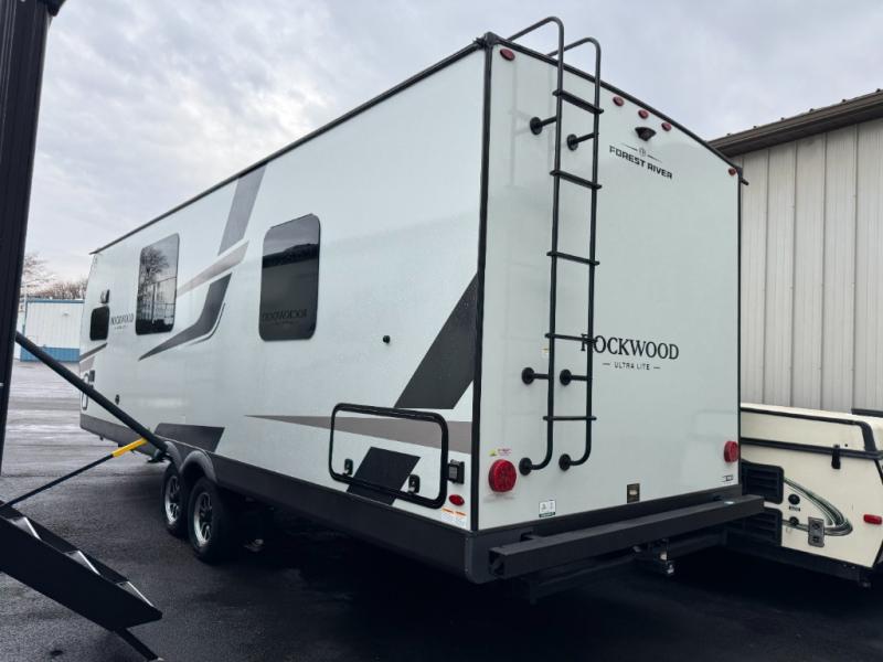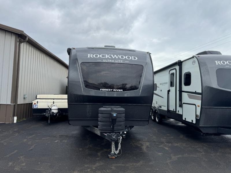 Each Rockwood Ultra Lite travel trailer by Forest River includes superior construction with a high gloss fiberglass cap, aluminum cage construction, and a power awning with LED lighting for a cozy and functional outdoor space. The torsion axle, power tongue jack will make towing smooth and hassle-free, along with the nitrogen filled, Goodyear Endurance tires and the tire pressure monitor system. Interior comforts include kitchen sink with high rise faucet, hidden hinge cabinet doors, and roller shades to name a few. Choose a Rockwood Ultra Lite travel trailer today!