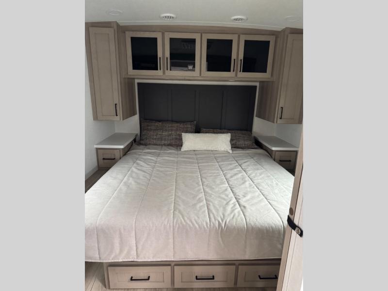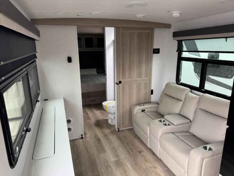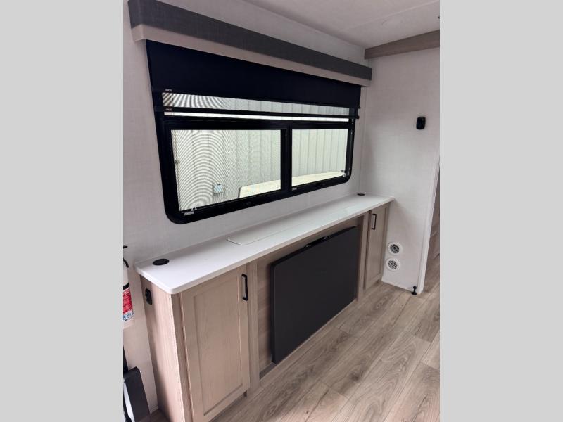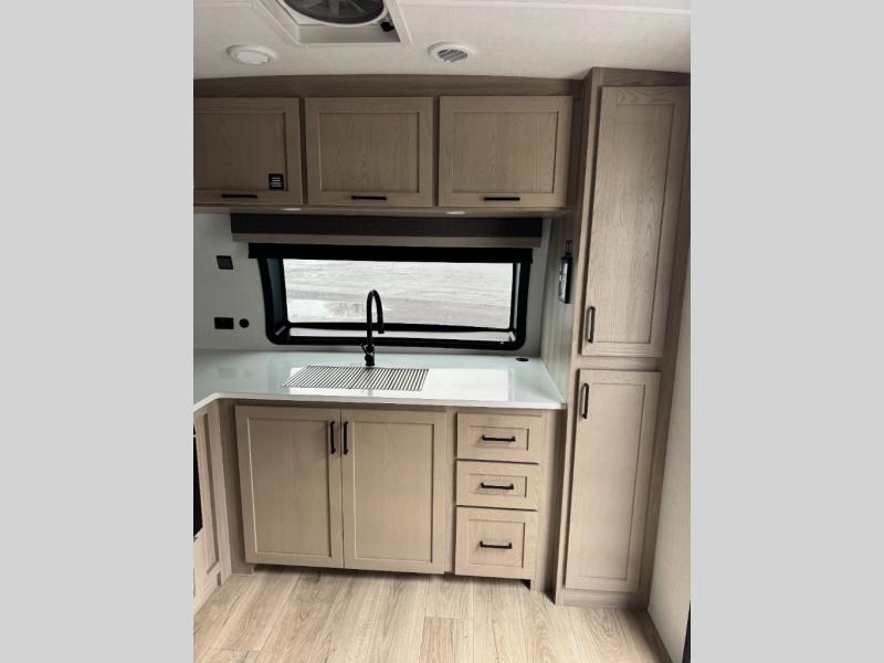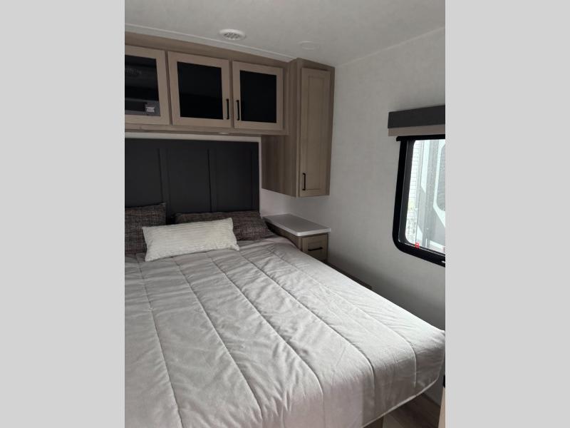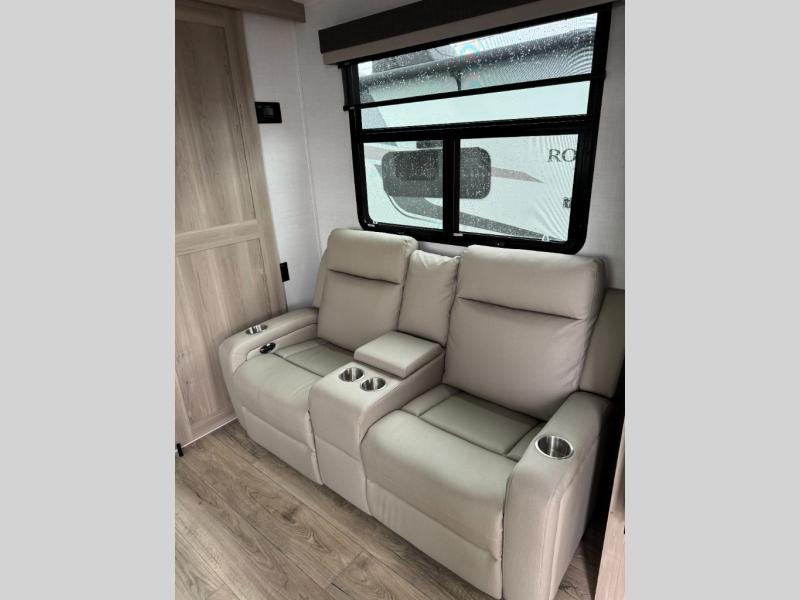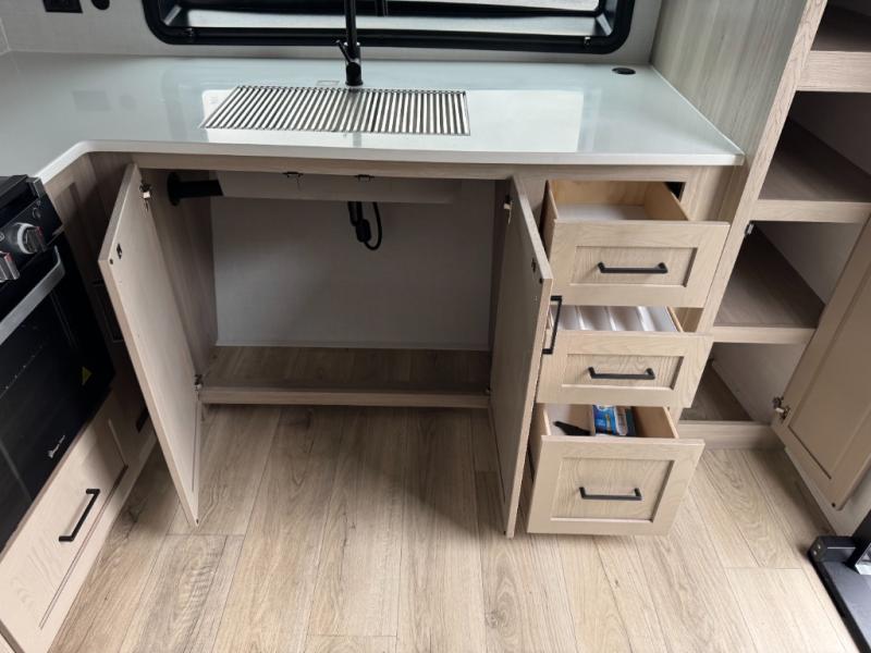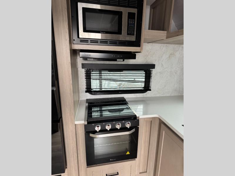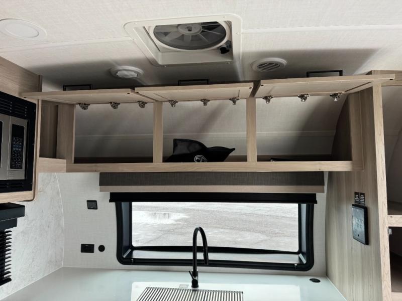 This Rockwood Ultra Lite is fit for a cook! As soon as you step inside, you're greeted by the spacious front kitchen. Designed for convenience and style, it has long solid surface countertops that provide ample space for meal prep and organizing utensils. The overhead cabinets offer plenty of room to store dishes and ingredients for all your favorite recipes. After cooking, you can unwind on the 67" theater seat facing a TV with a lift, perfect for movie nights or catching up on your favorite shows. For meals, enjoy dining at the flip-up table with folding chairs, ideal for sharing breakfast, lunch, or dinner with your partner. And when it's time to relax, a full bathroom leads to the rear bedroom, where a king-sized bed awaits to give you a restful night's sleep.