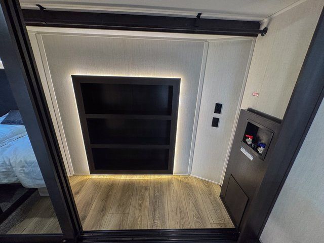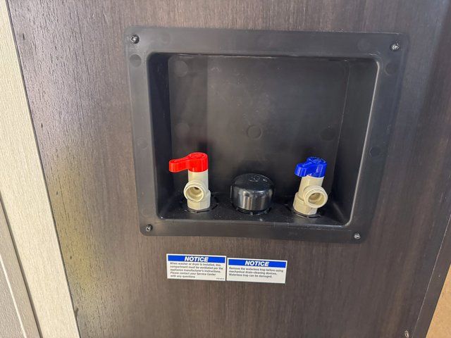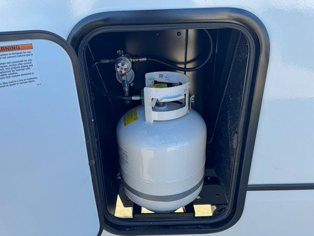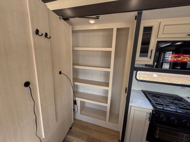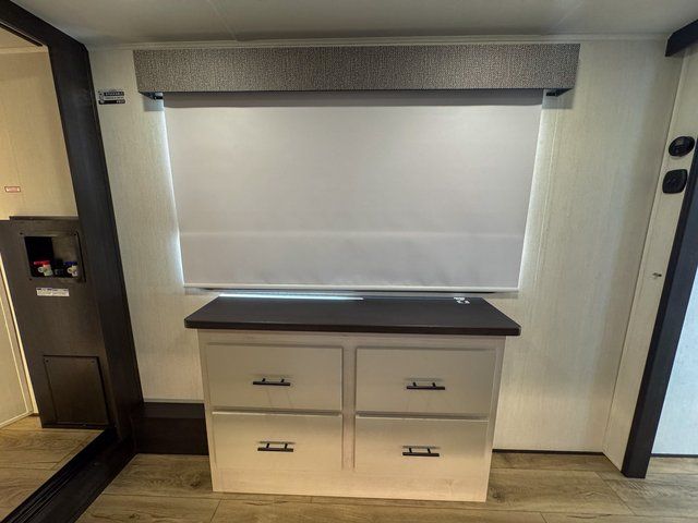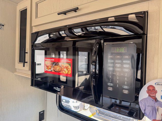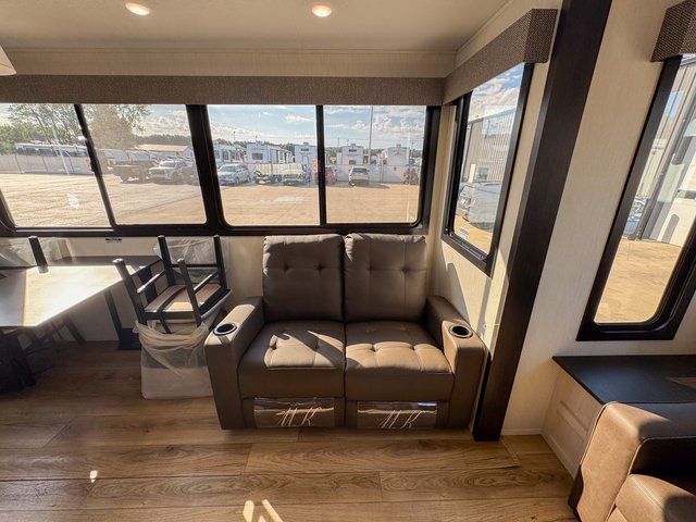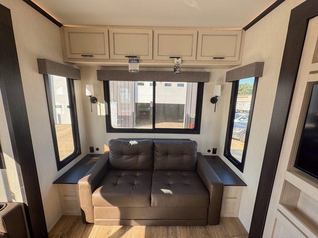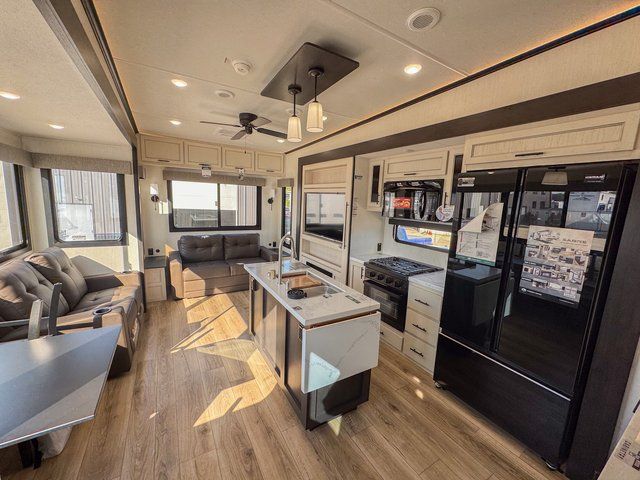 You will feel right at home in this fifth wheel! The rear living area includes a tri-fold sofa, a TV with a fireplace below, and theater seating for two making this space a second bedroom at night for guests. In the morning, you can prepare breakfast on the kitchen island and cooktop, then dine together at the versatile dinette/desk. There is plenty of storage space here, including a hidden pantry, a hutch, and overhead cabinets. The full bath will allow you to stay clean throughout your trip, and you'll feel right at home in the front private bedroom with a king bed. This model also includes an outside refrigerator for snacks, plus pass-thru storage for all your gear!