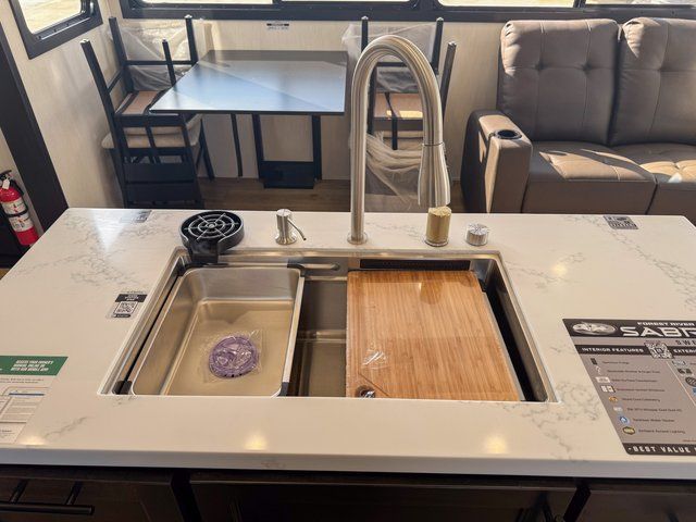 You will experience luxurious camping trips at an affordable price with any one of these Forest River Sabre fifth wheels! These models are durable and ready to travel anytime of the year thanks to features like the high-gloss gel-coat front cap with LED lighting, the PVC roof membrane, and the forced air underbelly with enclosed gate valves. The electric auto-leveling system makes setting up easy and safe, and the adjustable power awning with LED lighting will create an inviting outdoor living space. Each model includes a universal docking station which includes a black tank flush and an outside shower, and adjustable stable steps for you to enter and exit the unit safely. Inside, you will love the design of the ambient accent lighting in the living area, the real wood lumbercore cabinetry, and the linoleum flooring!