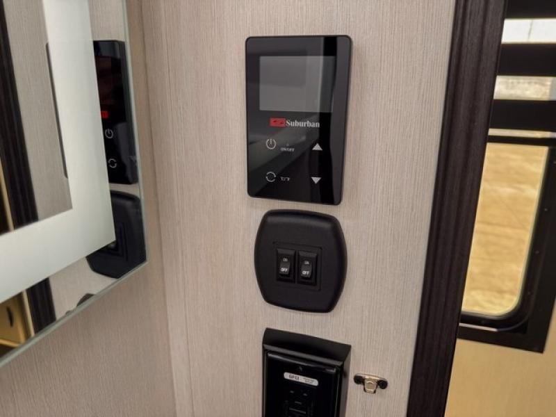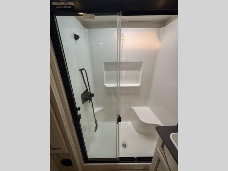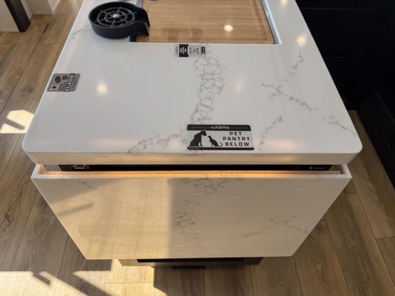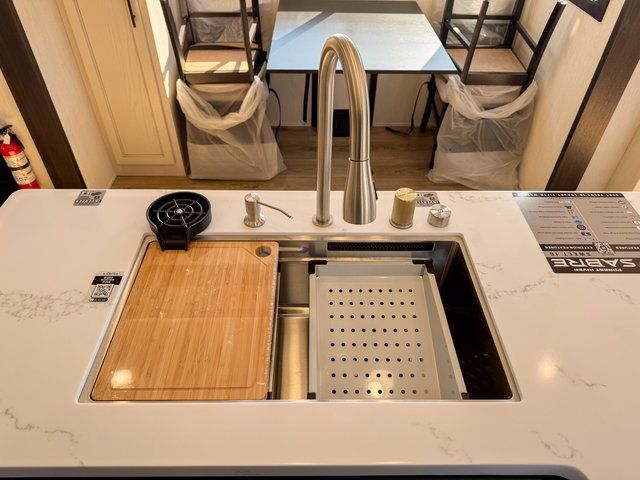 You will experience luxurious camping trips at an affordable price with any one of these Forest River Sabre fifth wheels! These models are durable and ready to travel anytime of the year thanks to features like the high-gloss gel-coat front cap with LED lighting, the PVC roof membrane, and the forced air underbelly with enclosed gate valves. The electric auto-leveling system makes setting up easy and safe, and the adjustable power awning with LED lighting will create an inviting outdoor living space. Each model includes a universal docking station which includes a black tank flush and an outside shower, and adjustable stable steps for you to enter and exit the unit safely. Inside, you will love the design of the ambient accent lighting in the living area, the real wood lumbercore cabinetry, and the linoleum flooring!