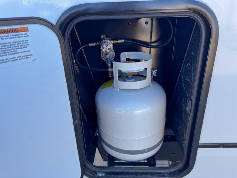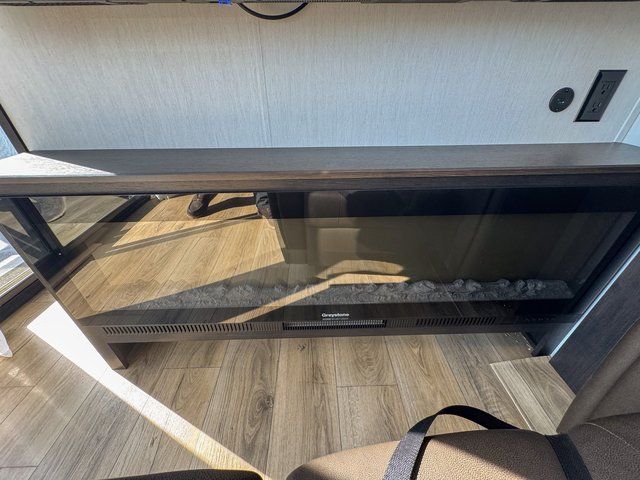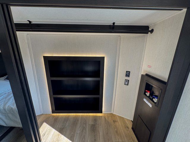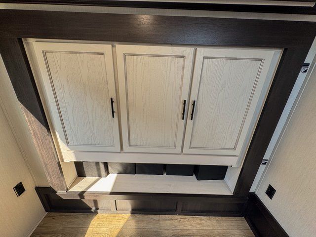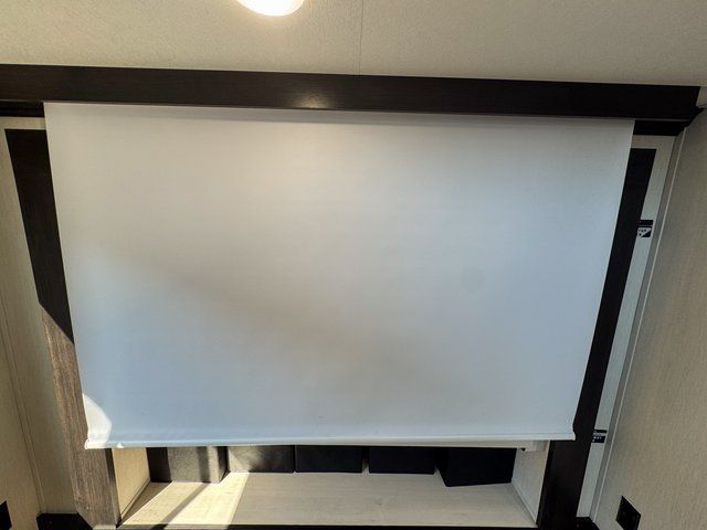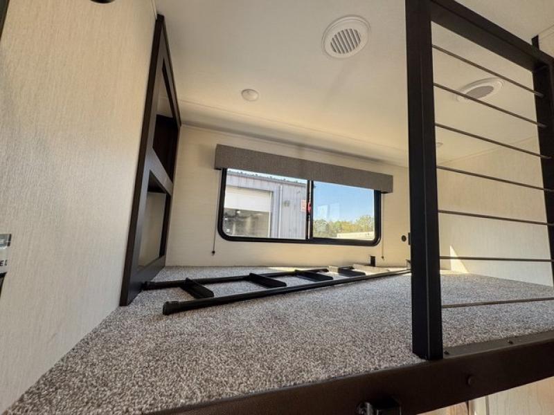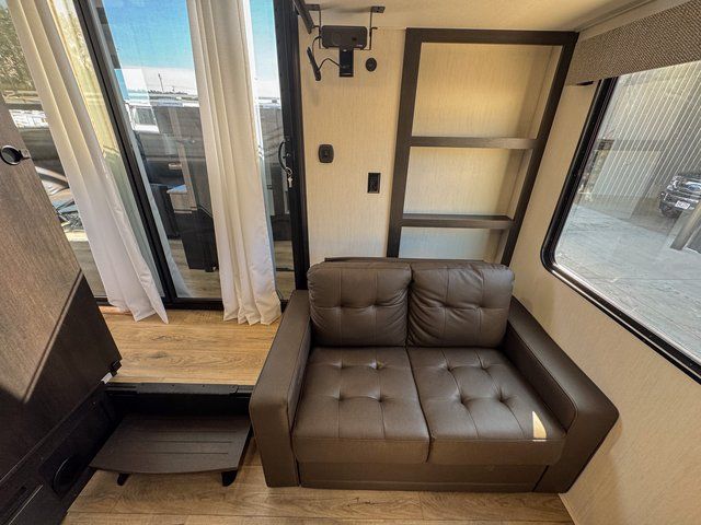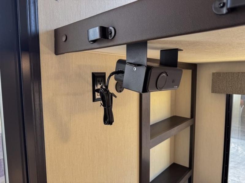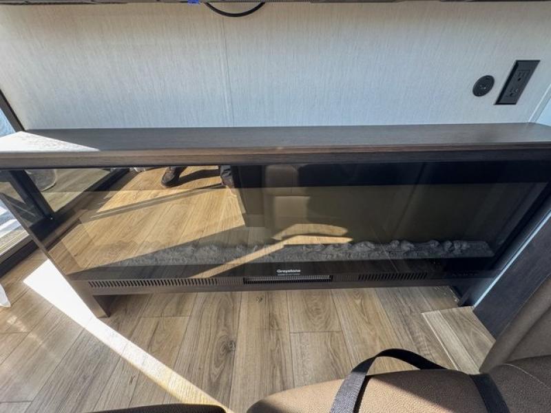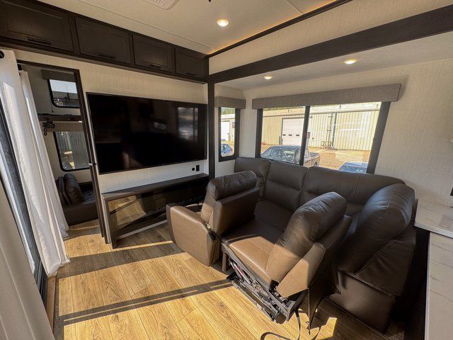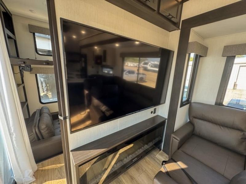 This is the perfect fifth wheel if you enjoy camping with friends and family! You'll have the front private bedroom with a camper king bed slide all to yourselves, while your guests take the rear den. There is a tri-fold sofa here, along with a wardrobe with a desk, additional shelves plus a loft above this room for even more sleeping or storage space! The main living room features an L-shaped sectional sofa, a fireplace and an entertainment center. And the patio deck with a 12' awning is right off of this room so you can visit with friends indoors or outdoors! There is generous counter space in the full kitchen, along with a pull-out storage drawer and a versatile dinette/desk. There are many more stand-out features found in this fifth wheel, including washer and dryer prep in the front bedroom, a 70" projector screen in the rear den, a second power awning, and the list goes on!