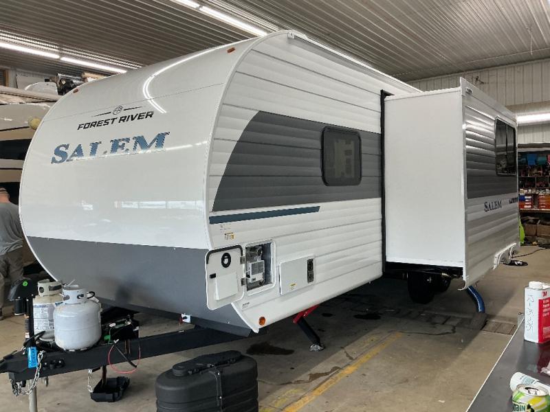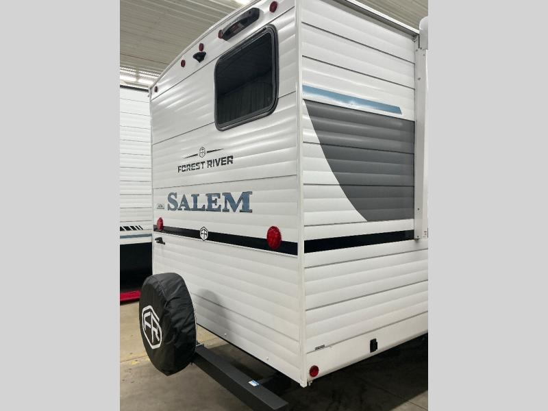 The Salem travel trailers are packed with hassle-free camping amenities and there are a variety of floorplans to choose from. The heated and enclosed Accessibelly will help protect against the elements and debris during transport, and the exterior retro/metal redesign is sure to be eye-catching! There are stylish roller shades inside, along with updated backsplash, elegant curtain rods and curtains, plus many more interior comforts! Choose a Salem travel trailer today for quality and value!