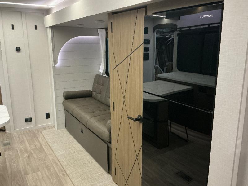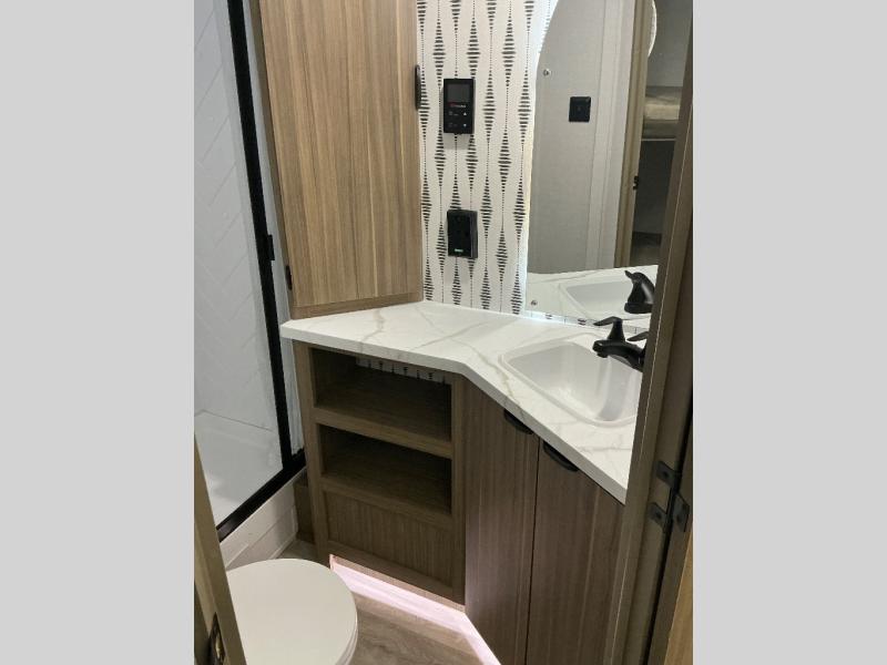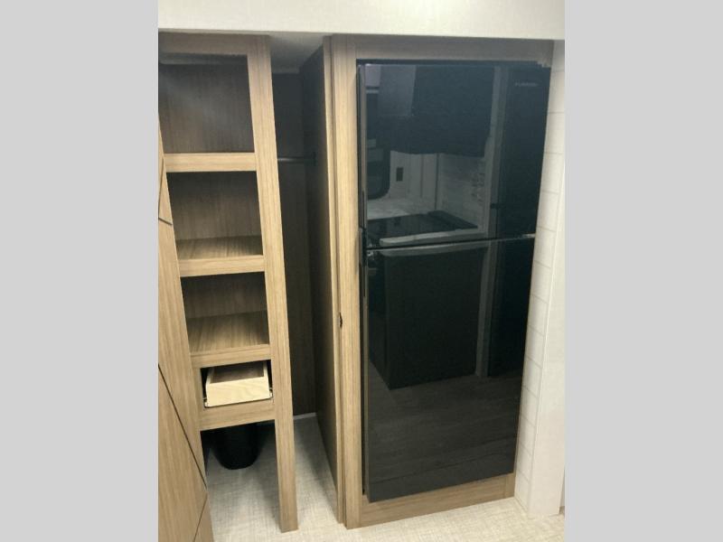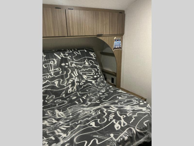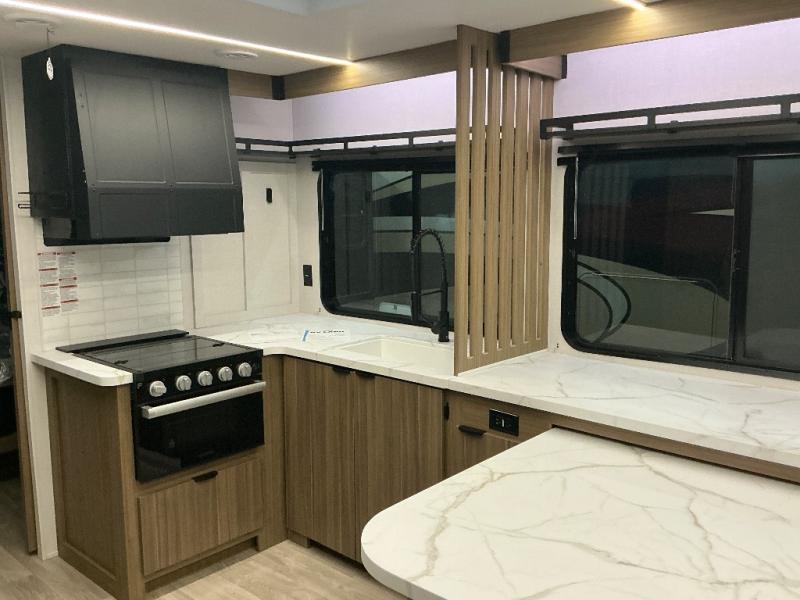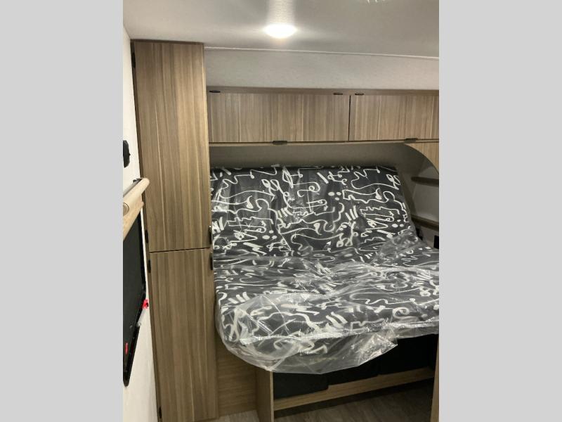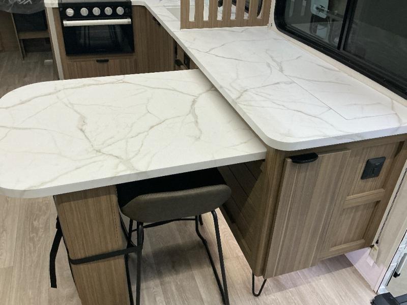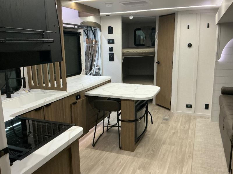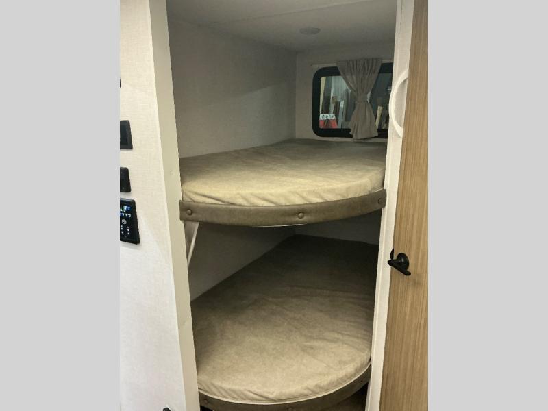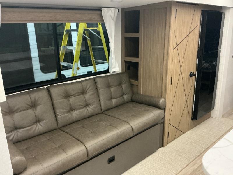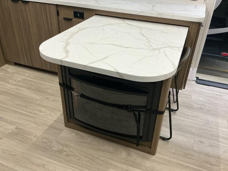 You can enjoy at-home comforts wherever you decide to camp in this travel trailer. The custom king bed with Versa Tilt includes dual shelves and a wardrobe so you can keep your space tidy. If you have a guest or two little ones, they can sleep on the jackknife sofa within the large slide out or on the double-size bunks right next to the full bath. Once you've made breakfast in the fully equipped kitchen, you can utilize the pull-out table to dine at. There is also a fireplace below the table, which will be perfect for cozy evenings indoors.