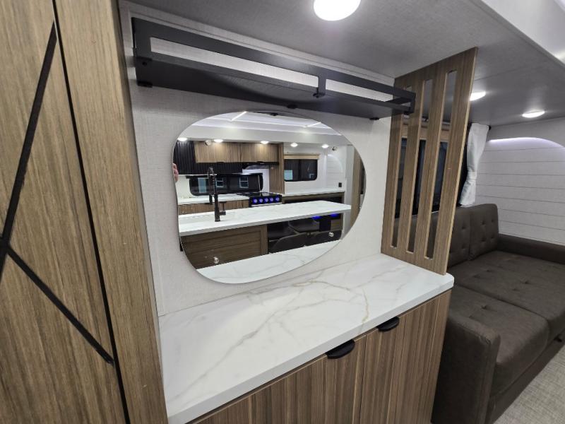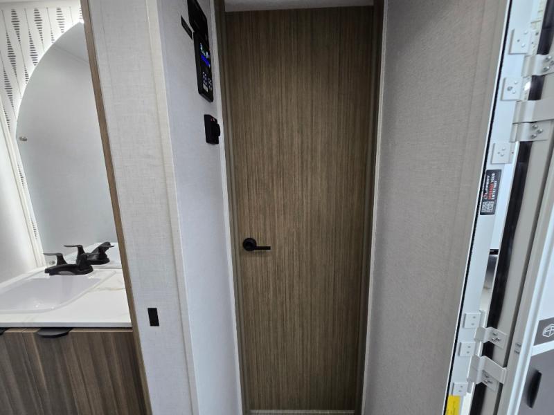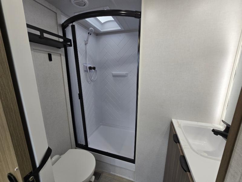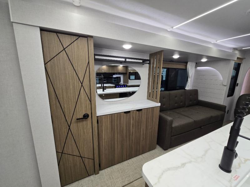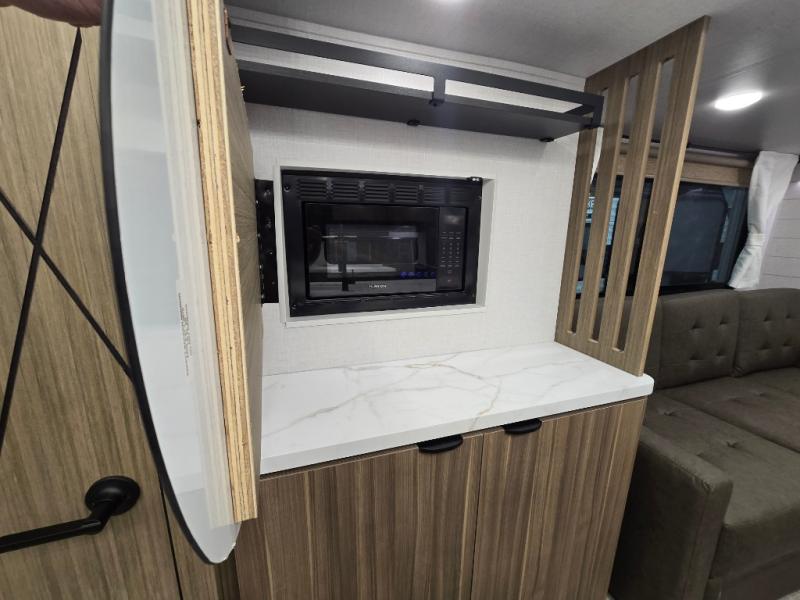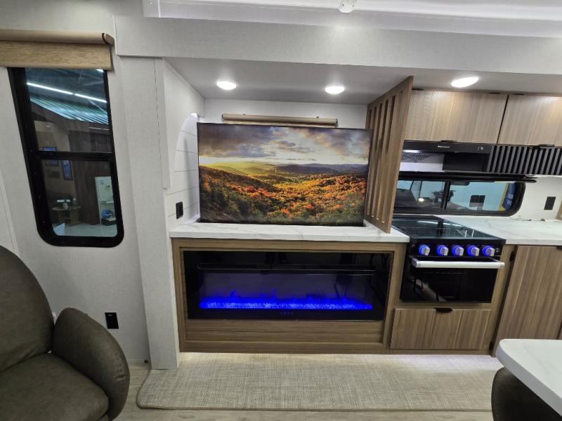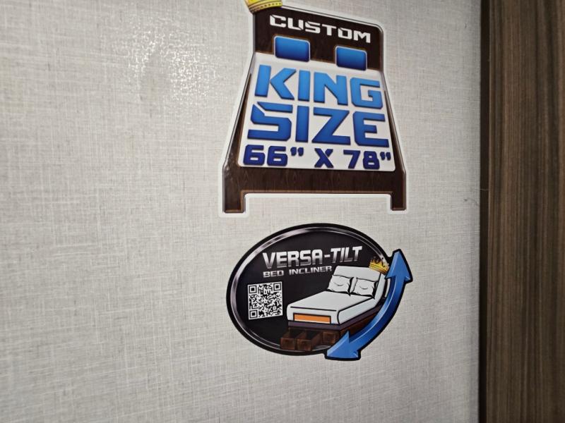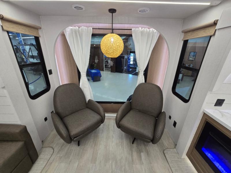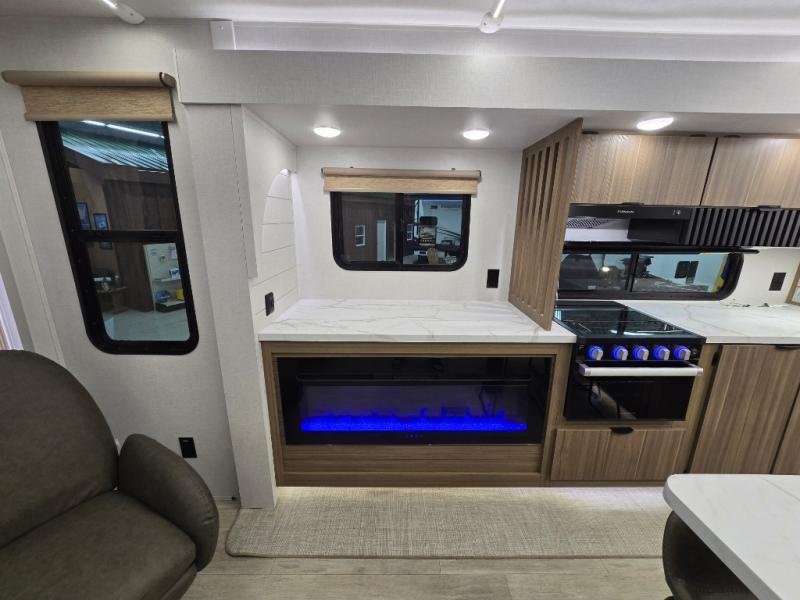 Find your zen int this spacious travel trailer for four! Once you've unloaded your gear, you can head inside to make lunch at the kitchen island with four chairs. An 80" trundle sofa provides additional seating space plus sleeping space for guests. You will love the rear custom recliners that are conveniently located next to the fireplace. The full bath is located towards the front next to the private bedroom so you can easily use the restroom at night, and you're sure to get a great night's rest on the custom king bed with Versa Tilt. This unit also includes washer and dryer prep, giving you the option to add these appliances.