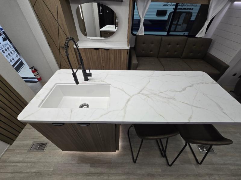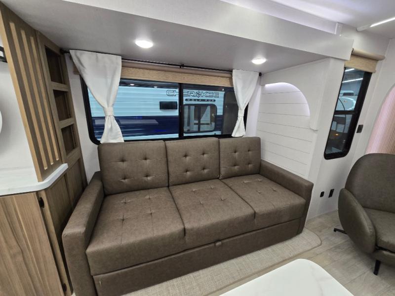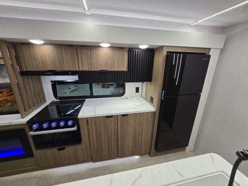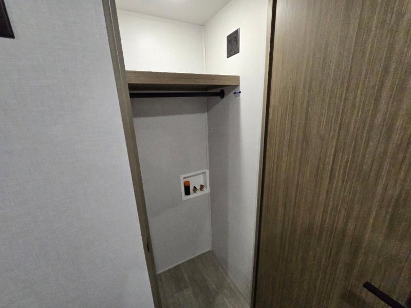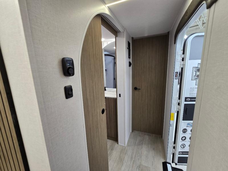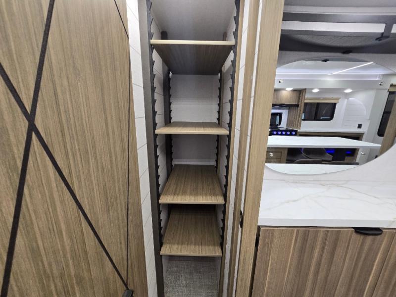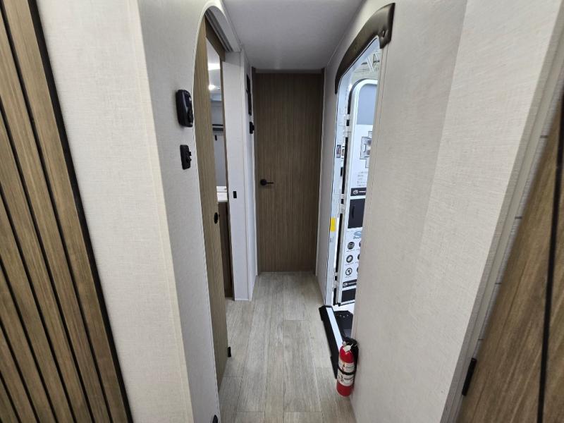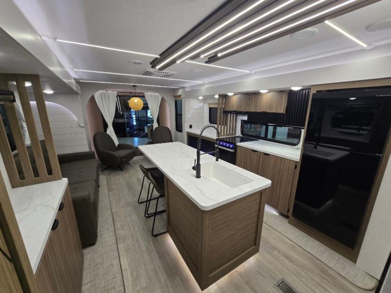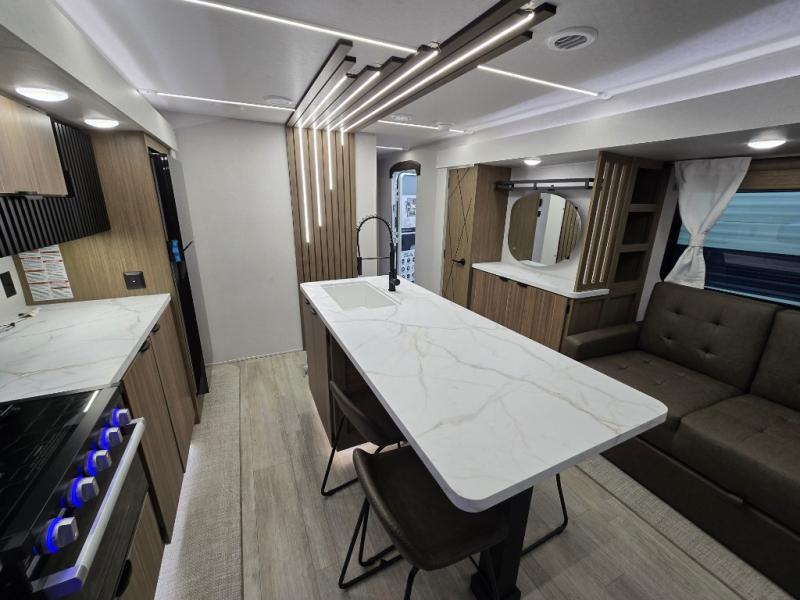 Find your zen int this spacious travel trailer for four! Once you've unloaded your gear, you can head inside to make lunch at the kitchen island with four chairs. An 80" trundle sofa provides additional seating space plus sleeping space for guests. You will love the rear custom recliners that are conveniently located next to the fireplace. The full bath is located towards the front next to the private bedroom so you can easily use the restroom at night, and you're sure to get a great night's rest on the custom king bed with Versa Tilt. This unit also includes washer and dryer prep, giving you the option to add these appliances.