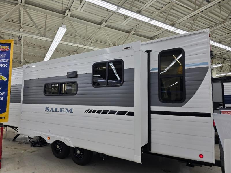 The Salem travel trailers are packed with hassle-free camping amenities and there are a variety of floorplans to choose from. The heated and enclosed Accessibelly will help protect against the elements and debris during transport, and the exterior retro/metal redesign is sure to be eye-catching! There are stylish roller shades inside, along with updated backsplash, elegant curtain rods and curtains, plus many more interior comforts! Choose a Salem travel trailer today for quality and value!