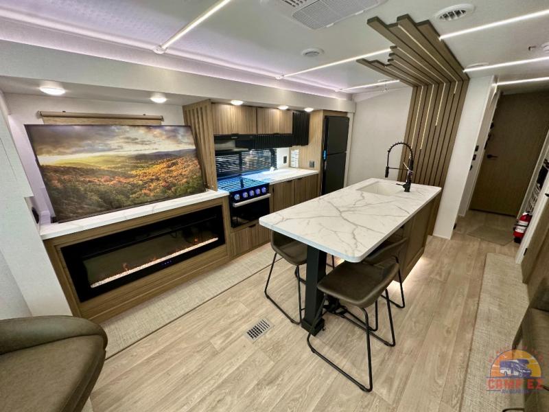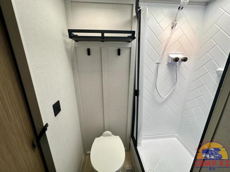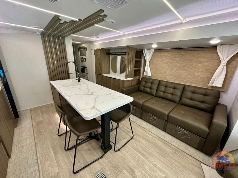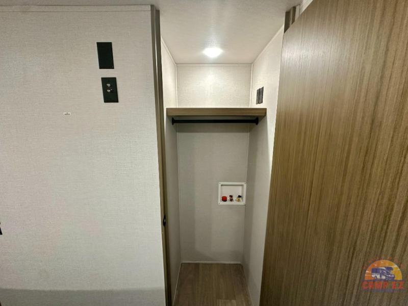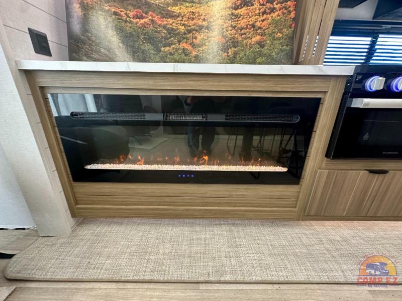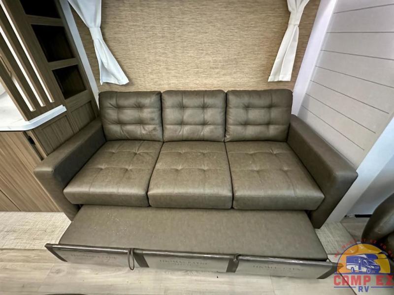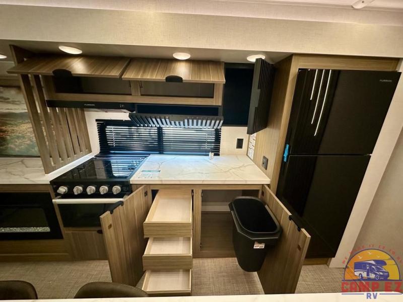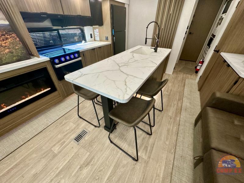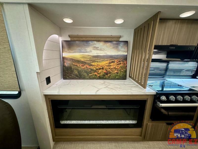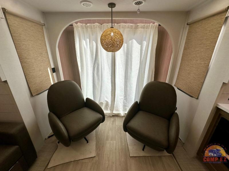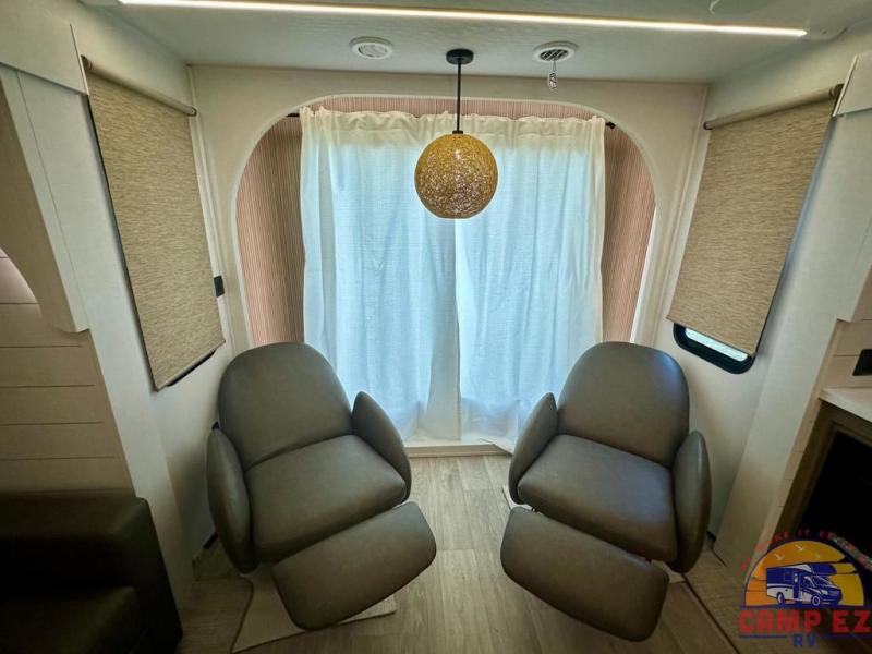 Find your zen int this spacious travel trailer for four! Once you've unloaded your gear, you can head inside to make lunch at the kitchen island with four chairs. An 80" trundle sofa provides additional seating space plus sleeping space for guests. You will love the rear custom recliners that are conveniently located next to the fireplace. The full bath is located towards the front next to the private bedroom so you can easily use the restroom at night, and you're sure to get a great night's rest on the custom king bed with Versa Tilt. This unit also includes washer and dryer prep, giving you the option to add these appliances.
