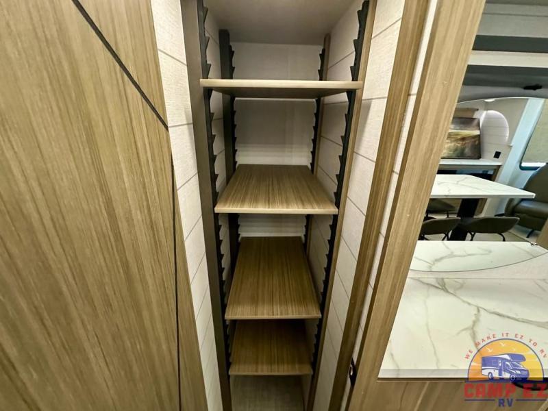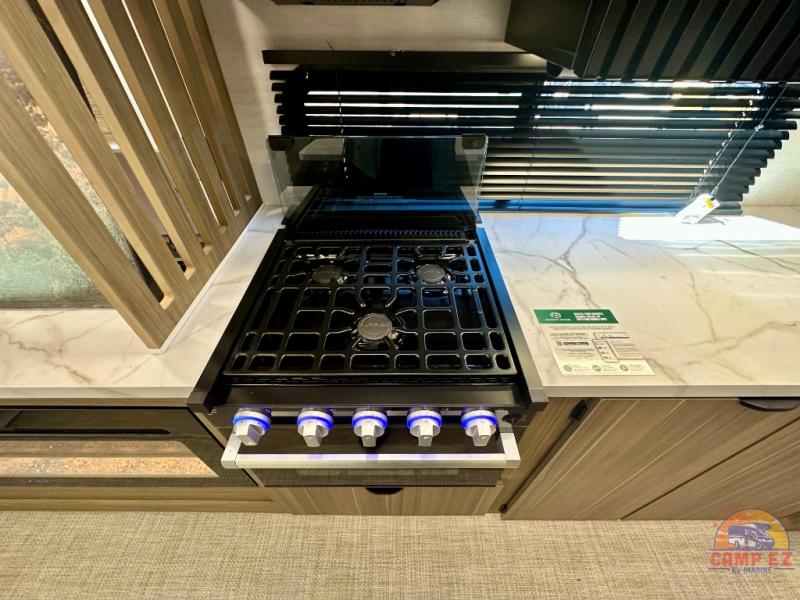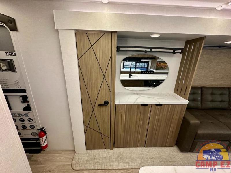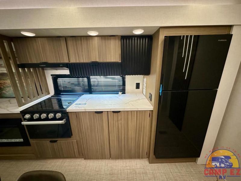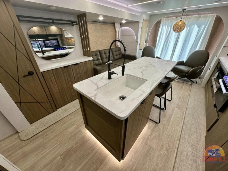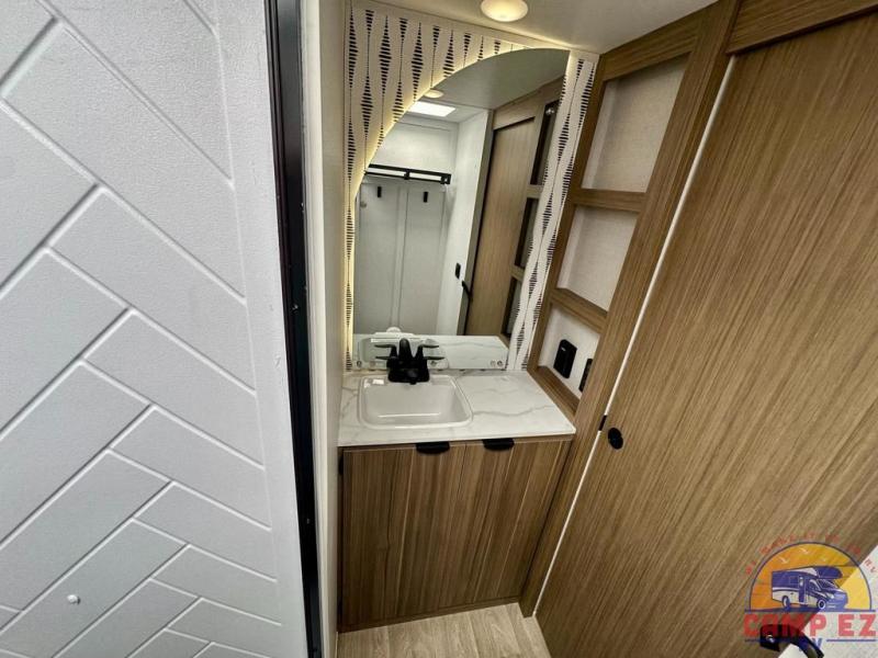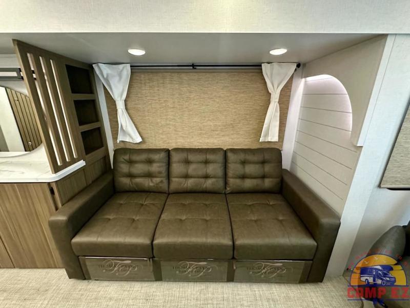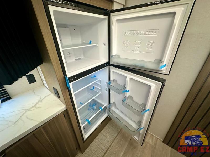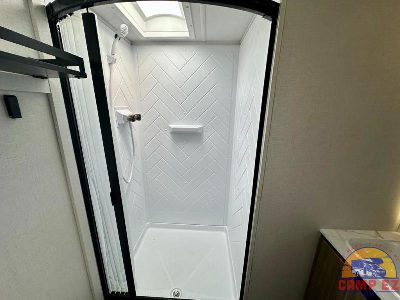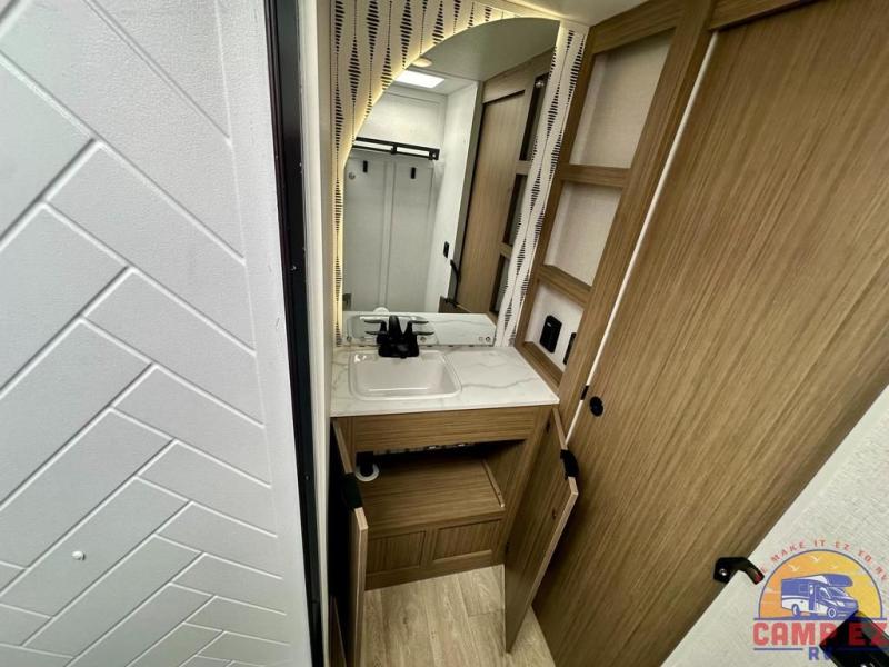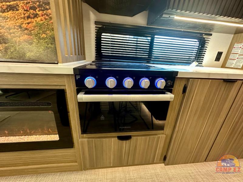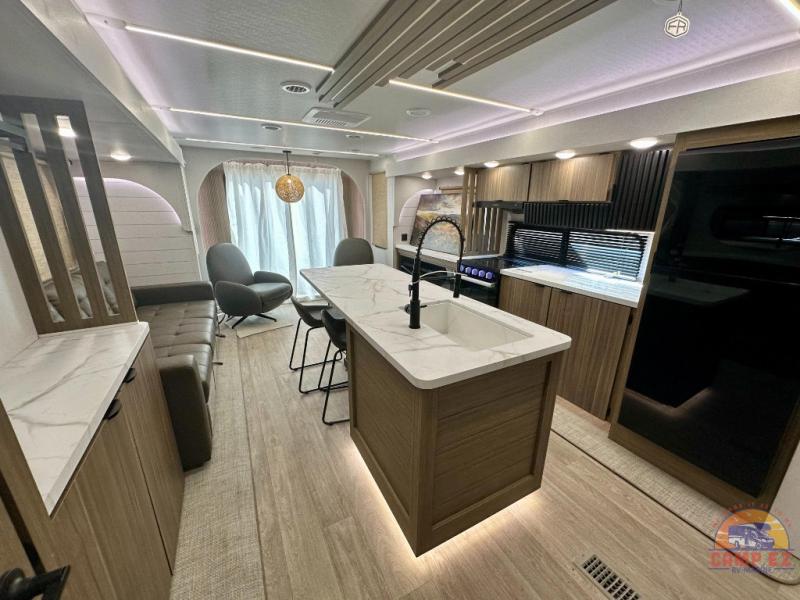 Find your zen int this spacious travel trailer for four! Once you've unloaded your gear, you can head inside to make lunch at the kitchen island with four chairs. An 80" trundle sofa provides additional seating space plus sleeping space for guests. You will love the rear custom recliners that are conveniently located next to the fireplace. The full bath is located towards the front next to the private bedroom so you can easily use the restroom at night, and you're sure to get a great night's rest on the custom king bed with Versa Tilt. This unit also includes washer and dryer prep, giving you the option to add these appliances.