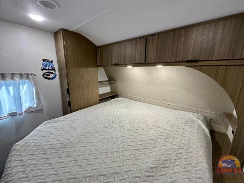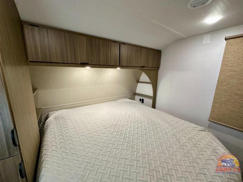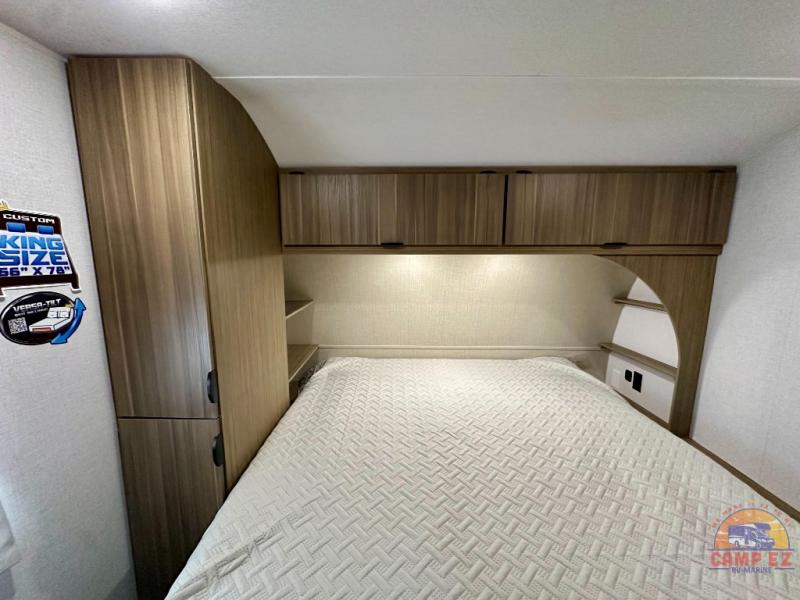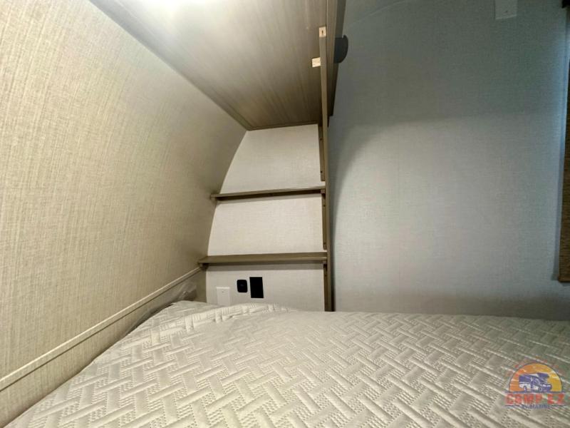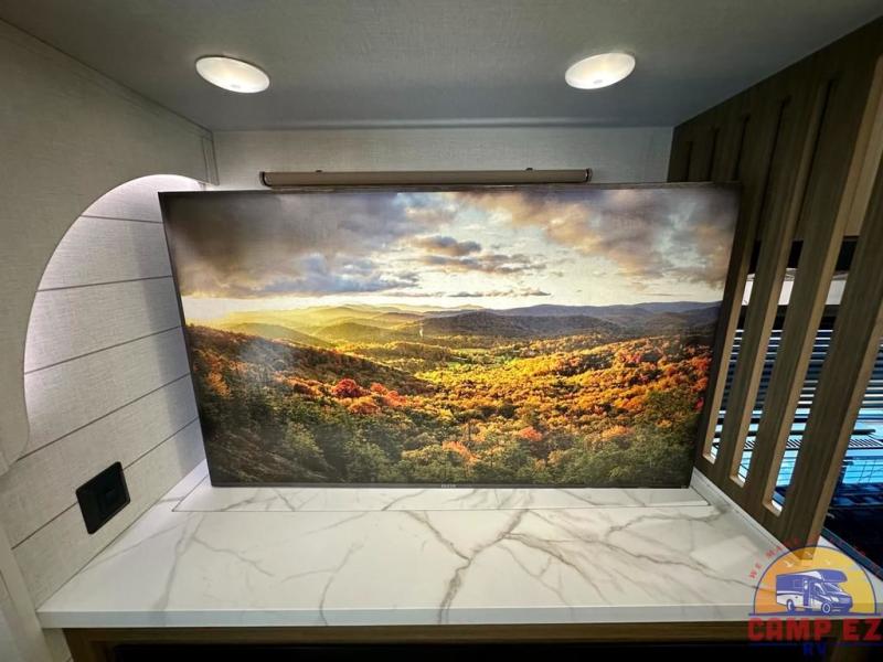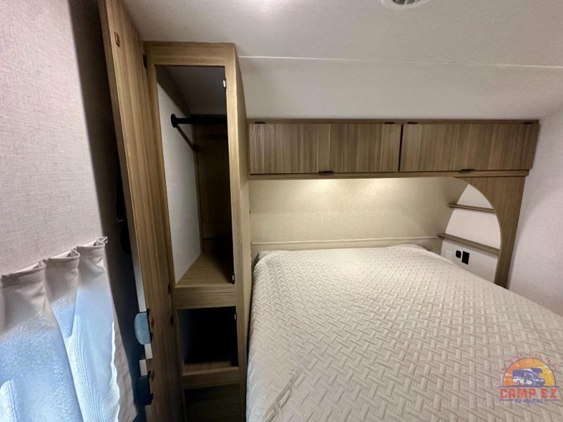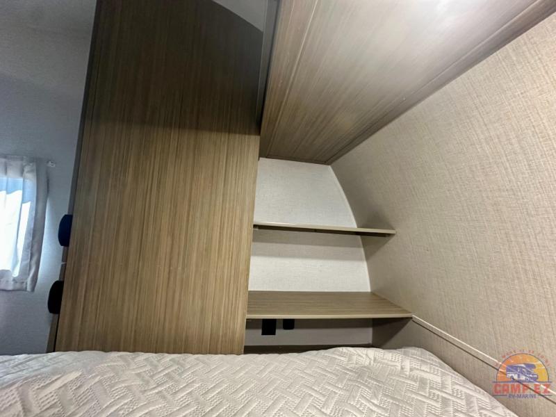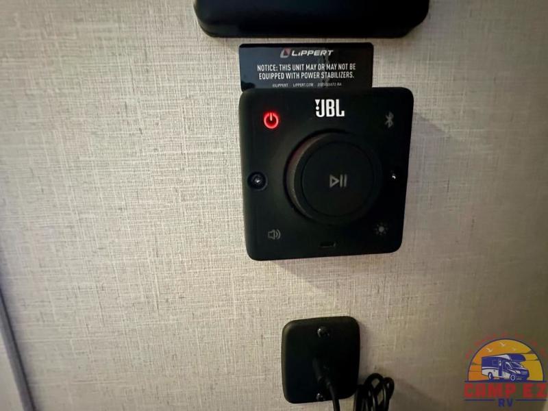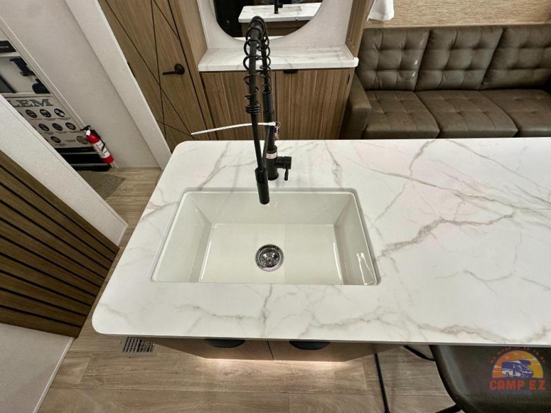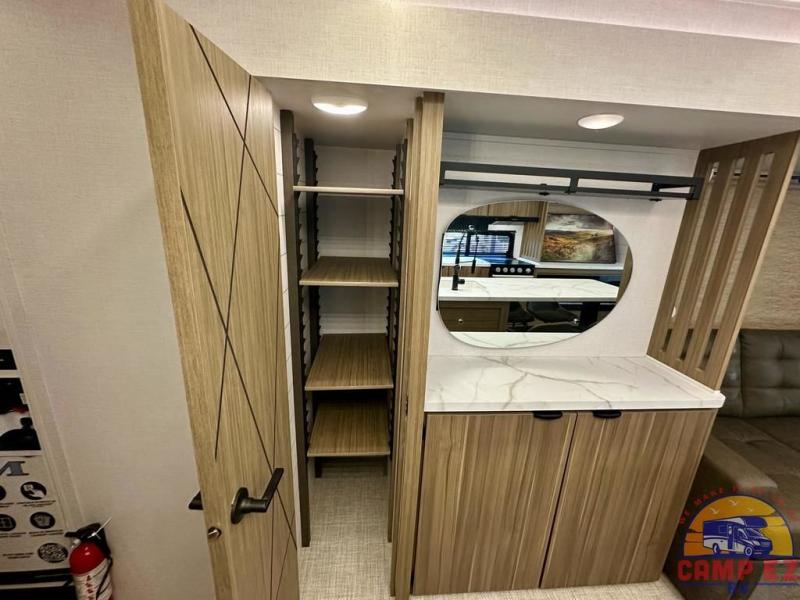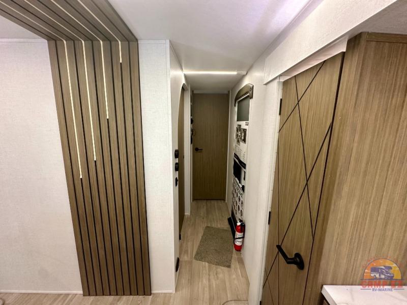 Find your zen int this spacious travel trailer for four! Once you've unloaded your gear, you can head inside to make lunch at the kitchen island with four chairs. An 80" trundle sofa provides additional seating space plus sleeping space for guests. You will love the rear custom recliners that are conveniently located next to the fireplace. The full bath is located towards the front next to the private bedroom so you can easily use the restroom at night, and you're sure to get a great night's rest on the custom king bed with Versa Tilt. This unit also includes washer and dryer prep, giving you the option to add these appliances.
