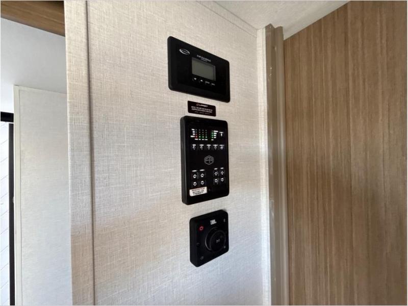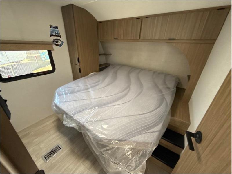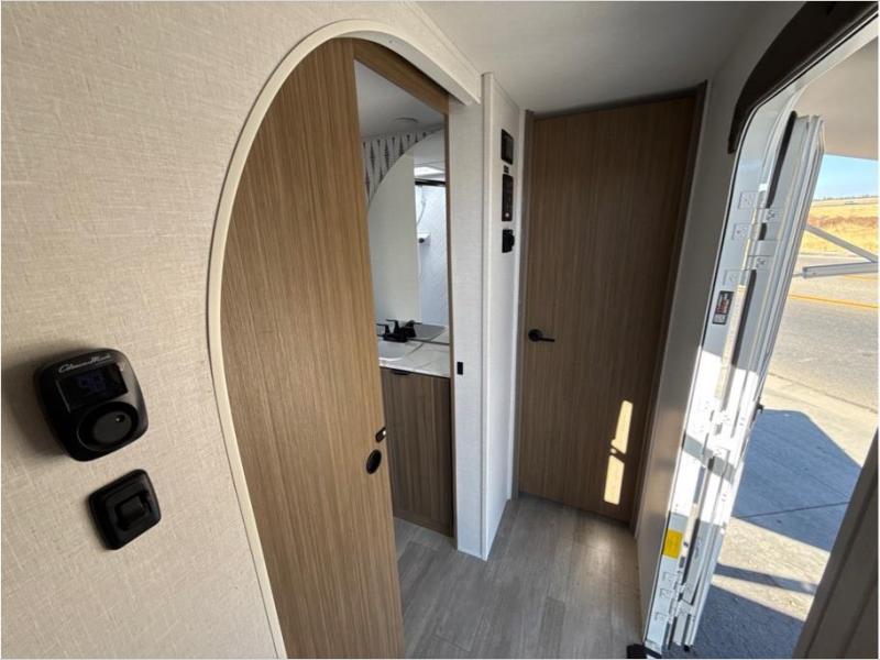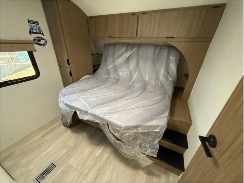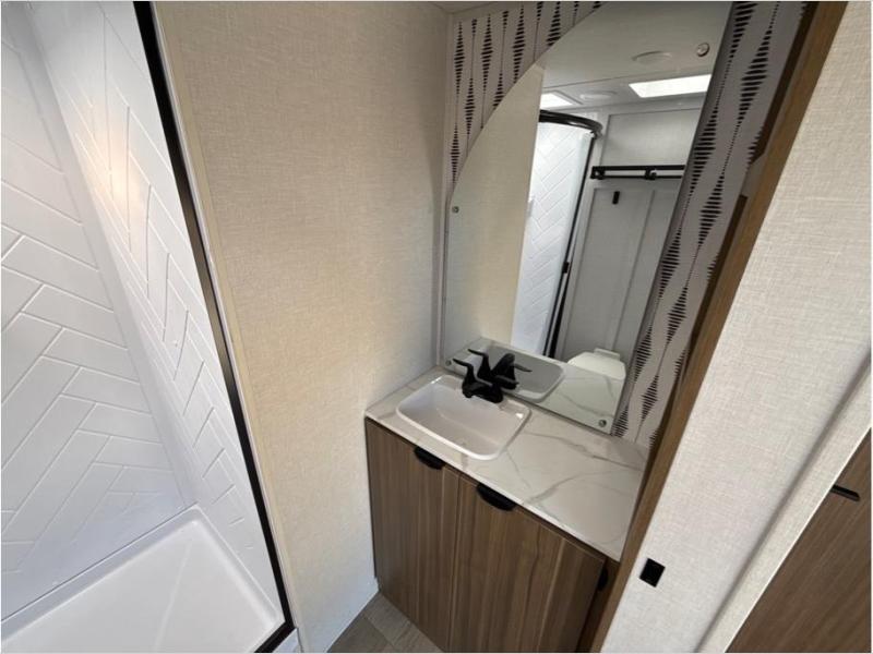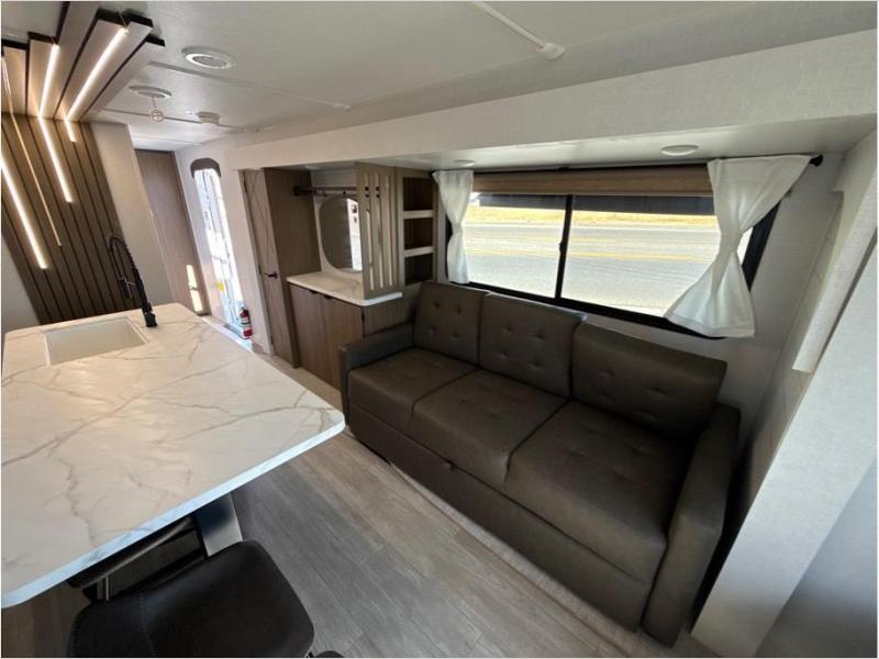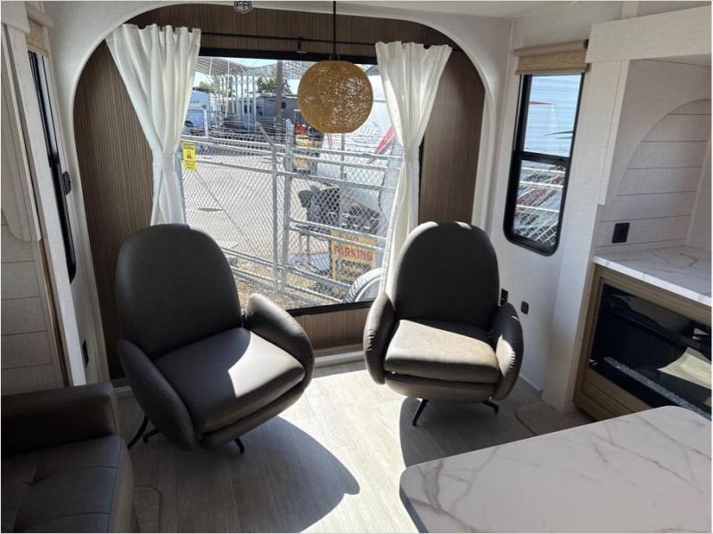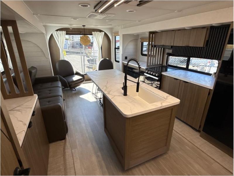 Find your zen int this spacious travel trailer for four! Once you've unloaded your gear, you can head inside to make lunch at the kitchen island with four chairs. An 80" trundle sofa provides additional seating space plus sleeping space for guests. You will love the rear custom recliners that are conveniently located next to the fireplace. The full bath is located towards the front next to the private bedroom so you can easily use the restroom at night, and you're sure to get a great night's rest on the custom king bed with Versa Tilt. This unit also includes washer and dryer prep, giving you the option to add these appliances.