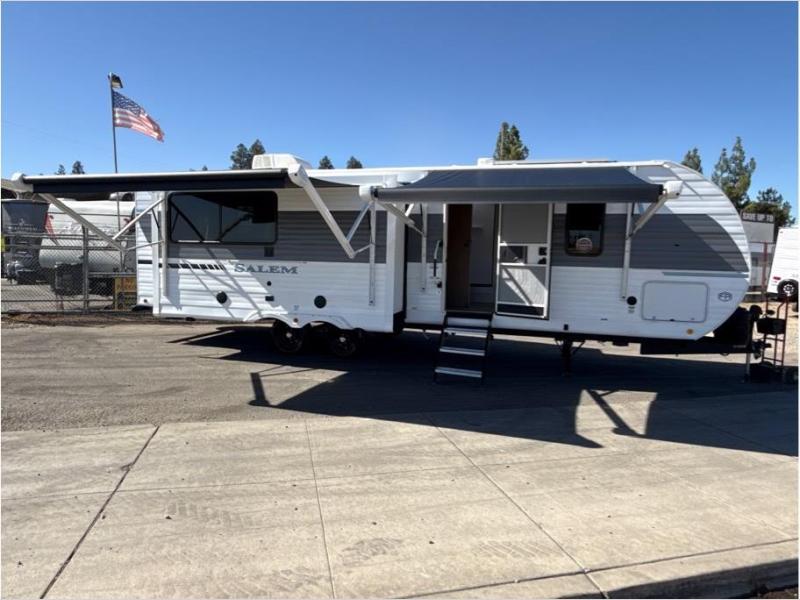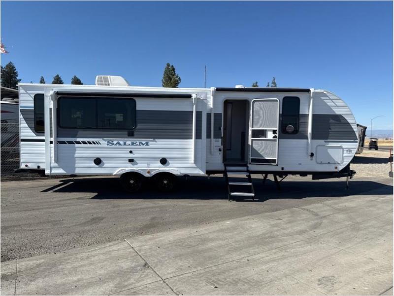 The Salem travel trailers are packed with hassle-free camping amenities and there are a variety of floorplans to choose from. The heated and enclosed Accessibelly will help protect against the elements and debris during transport, and the exterior retro/metal redesign is sure to be eye-catching! There are stylish roller shades inside, along with updated backsplash, elegant curtain rods and curtains, plus many more interior comforts! Choose a Salem travel trailer today for quality and value!