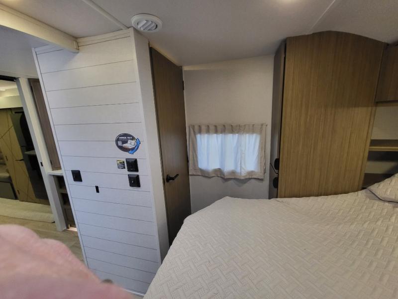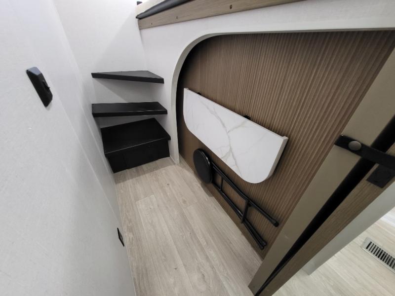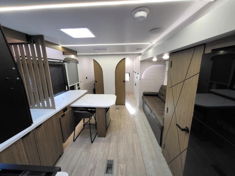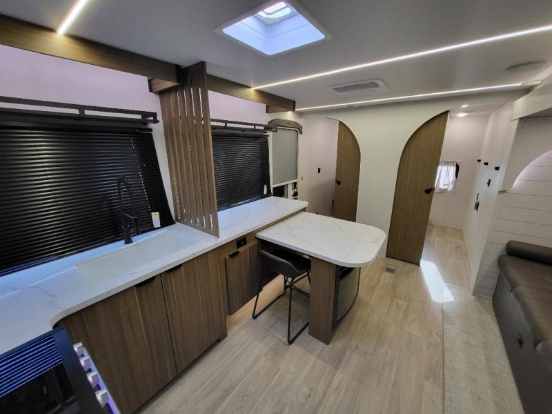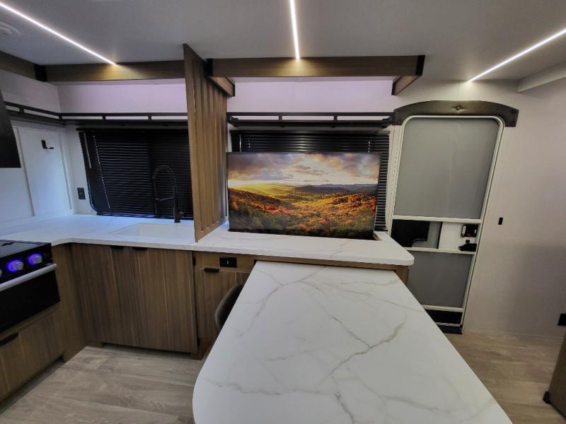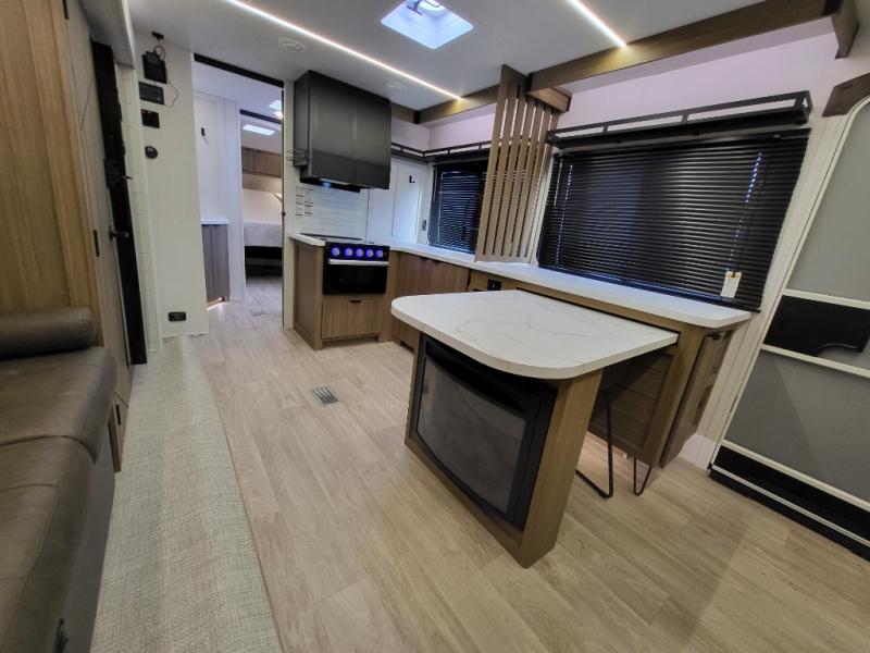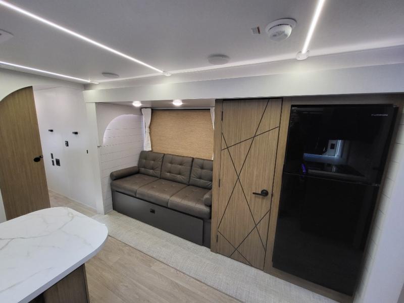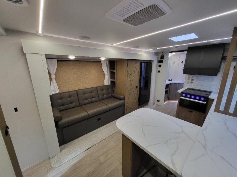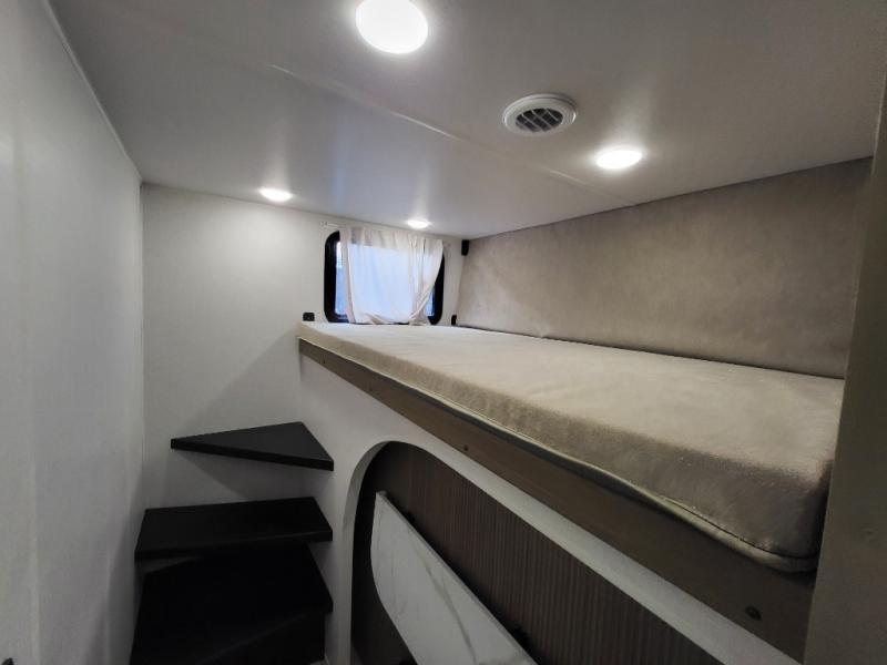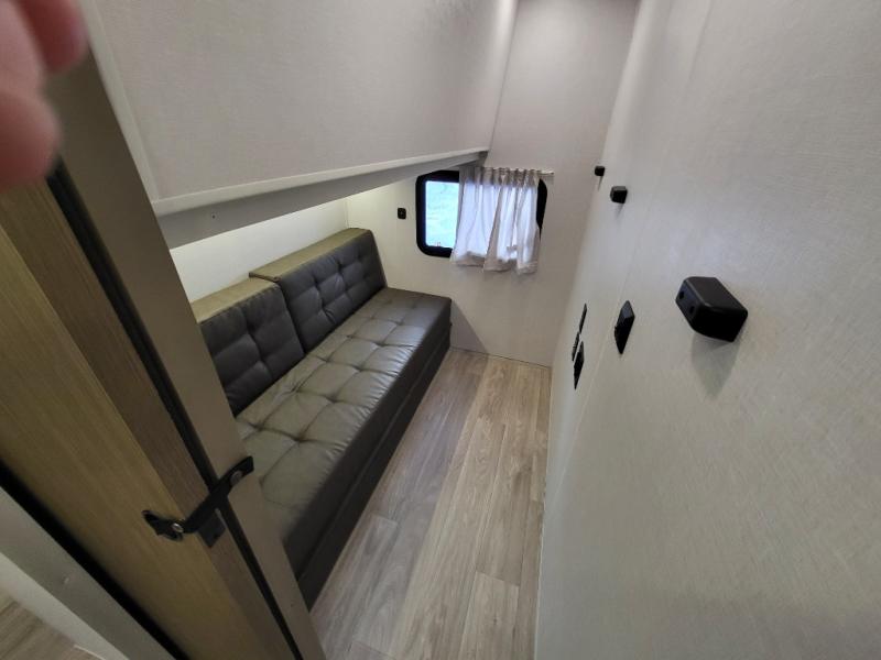 Everyone will enjoy having their own space in this travel trailer thanks to the front master bedroom and the rear bunkhouse. The bunkhouse includes a wall to separate the Versa bunk and fold-down desk on one side and a Versa sofa on the other, perfect for older kids or guests. You'll have the custom king bed with Versa Tilt all to yourselves, and the walk-thru bath will be easily accessible for everyone. In the combined kitchen and living room, a jackknife sofa slide sits across from the fireplace/entertainment center, and there is a pull-out table here so you can dine together.