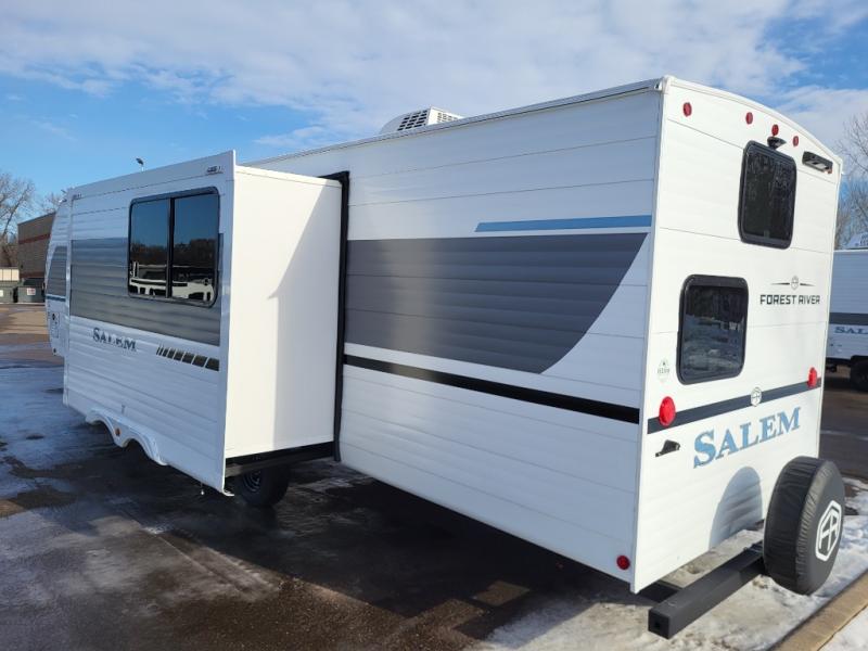 The Salem travel trailers are packed with hassle-free camping amenities and there are a variety of floorplans to choose from. The heated and enclosed Accessibelly will help protect against the elements and debris during transport, and the exterior retro/metal redesign is sure to be eye-catching! There are stylish roller shades inside, along with updated backsplash, elegant curtain rods and curtains, plus many more interior comforts! Choose a Salem travel trailer today for quality and value!