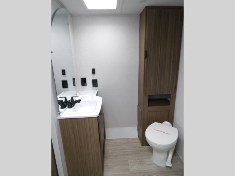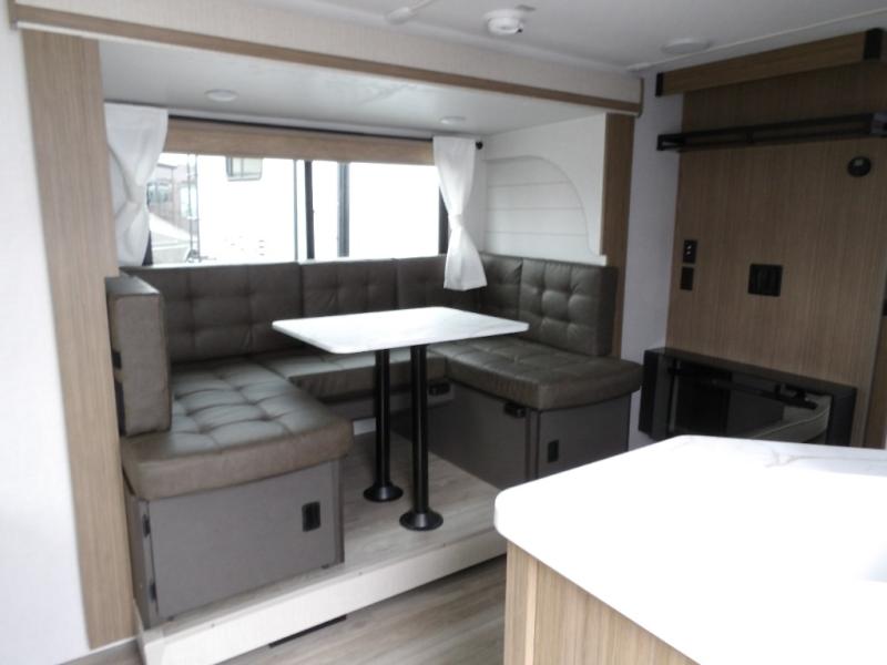 This travel trailer is packed full of features but is still lightweight coming in at just over 5,000 lbs.! You will feel right at home in the front master bedroom with a custom king bed with Versa Tilt and a closet to keep your clothes tidy. The walk-through bathroom has a walk-in shower to easily get ready each day. The U-shaped dinette slide has a panoramic window for you to enjoy your beautiful scenery as you eat dinner, and there is a fireplace at the entertainment center for a relaxing evening indoors. There is a pass-through storage area to store your outdoor camping gear, and a 16' awning will provide shade as you're visiting outdoors.