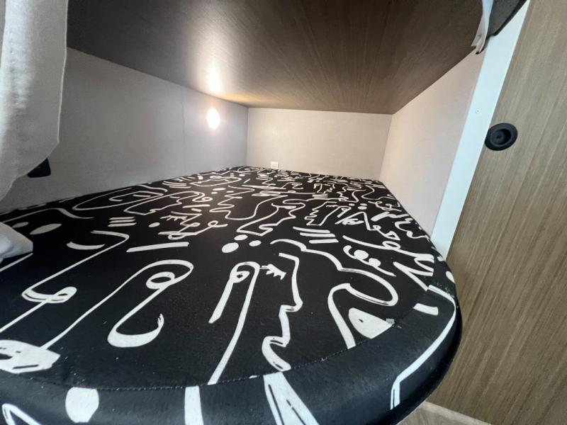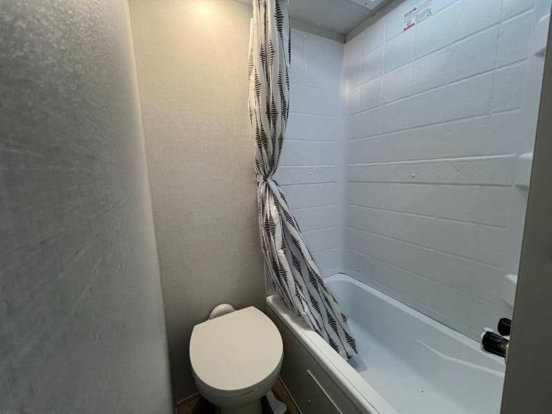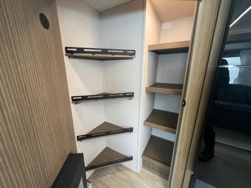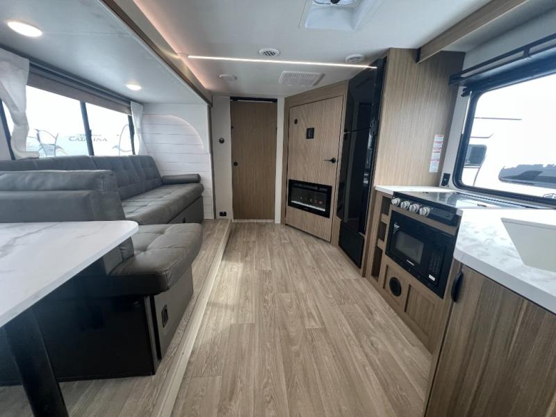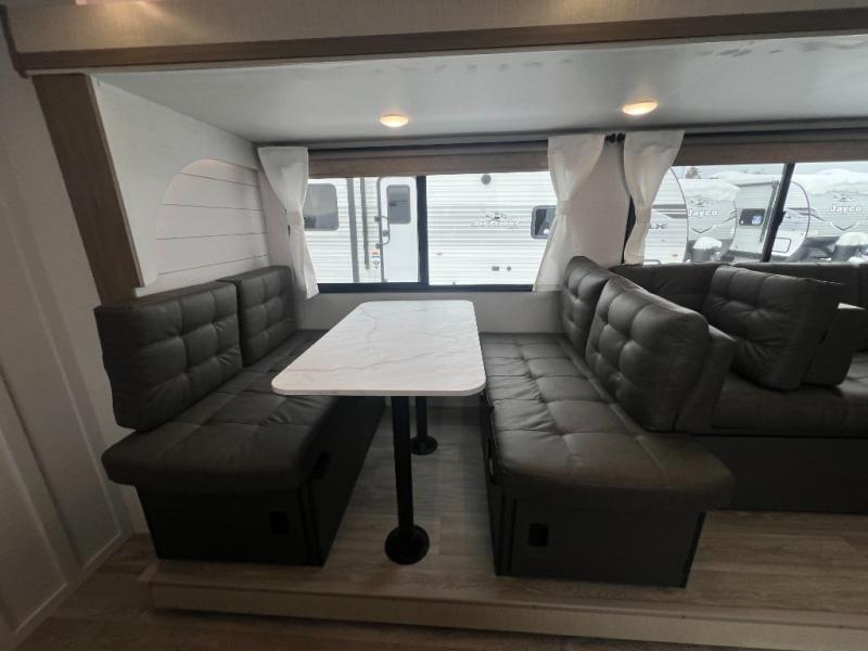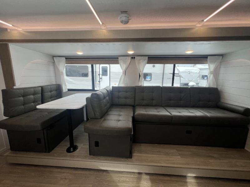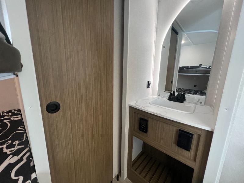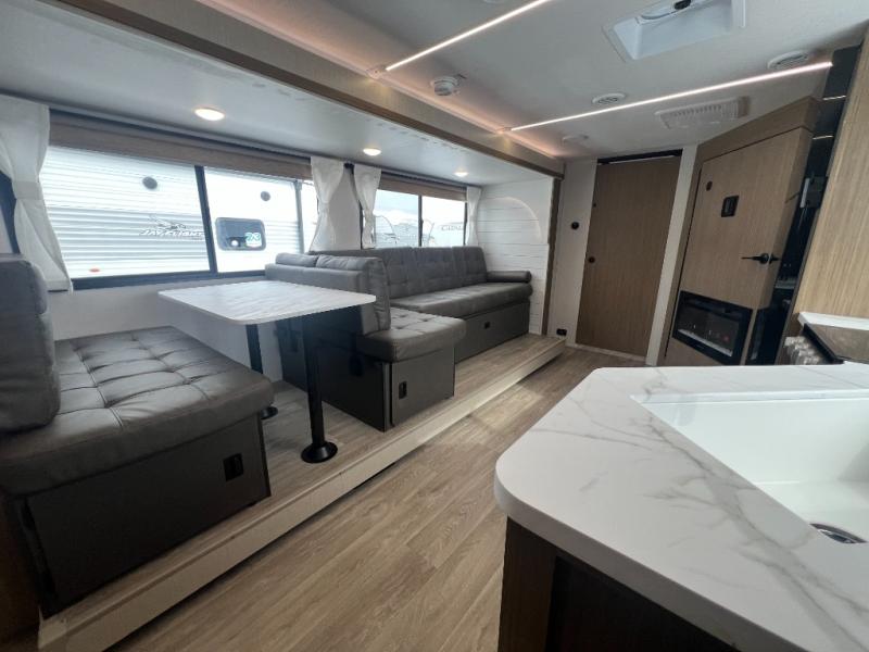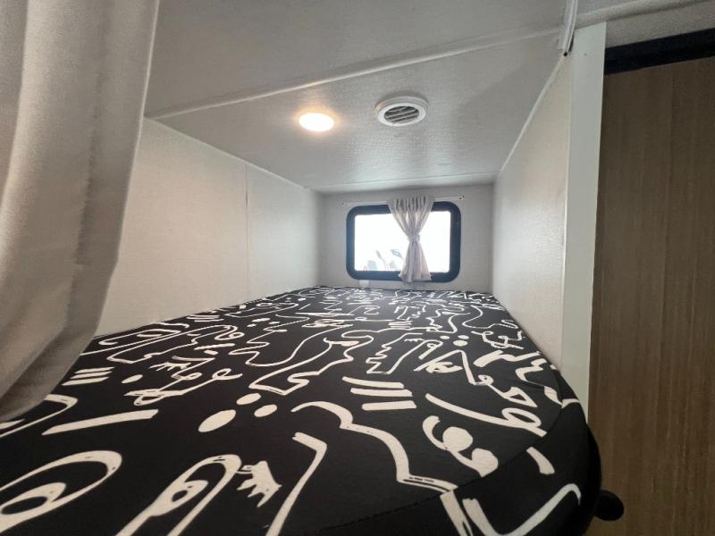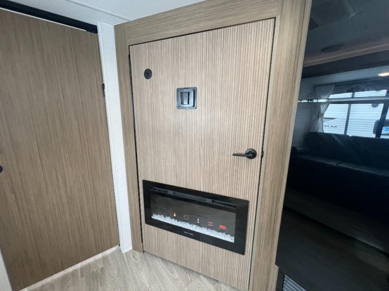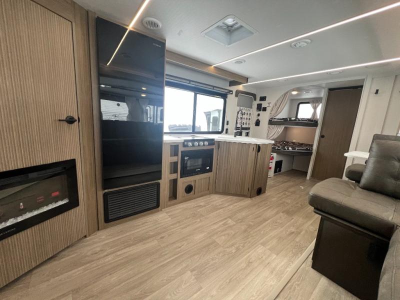 You're sure to make camping memories in this spacious travel trailer! You can easily sleep eight people each night thanks to the double-size bunks, the custom king bed with Versa Tilt in the front bedroom plus the Versa-Lounge within the large slide out! The cooktop and microwave oven will let you make meals each day, and you'll appreciate the hidden pantry with shelves behind the fireplace. There is also a booth dinette where you can dine together or play a game of cards after dinner is cleaned up, or you may just find yourselves outdoors under the 18' awning with 4K blade lighting. And don't overlook the full bath, complete with a tub/shower that will make bath time easier if you have little ones.