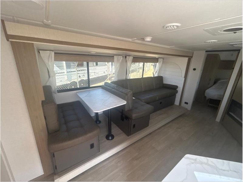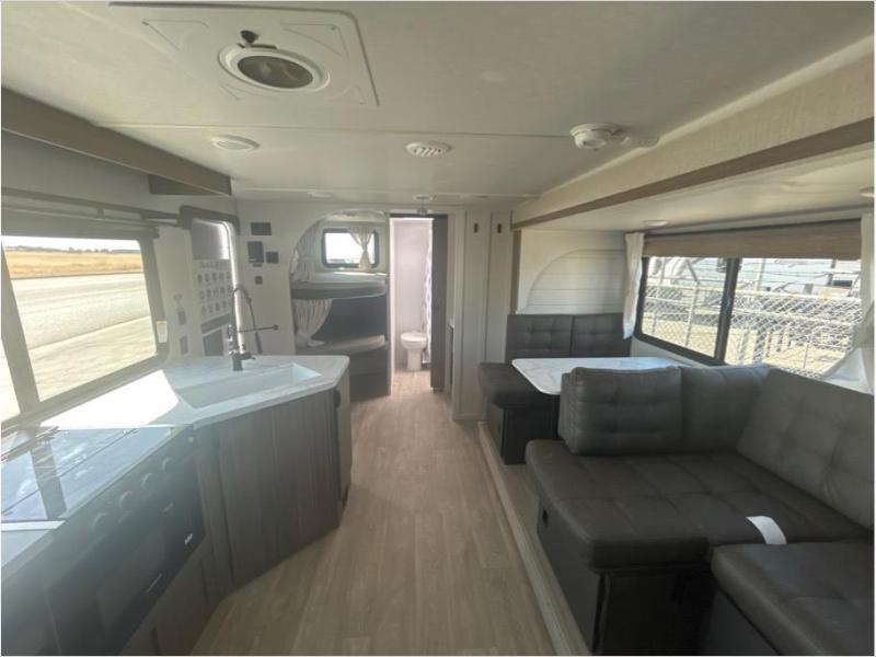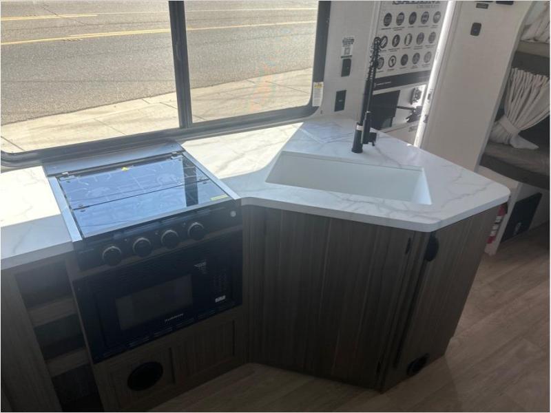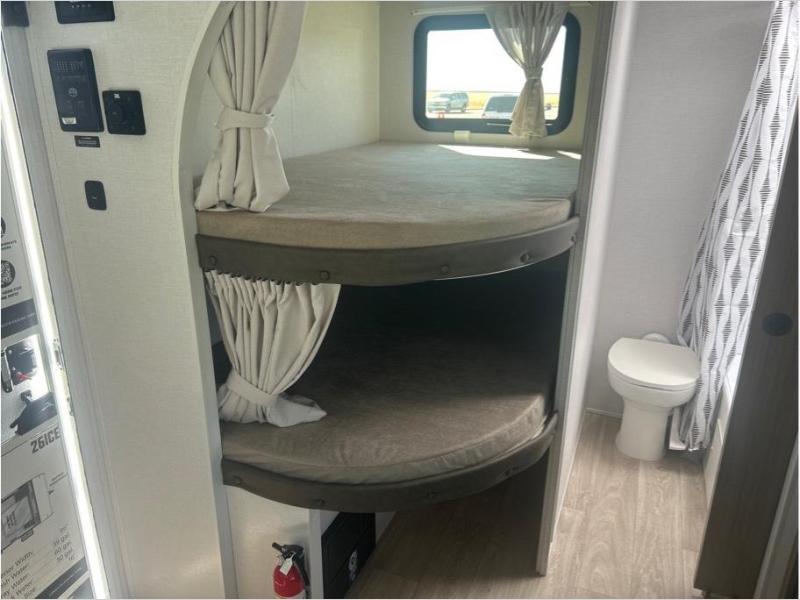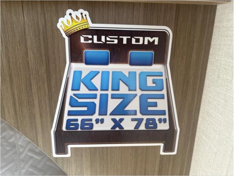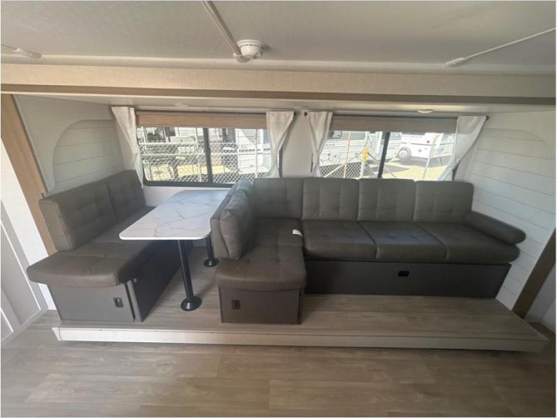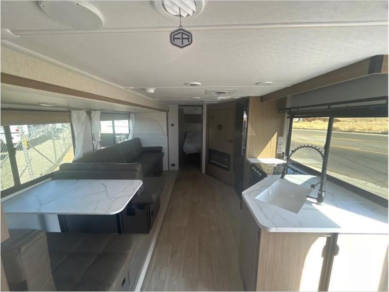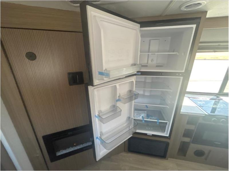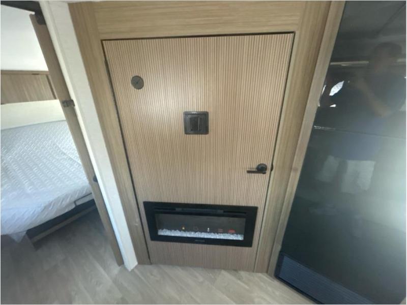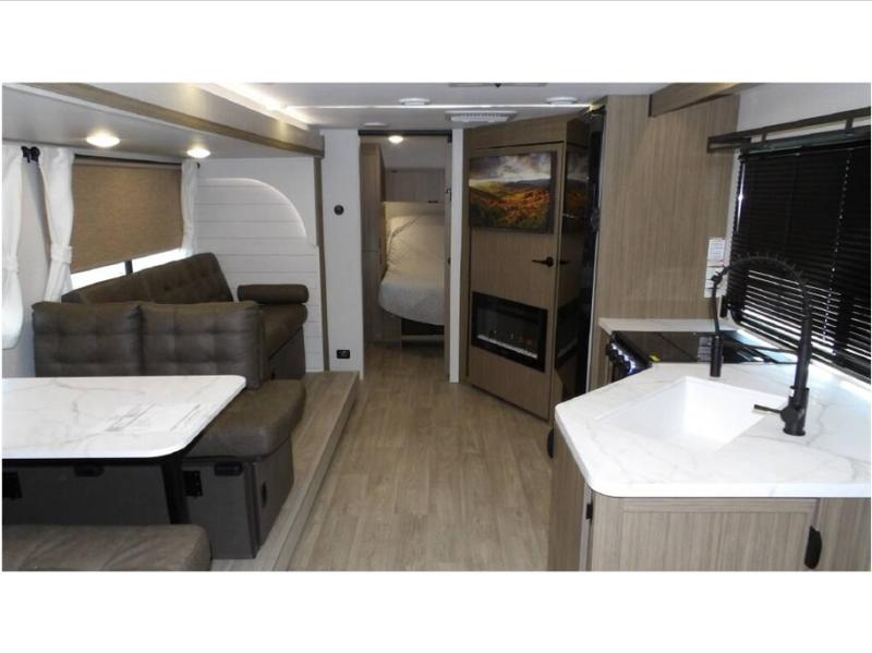 You're sure to make camping memories in this spacious travel trailer! You can easily sleep eight people each night thanks to the double-size bunks, the custom king bed with Versa Tilt in the front bedroom plus the Versa-Lounge within the large slide out! The cooktop and microwave oven will let you make meals each day, and you'll appreciate the hidden pantry with shelves behind the fireplace. There is also a booth dinette where you can dine together or play a game of cards after dinner is cleaned up, or you may just find yourselves outdoors under the 18' awning with 4K blade lighting. And don't overlook the full bath, complete with a tub/shower that will make bath time easier if you have little ones.