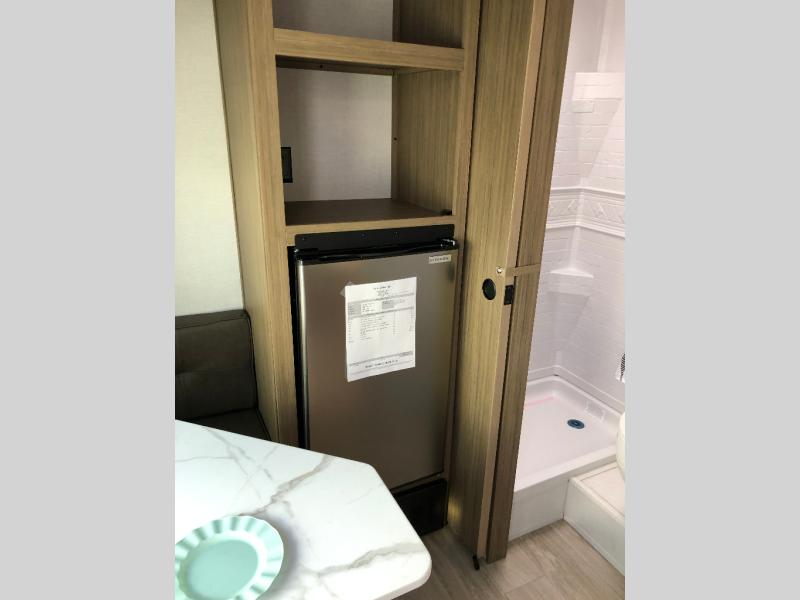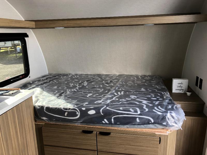 This lightweight travel trailer has everything you need to enjoy camping trips! There is a front east to west custom king bed with storage at the foot of the bed and overhead for your valuables. A private bath includes a toilet and walk-in shower so you can easily get ready each day, and you can prepare your meals on the two-burner cooktop when you get hungry. The booth dinette will provide dining space, along with sleeping space for one to two little ones. Don't let this trailer get away!