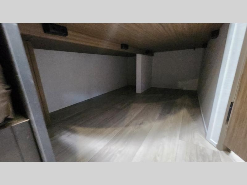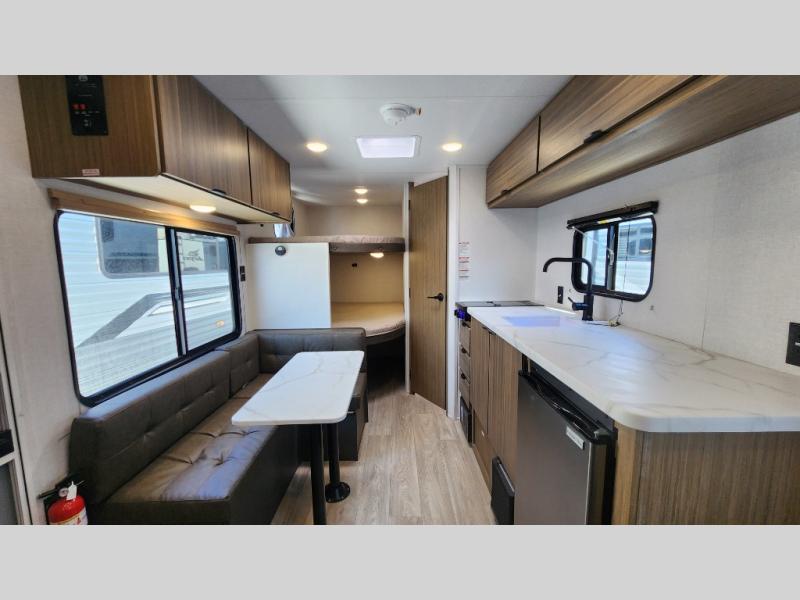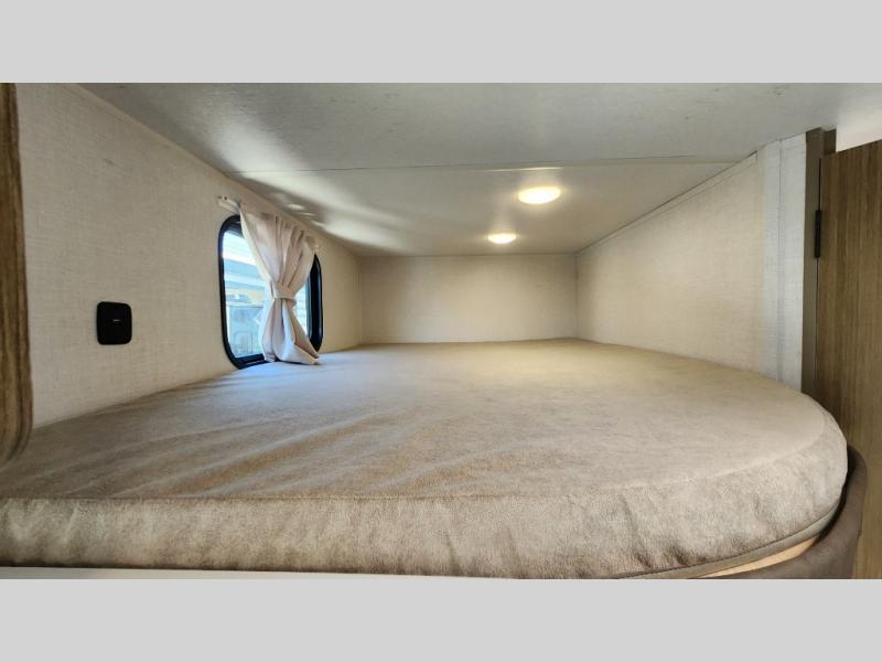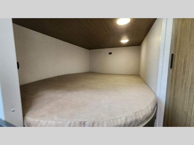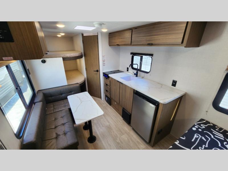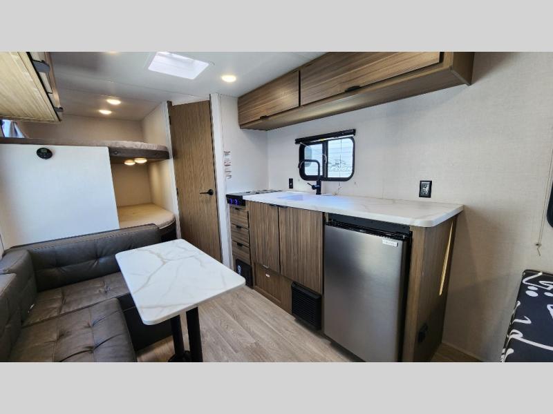 The double-size bunks with storage will be a big selling point in this travel trailer! While your guests take the bunks, you can have the front queen bed all to yourselves, and there is a wardrobe to keep your things organized. A two burner cooktop and microwave will let you make meals each day, and you can dine at the open lounge with a table.