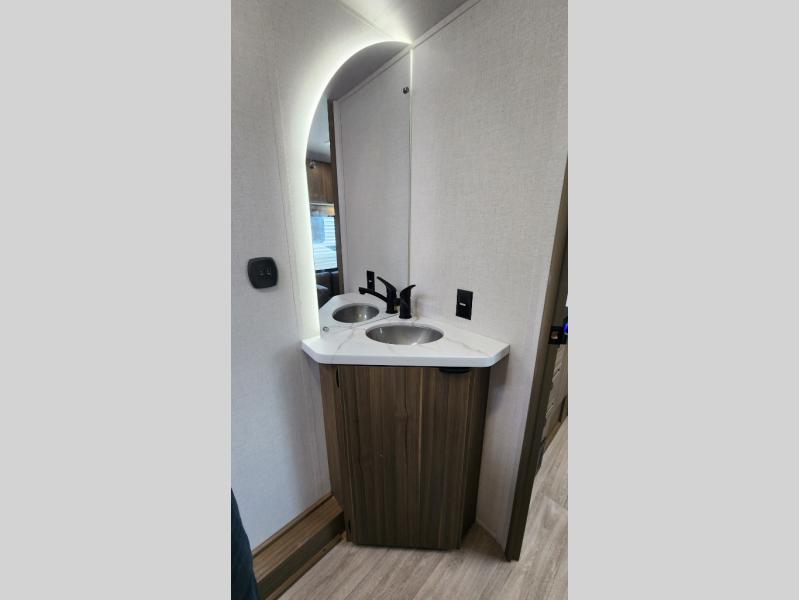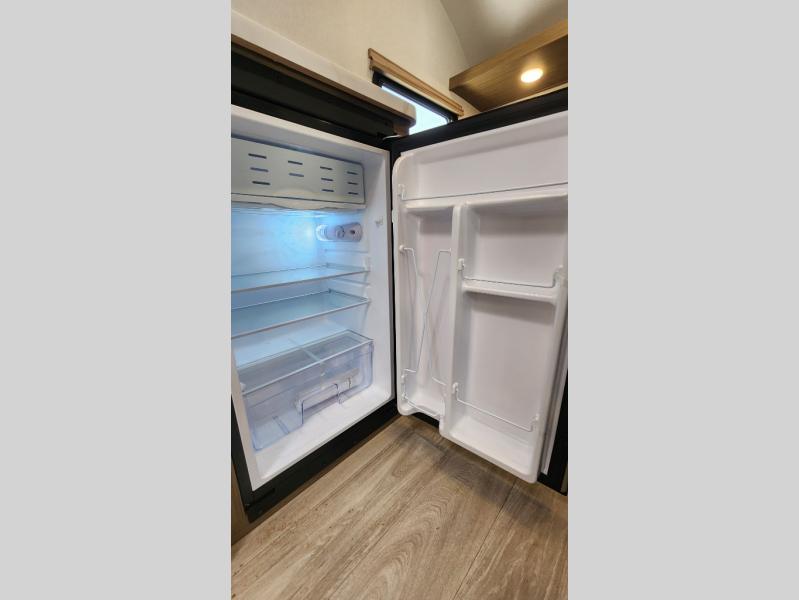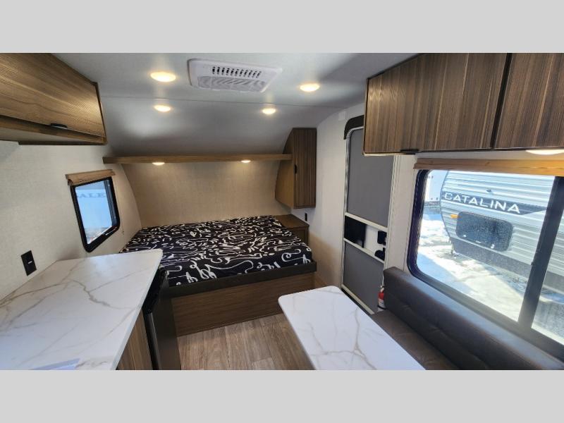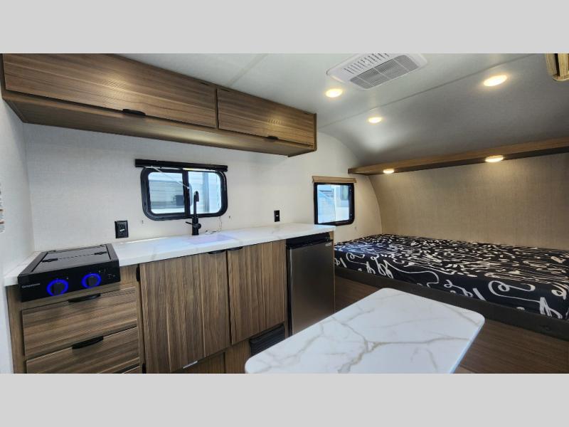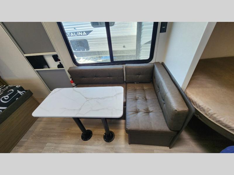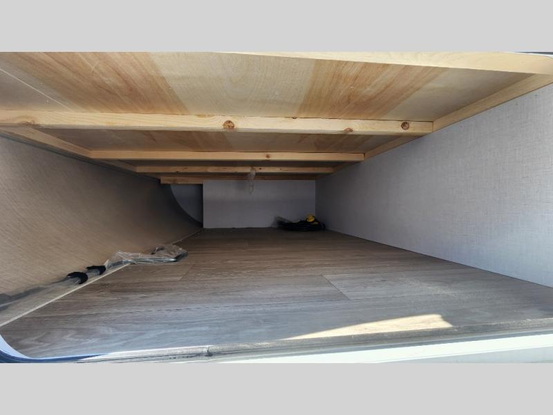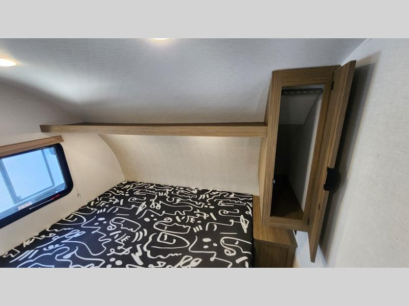 The double-size bunks with storage will be a big selling point in this travel trailer! While your guests take the bunks, you can have the front queen bed all to yourselves, and there is a wardrobe to keep your things organized. A two burner cooktop and microwave will let you make meals each day, and you can dine at the open lounge with a table.