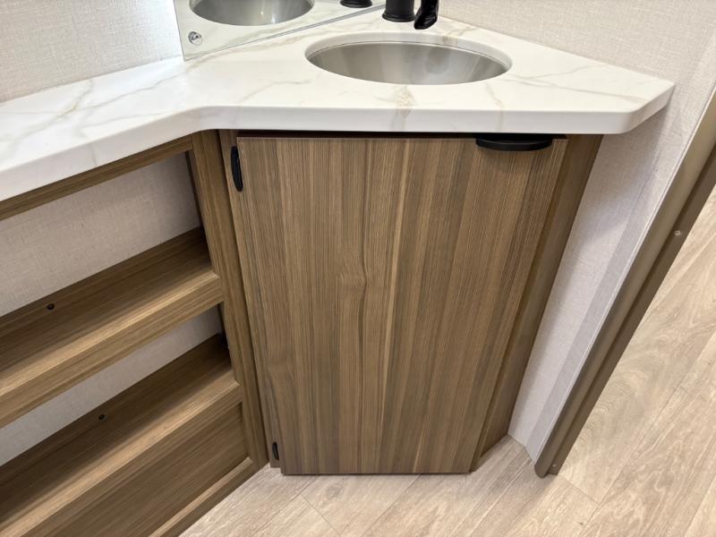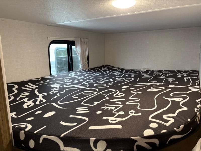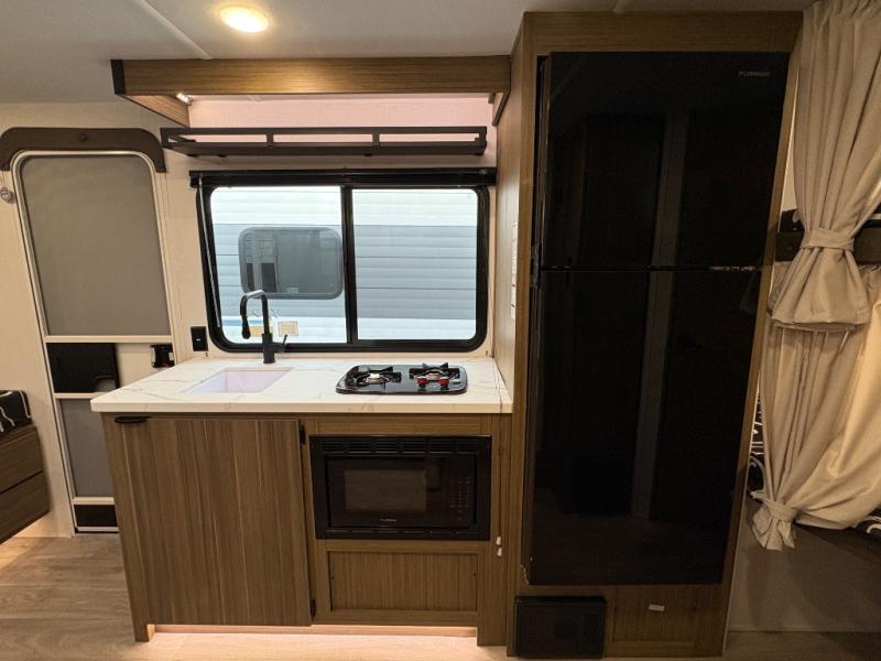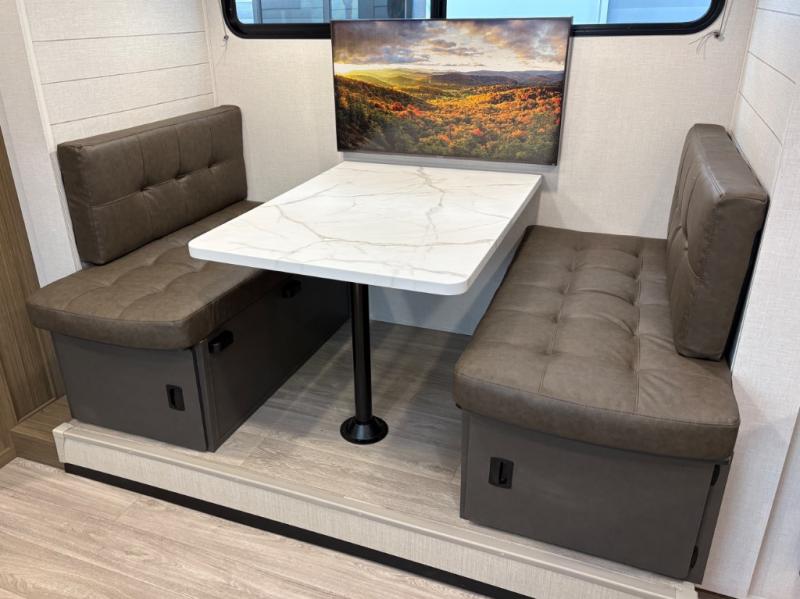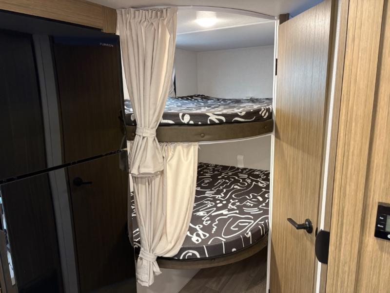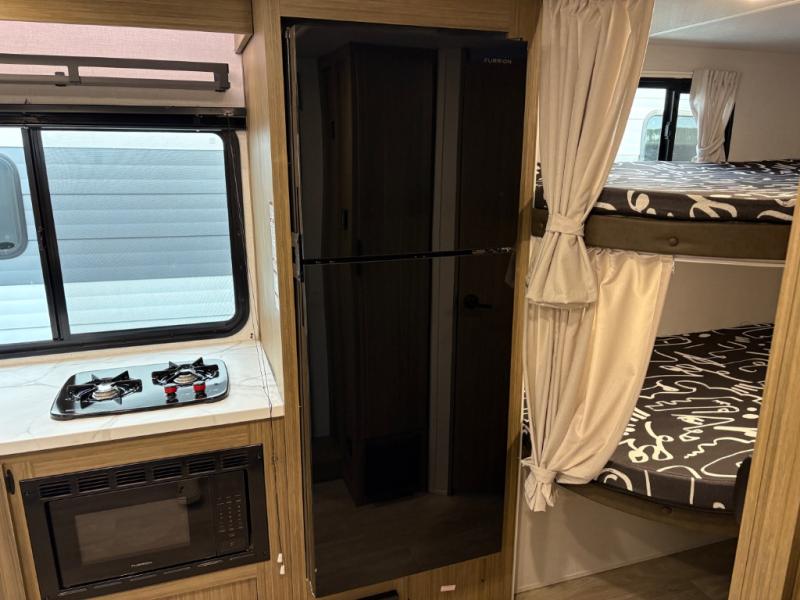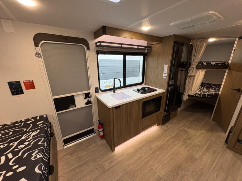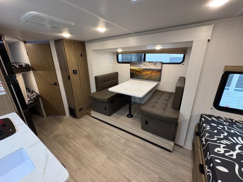 It will be so easy to enjoy time spent in this travel trailer for seven. The front queen bed provides a great night's rest, and there is an overhead cabinet to keep your things organized. Your guests or little ones can claim the double-size bunks for themselves, and there is a full bath adjacent to the bunks for easy nighttime use. A two-burner cooktop in the kitchen will let you make meals for your crew, and a refrigerator keeps leftovers fresh. You can dine at the booth dinette within the slide out or take your plate outdoors to sit under the 15' power awning.